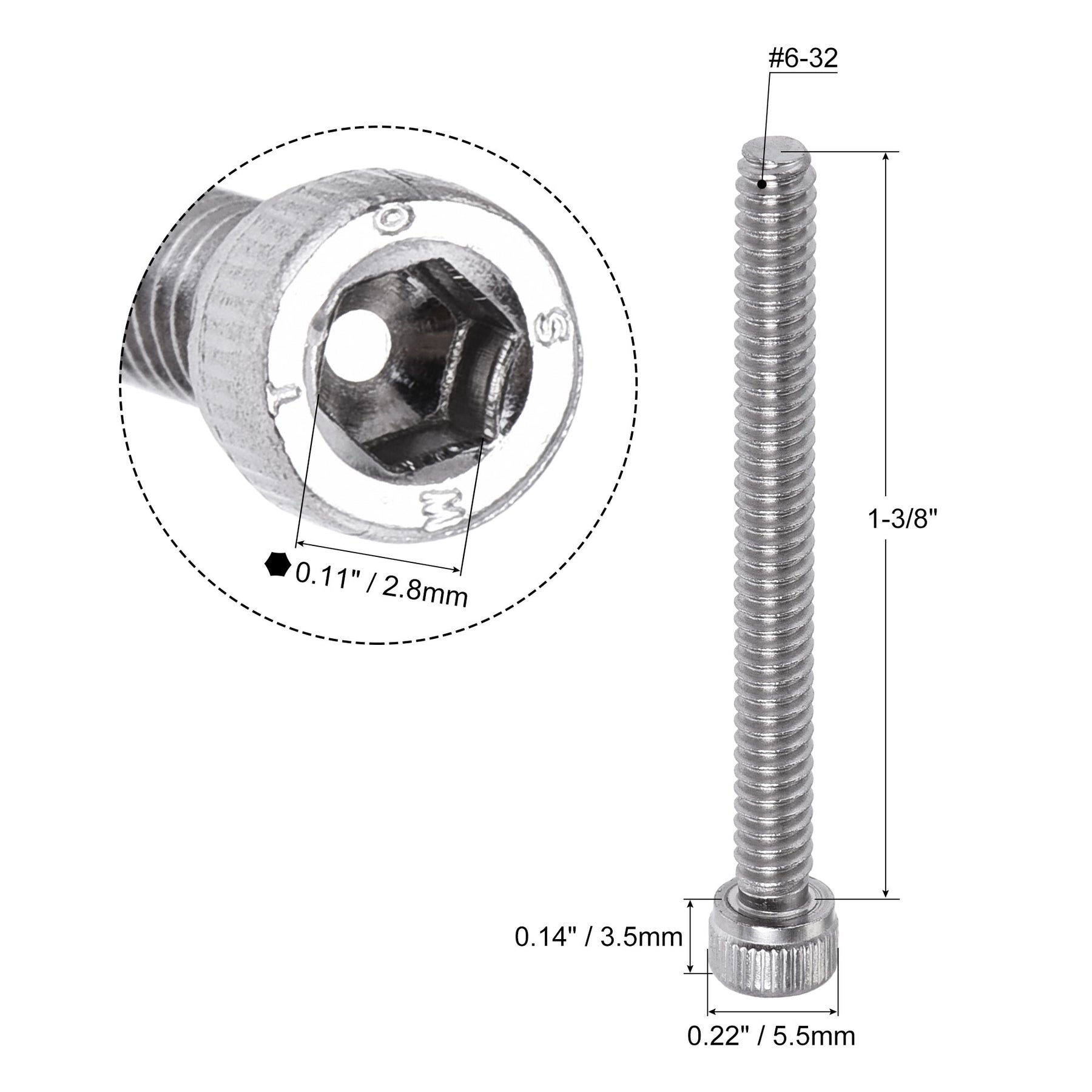 Specification: Product Name: Hex Socket Head Bolt Color: Silver Tone Material: 304 Stainless Steel Surface Treatment: Polished Processing Technology: Cold Forging+Thread Rolling Thread Diameter: #6-32 Screw Length: 1-3/8" Head Size: 5.5 x 3.5mm / 0.22" x 0.14"(D*H) Hex Socket Head Width: 2.8mm / 0.11"