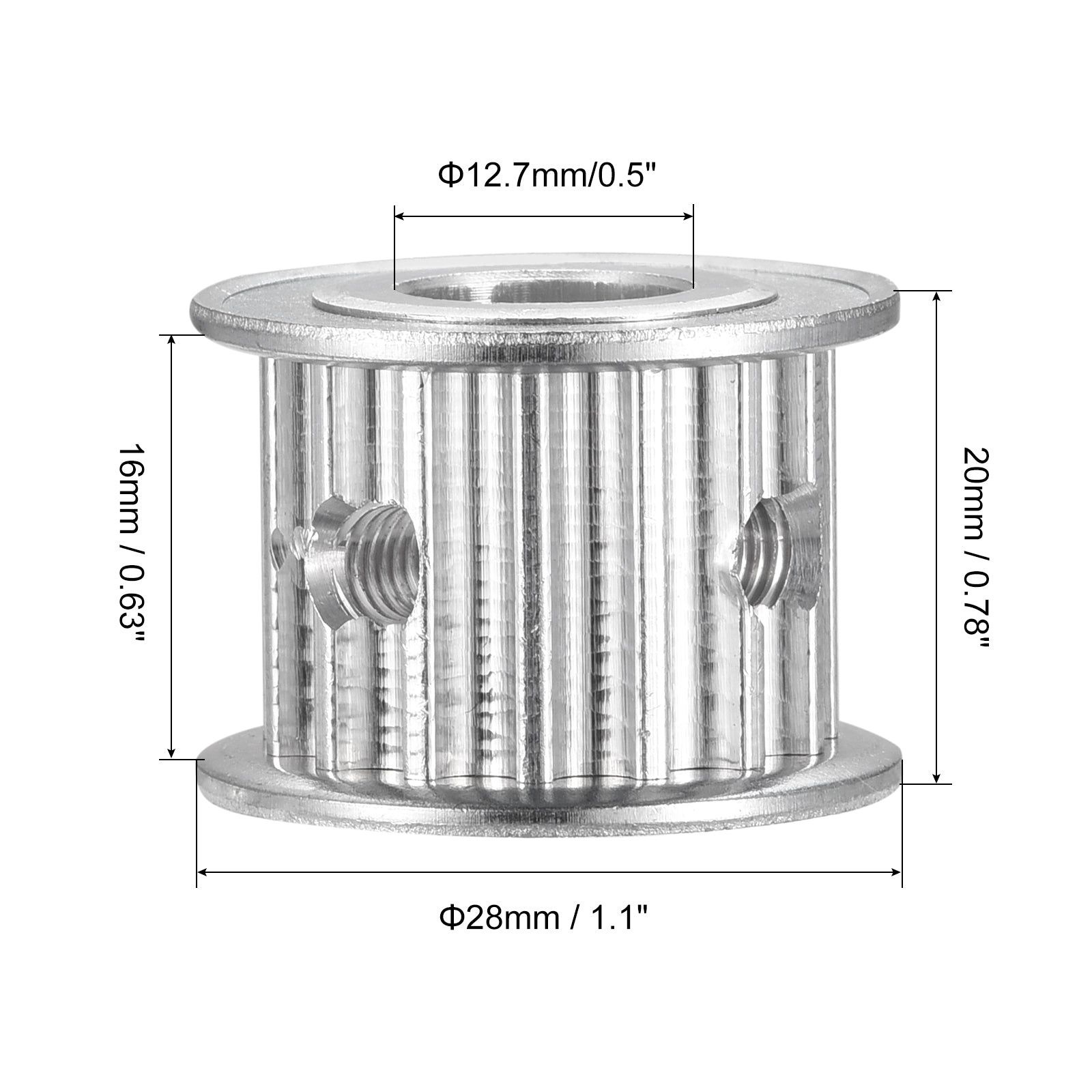 Package Content: 1pcs x Timing Pulley Wheel; Thread: M5*0.8; Teeth: 15T; Pitch: 5mm/0.19inch; Bore Diameter: 12.7mm/0.5inch; Max Diameter: 28mm/1.1inch; Total Height: 20mm/0.78inch; Slot Width: 16mm/0.63inch; Structure Type: Flat on Both Sides; Shaft Hole Shape: Round