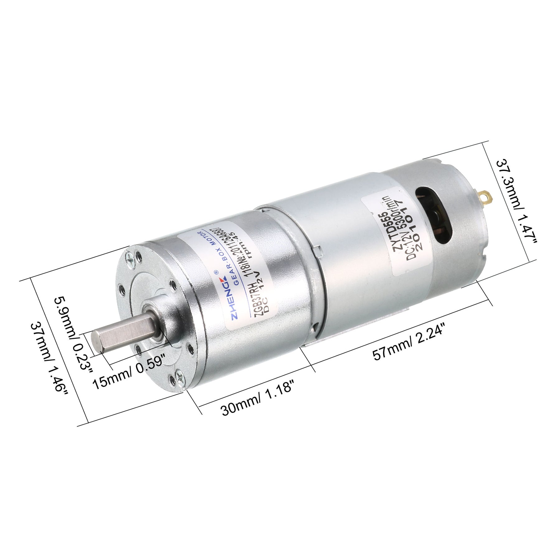 Specification: No-load Speed: 300RPM at 24 Volts; kg.cm: 5 Power: 7.2W; No-load Current: 0.15A; Load Current: 0.6A; Reduction Ratio: 1: 118 D Shaft Size: 15mm x 5.9mm/0.59 x 0.23 inches (L*D); Gearbox Size: 30mm x 37mm/ 1.18 x 1.46 inches (L*D); Motor Size: 57mm x 37.3mm/2.24 x 1.47 inches (L*D); Mounting Hole Size: M3 (not included).