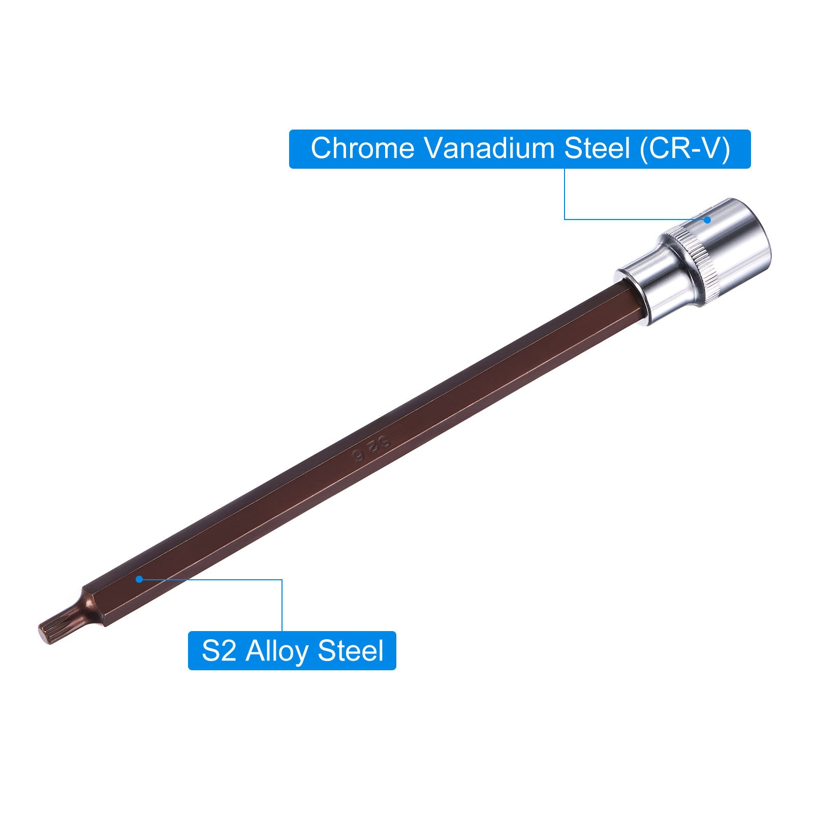 1. Bit is made of S2 alloy steel, hardness arrived at 58-62 HRC, reduce wear-outs. 2. Chrome vanadium steel socket with high strength and large torque. 3. The bit is pressed directly into the socket to make a permanent connection. 4. Four detent grooves in the socket drive end provides firmly connected with the retaining ball of the drive tool. 5. The beveled inner edge helps guide the socket to the drive tool. 6. It has a radius corner design, causing the socket to grasp the sturdy wall of the fastener instead of the corners, thereby reducing the wear of the fastener. 7. Use with ratchet to improve speed in tightening Spline drive fasteners. And the product has no insulation properties and is not suitable for electrical environments.