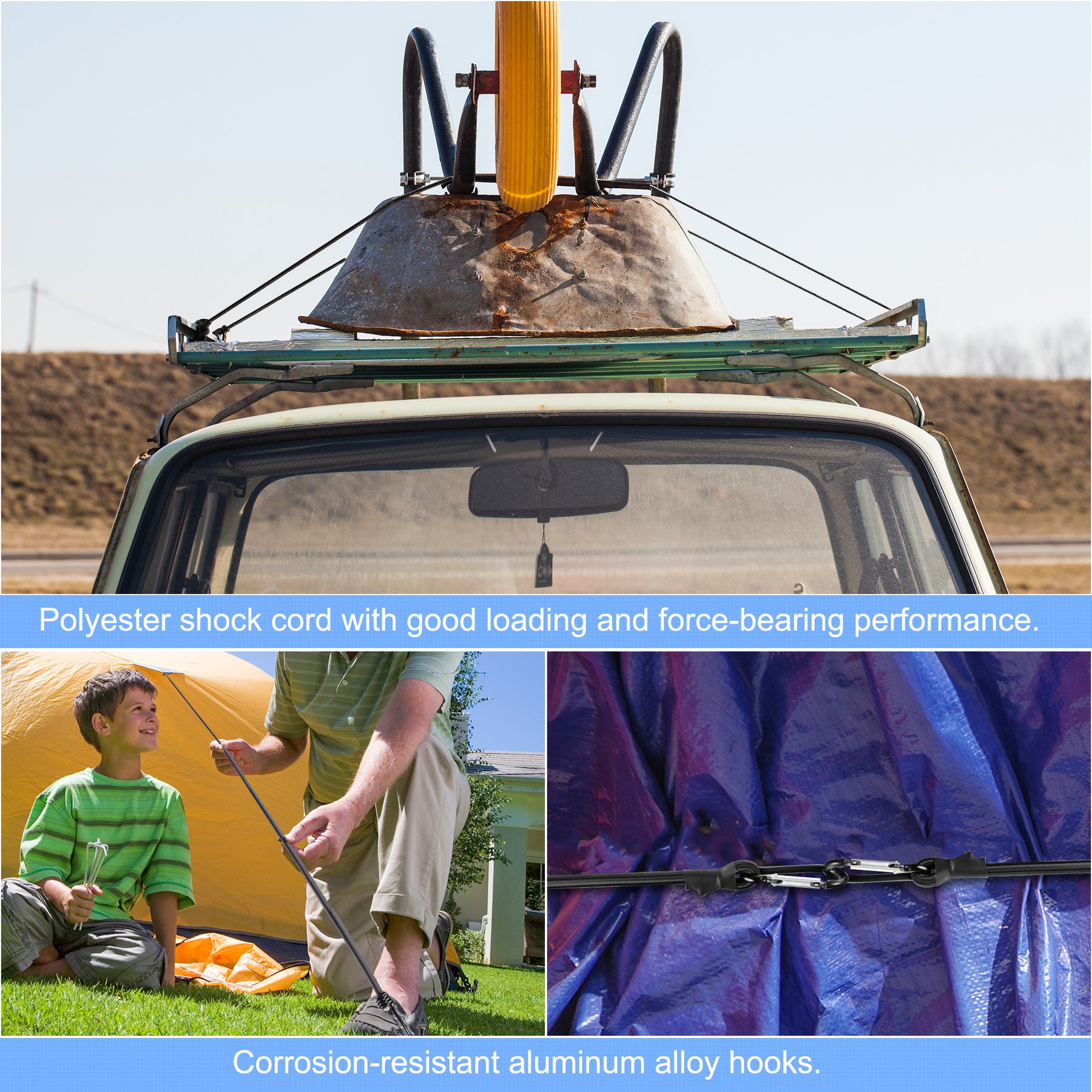 What is this? The elastic cord with hooks provides a wide range of applications for outdoor camping, hiking, boating, fishing, farming, gardening, transporting and storage. It can fix for tent, canopy, tarp, tarpaulin, cargo, luggage, canoe, kayak, and so on.