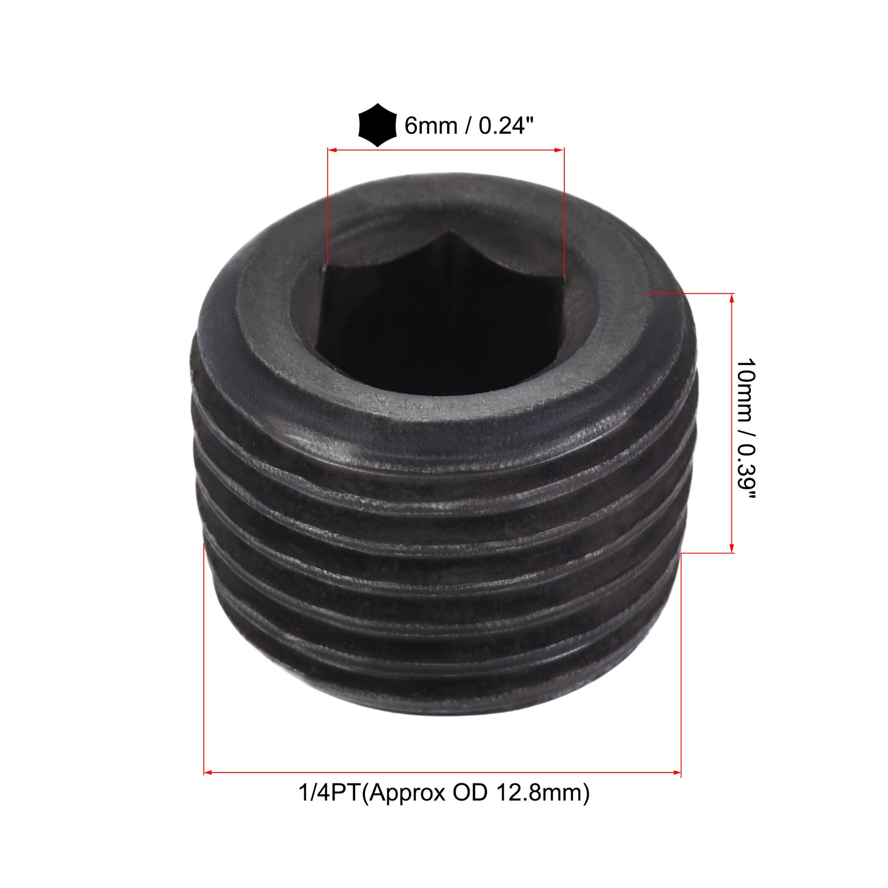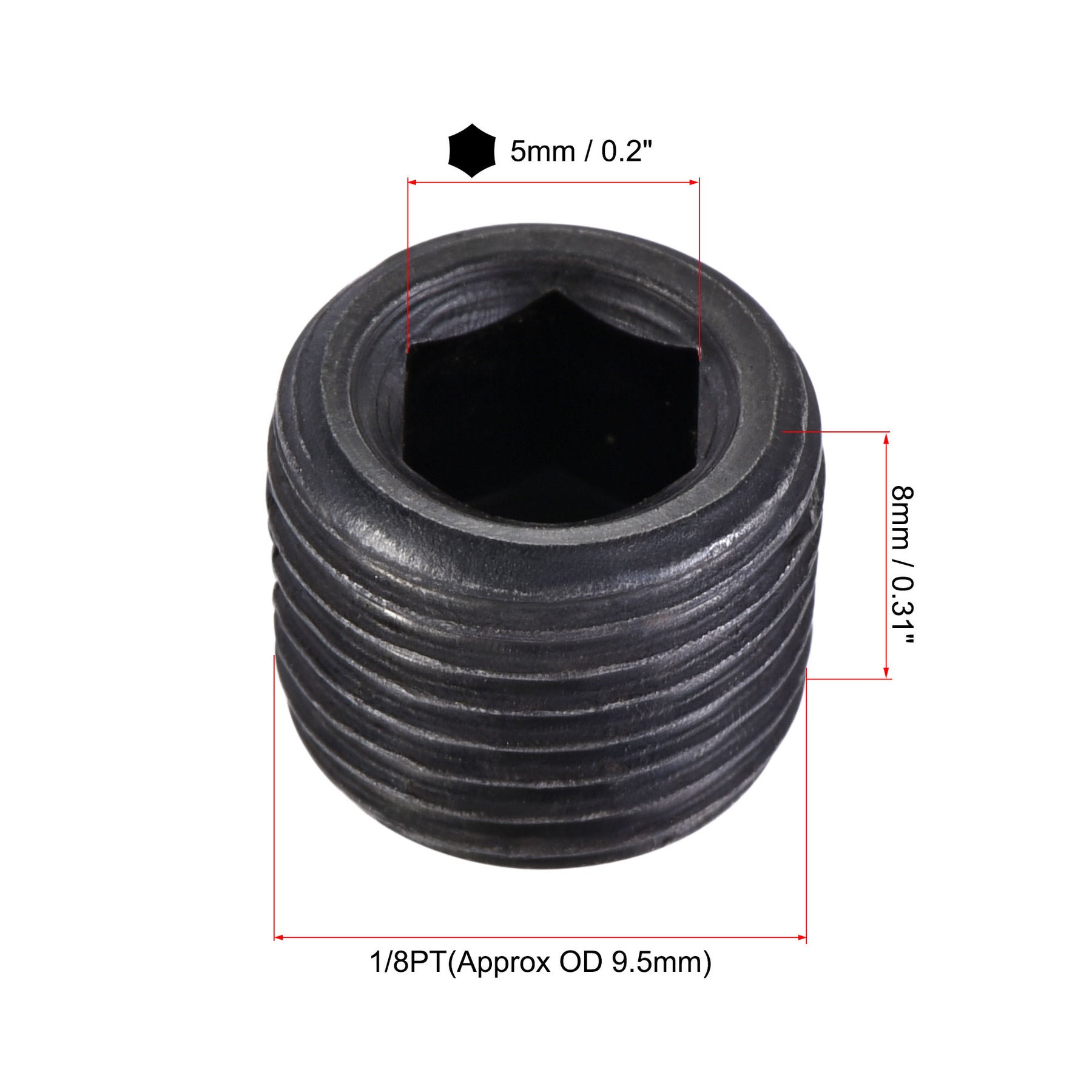 Specification: Material: Carbon Steel Color: Black Thread Size: 1/8PT(Approx OD 9.5mm) Internal Hex Width : 5mm / 0.2" Total Size: 9.5mm x 8mm / 0.37" x 0.31" (D*H)