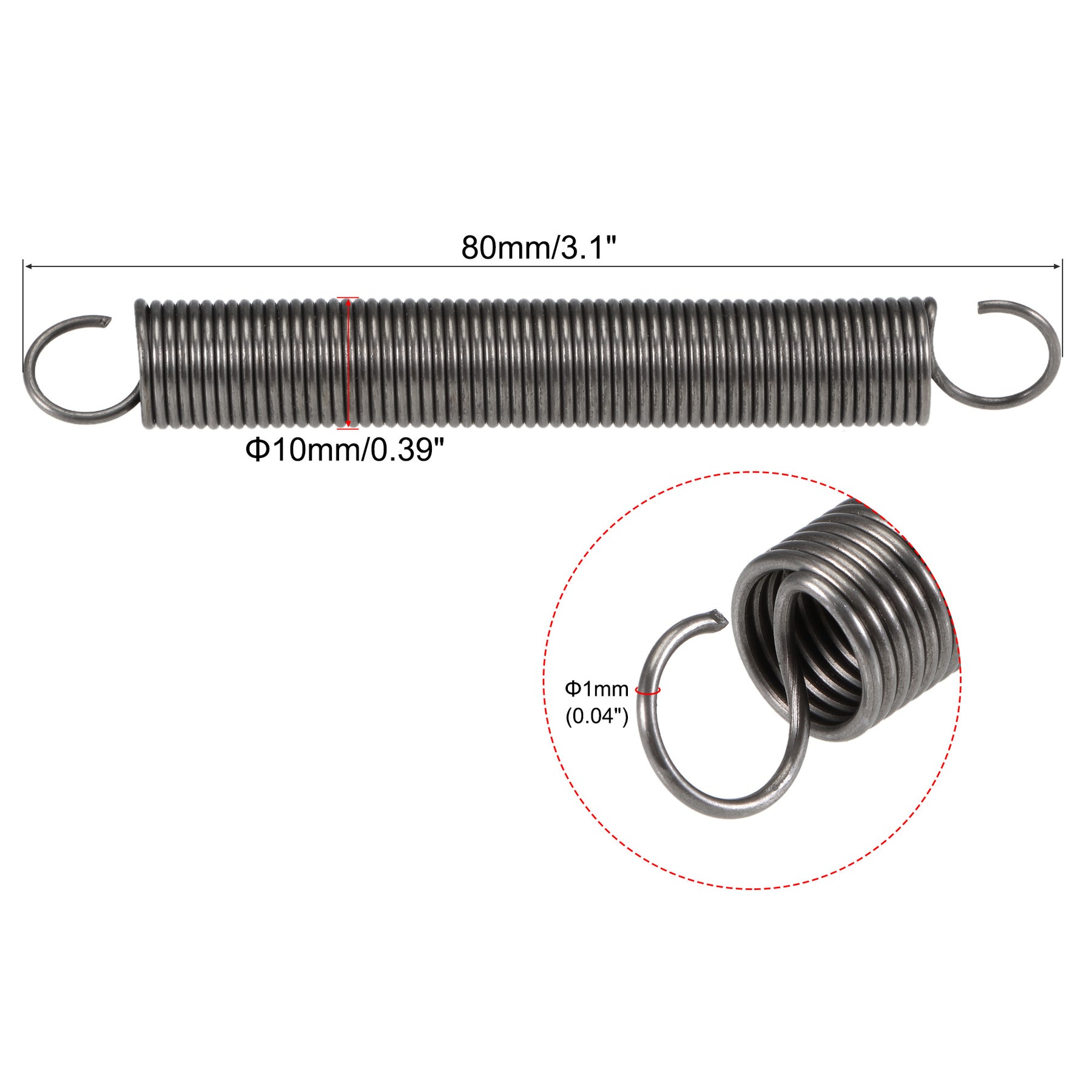 Specification: Product Name: Tension Spring Type:Dual hook Free Length: 80mm/3.1" Spring Size( Outer Diameter): 10mm/0.39"(OD) Wire Diameter: 1mm/0.04" Main Material: Spring Steel Heat treatment: Tempering Finished: Polished