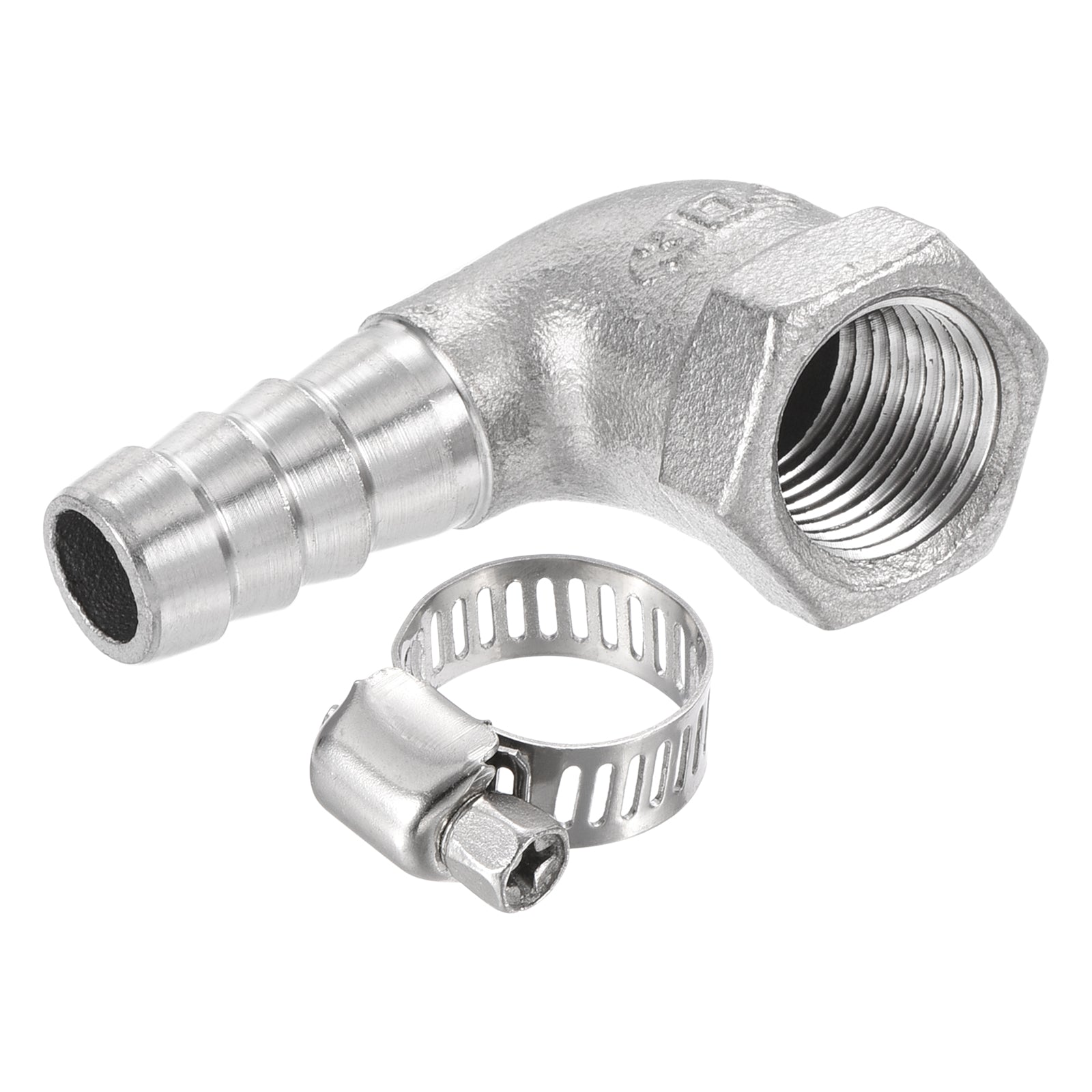 What will I get? Color: Silver Tone Material: 304 Stainless Steel Fitting Shape: Elbow Thread Size: 1/4PT Female Barb Outer Diameter: 10mm / 0.39inch Elbow Overall Size: 40x26x17mm / 1.57x1.02x0.67 inch (L*H*Hex.W) Clamp Size: 9mm to 16mm / 0.35 to 0.63 inch Package Contents: 1 x Barbed to Threaded Elbow, 1 x Hose Clamp