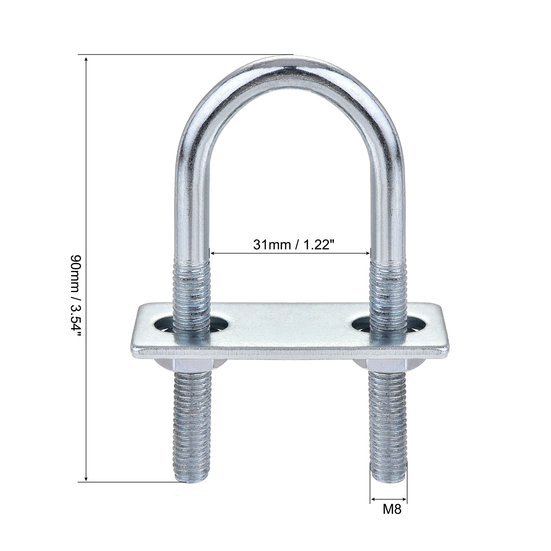 Specification: Product Name: U-Bolt Material: Steel Surface Treatment: Galvanized Main Color: Silver Tone Thread Dia.: M8 Fit Rod Size: 31mm / 1.22" Rod Diameter: 7mm / 0.28" Total Length: 90mm / 3.54" Hex Nut Size: 14 x 6mm / 0.55" x 0.24"(Hex Width*H) Frame Plate Size: 62 x 25 x 3mm / 2.44" x 0.98" x 0.12"(L*W*T)