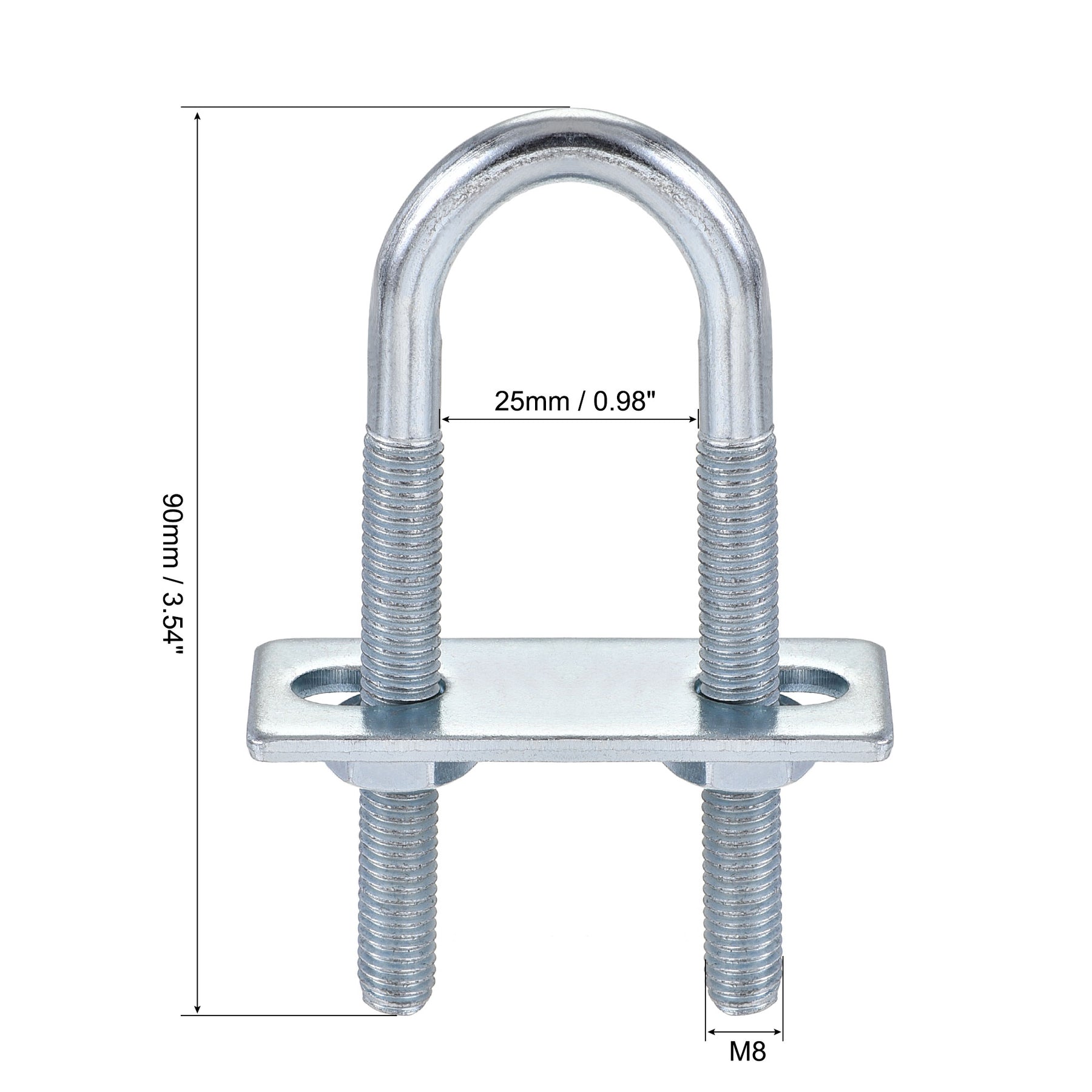 Specification: Product Name: U-Bolt Material: Steel Surface Treatment: Galvanized Main Color: Silver Tone Thread Dia.: M8 Fit Rod Size: 25mm / 0.98" Rod Diameter: 7mm / 0.28" Total Length: 90mm / 3.54" Hex Nut Size: 14 x 6mm / 0.55" x 0.24"(Hex Width*H) Frame Plate Size: 62 x 25 x 3mm / 2.44" x 0.98" x 0.12"(L*W*T)