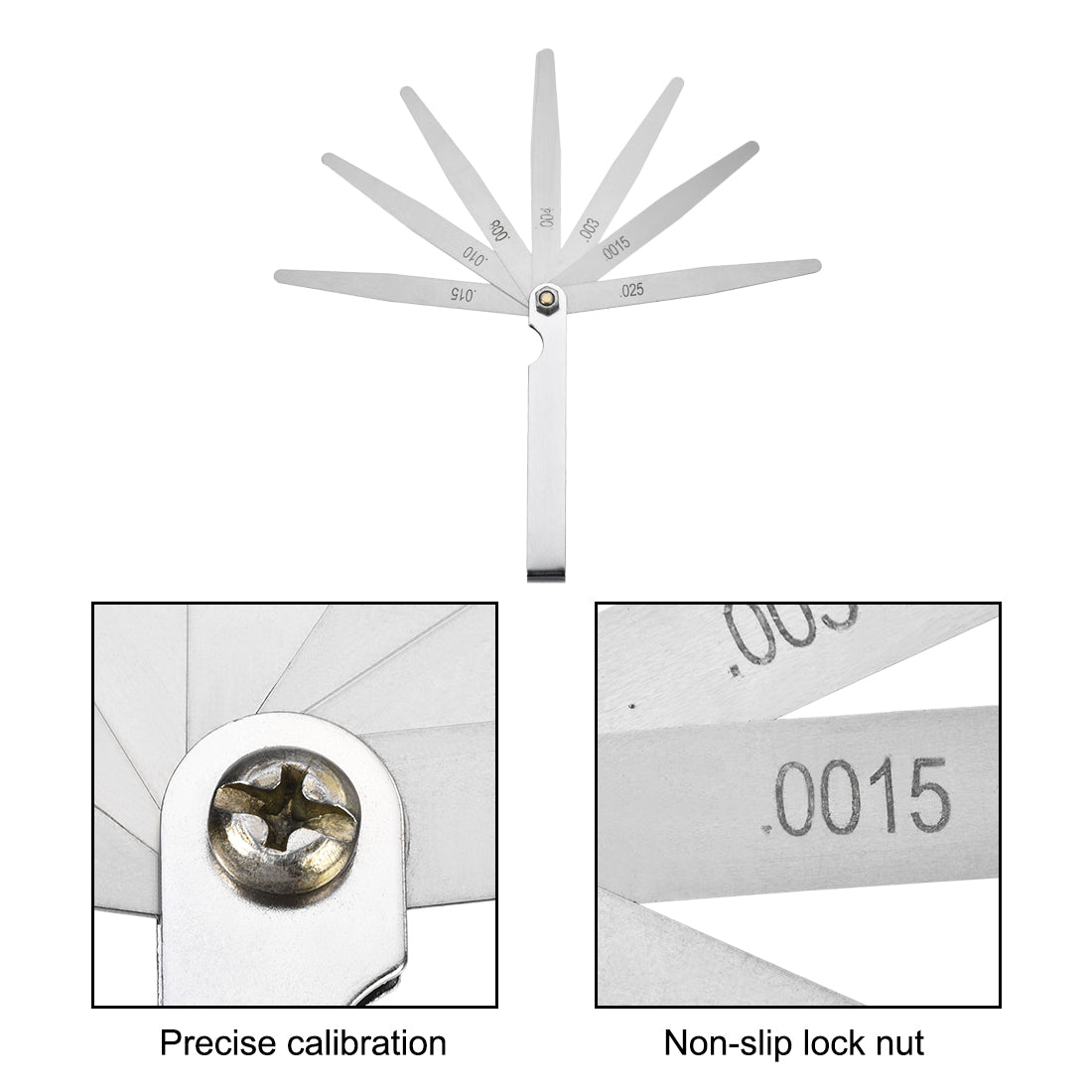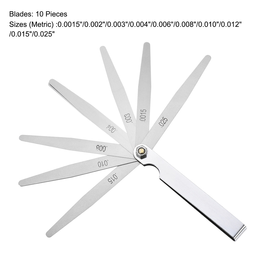 Feature: Each leaf has a laser etched size for easy identification. Foldable, easy and convenient to take and store. Suitable for designers, engineers, mechanics to measure the thickness of tappet clearances, spark plugs gaps, bearing clearances, piston ring gaps and other places.