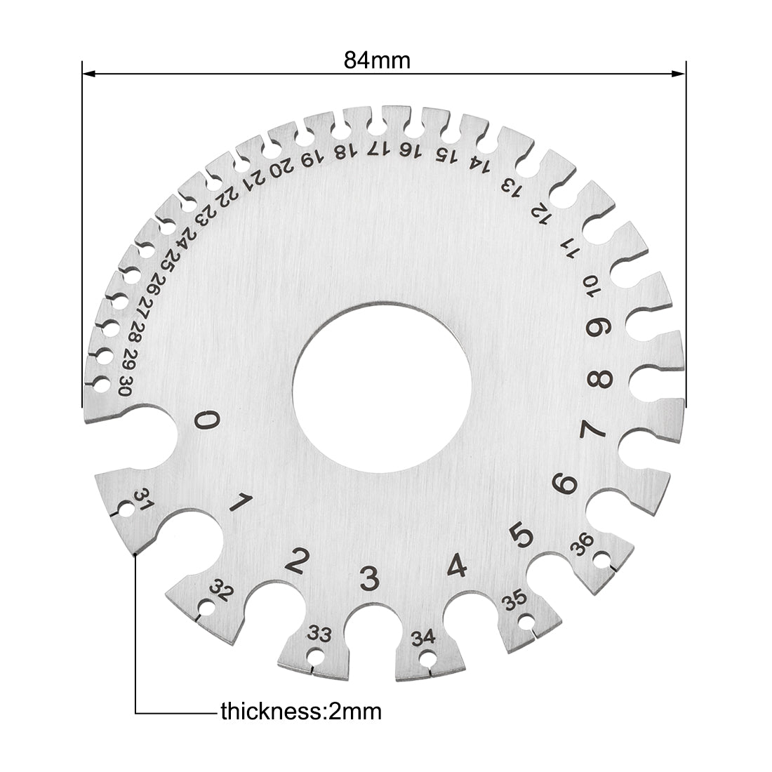 Stainless Steel Material - Corrosion Resistance For Durable Use, Will Not Rust In Dry Environment And Easy To Keep. Easy Reading - Sizes And Numerals Are Etched Into The Surface For Clarity And Easier Reading, You Can Get A Precise And Accurate Data Ahead. Practical Handy Tool - Good To Determine The Thickness Of The Material Before Working, Permits A Quick And Accurate Measuring Of The Most Popular Thickness. Size - Dual-Sided Round Wire Gauge: 0-36 American standard; Wire/Metal Sheet Thickness Gauge