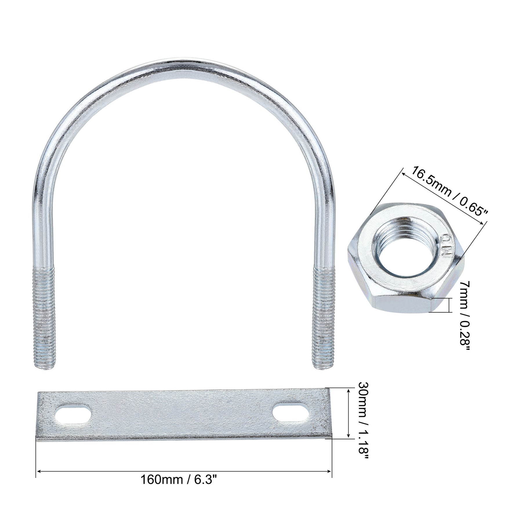 Specification: Product Name: U-Bolt Material: Steel Surface Treatment: Galvanized Main Color: Silver Tone Thread Dia.: M10 Fit Rod Size: 108mm / 4.25" Rod Diameter: 8.9mm / 0.35" Total Length: 136mm / 5.35" Hex Nut Size: 16.5 x 7mm / 0.65" x 0.28"(Hex Width*H) Frame Plate Size: 160 x 30 x 5mm / 6.3" x 1.18" x 0.2"(L*W*T)