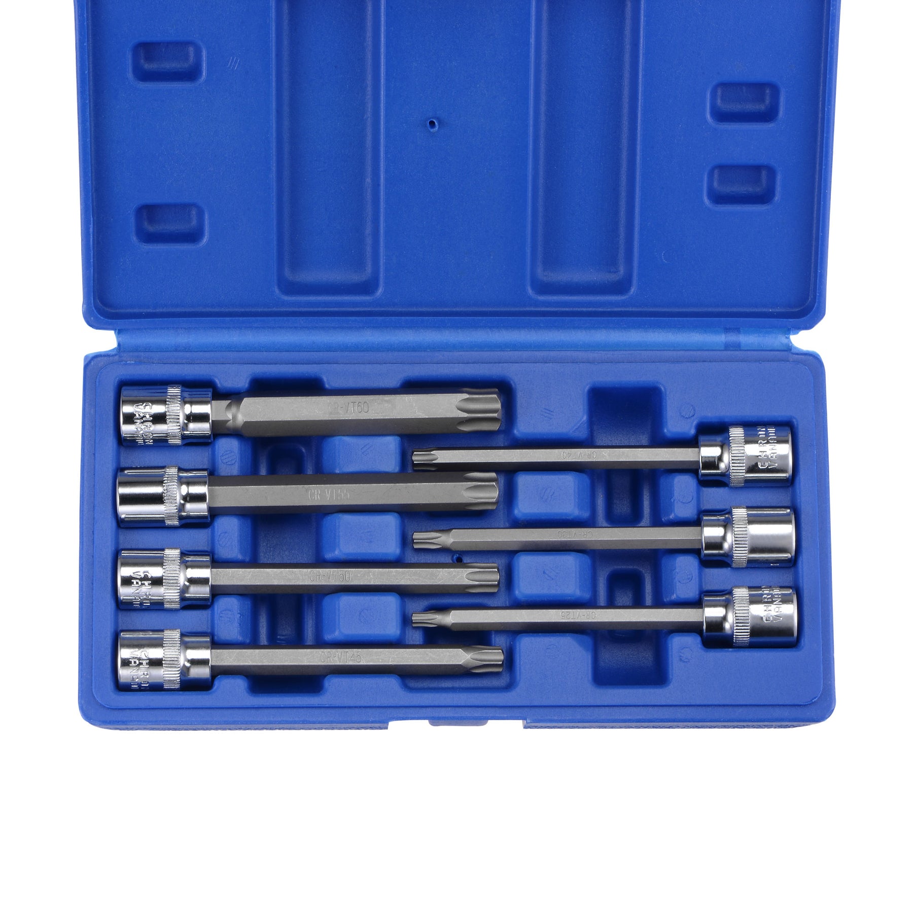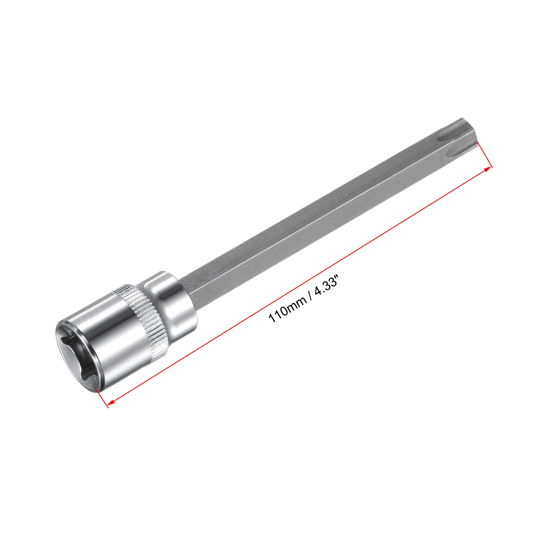 Specification: Driver Size: 3/8 Inch Bit Size: T25 T30 T40 T45 T50 T55 T60 Total Length: 110mm / 4.33 Inch Material: Chrome Vanadium Steel (CR-V) Finish: Chrome Plated Color: Silver Tone, Gray
