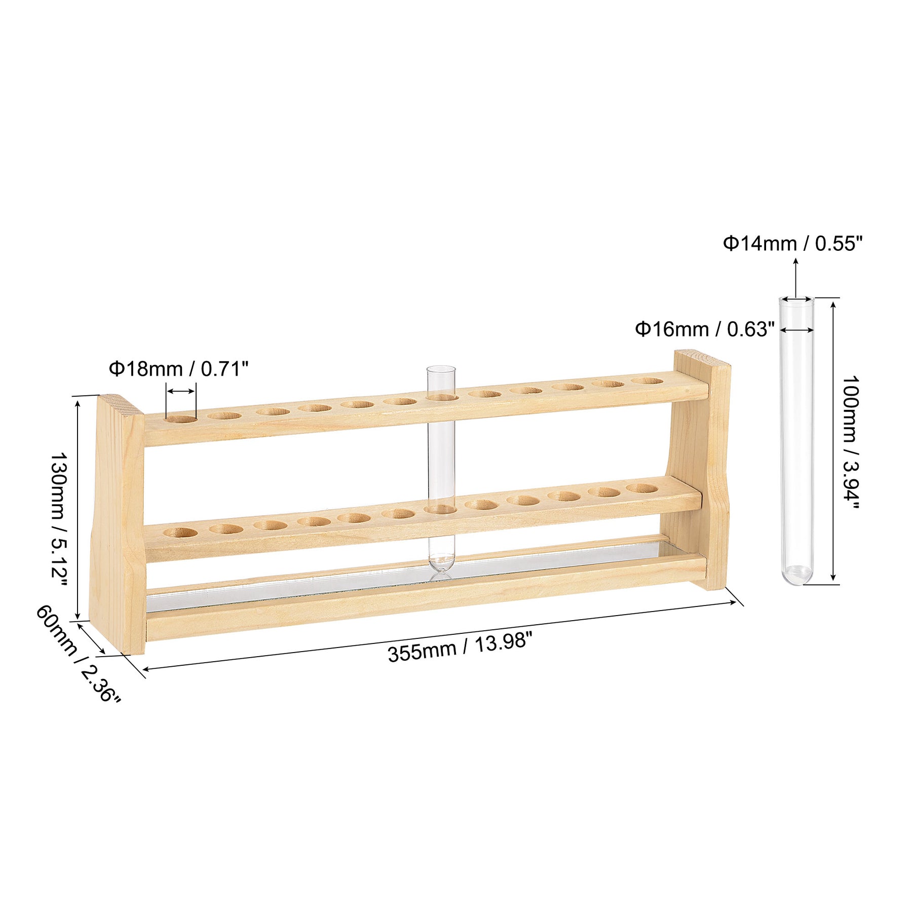 Descriptions: 1. Made of polystyrene(PS), no bubbles, corrosion-resistant, more durable than other plastic. 2. With a wooden test tube rack holder, sturdy and easy to clean. 3. Great for storing liquid, powder and small objects such as beads, plants, oil, etc. 4. Suitable for collecting Specimens in molecular biology, chemistry, biochemistry, also can be used in scientific experiments, party decorations. Specifications: Material: Polystyrene(PS) Color: Clear Type of Bottom: Round Inner Diameter: 14mm / 0.55" Tube Diameter: 16mm / 0.63" Tube Length: 100mm / 3.94" Tube Rack Size: 355 x 60 x 130mm / 13.98 x 2.36 x 5.12"(L*W*H) Hole Diameter: 18mm / 0.71" Hole Quantity:12