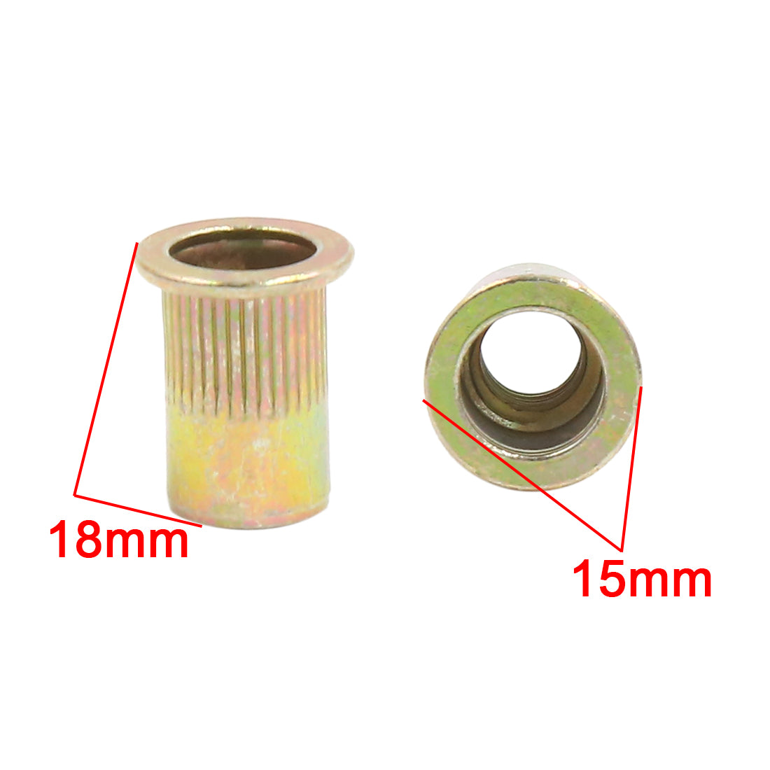 Ideal use on cars and vehicles. Color:Bronze Tone Thread Inner Diameter: 7mm/ 0.28inches Head Inner Diameter: 9mm/ 0.35inches Head Thickness: 1.6mm/ 0.06inches Outer Knurling Size: 11 x 9mm/ 0.43 x 0.35inches(D*L) A Rivet Nut fastener is a tubular rivet with internal threads. It can be installed in seconds form one side of the work. Once installed, no finishing work is required on the Rivet Nut fastener. The added benefit of not only being a dependable fastener, they are ready to use with clean threads available for screw attachments.Blind thinsheet materials that are too thin for a tapped thread. Blind Rivet Nuts also areused when an application has little or no access to the backside as they can be installed from the front side of the work piece. Pakage Includes:150(+/-2%) x Rivet Nut