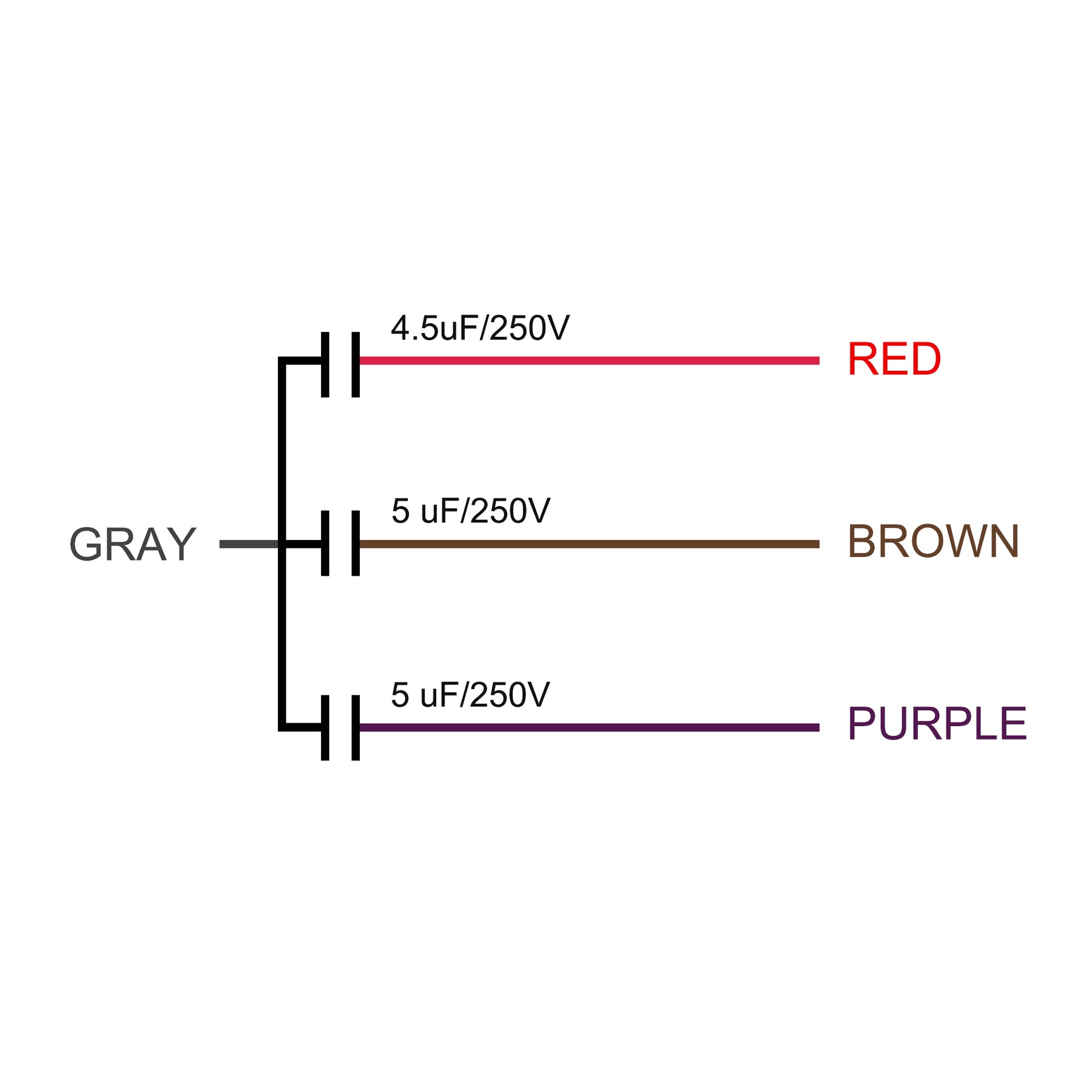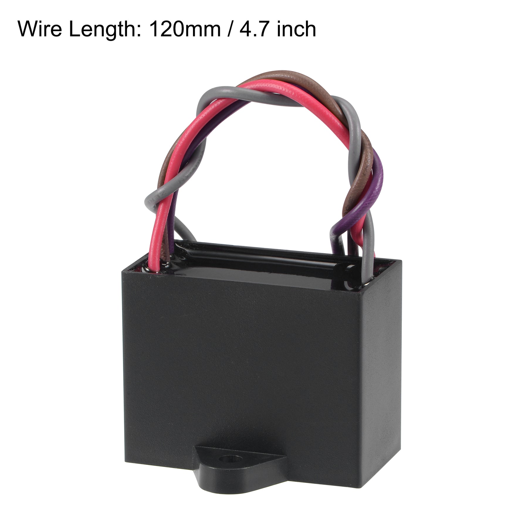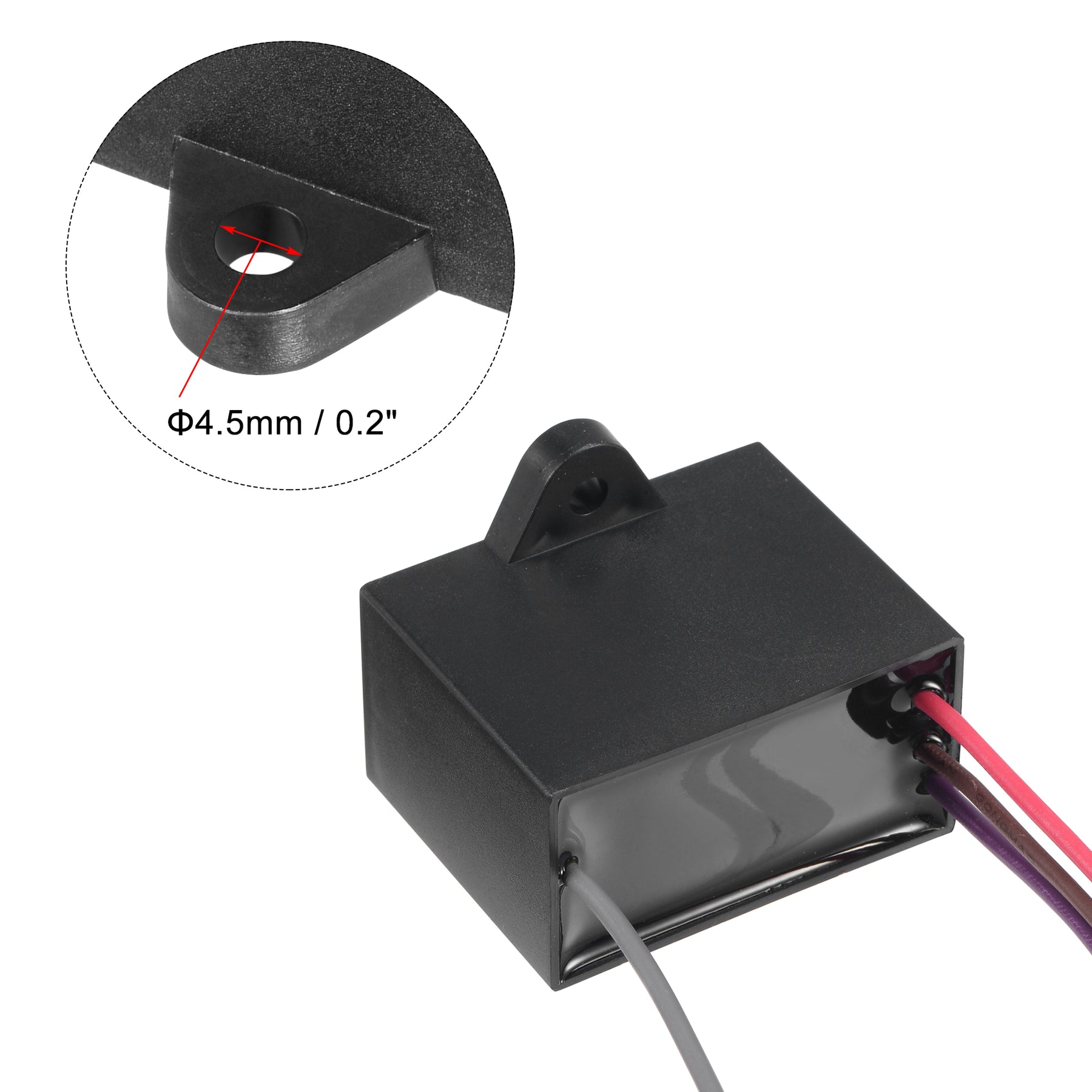 Specifications: Model: CBB61 Material: Polypropylene Film, Plastic Shell Lead End: 4 Wires Tolerance: ±5% Rated Capacity: 4.5/5/5uF Rated Voltage: 250V AC Rated Frequency: 50/60Hz Climatic Category: 40/85/21 Wire Length: 120mm / 4.7 inch Hole Diameter: 4.5mm / 0.2 inch Shell Size: 48x38x26mm / 1.9x1.5x1 inch Wire Color: Red/Gray/Brown/Purple
