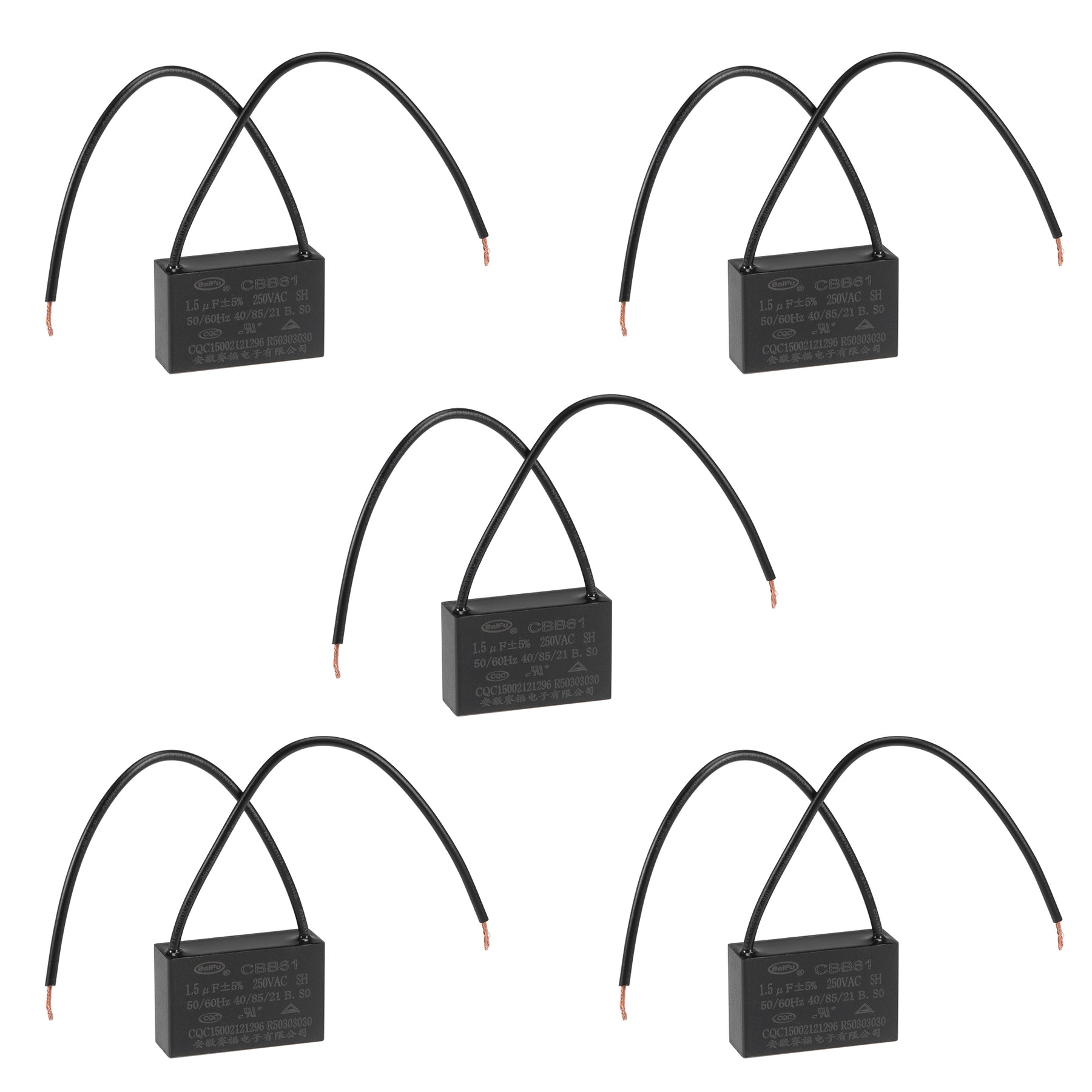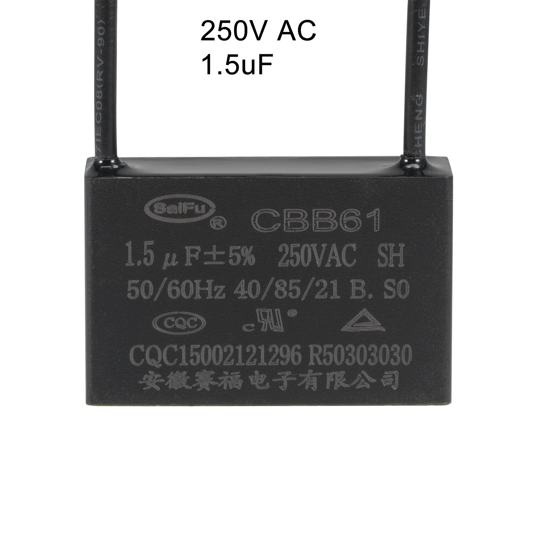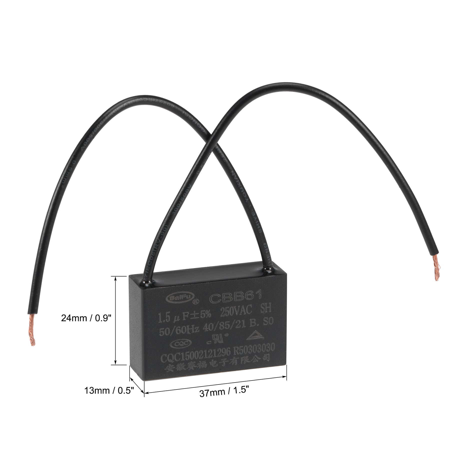 Specifications: Model: CBB61 Material: Polypropylene Film, Plastic Shell Lead End: 2 Wires Tolerance: ±5% Rated Capacity: 1.5uF Rated Voltage: 250V AC Rated Frequency: 50/60Hz Climatic Category: 40/85/21 Wire Length: 120mm / 4.7 inch Hole Diameter: 4.5mm / 0.2 inch Shell Size: 37x24x13mm / 1.5x0.9x0.5 inch Wire Color: Black