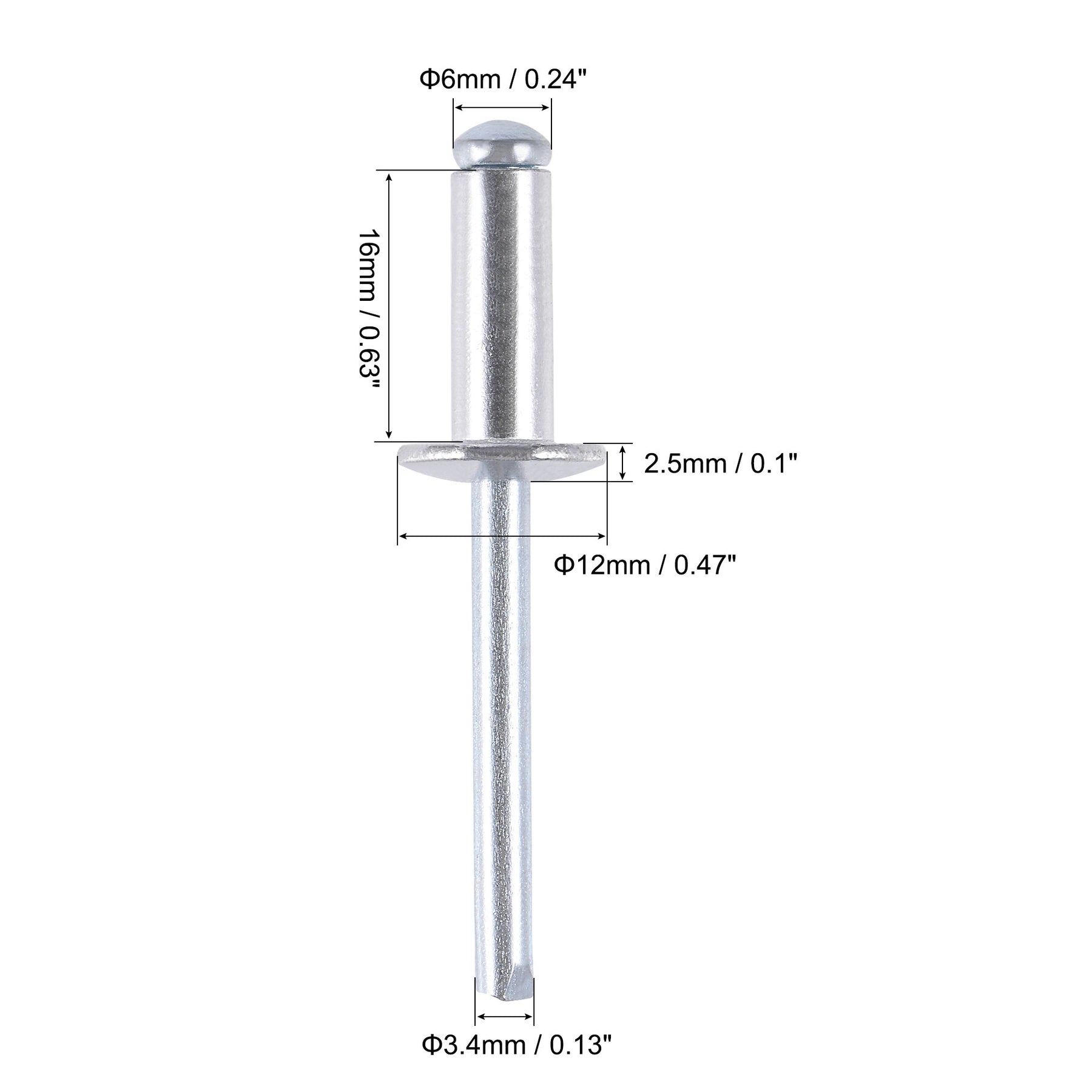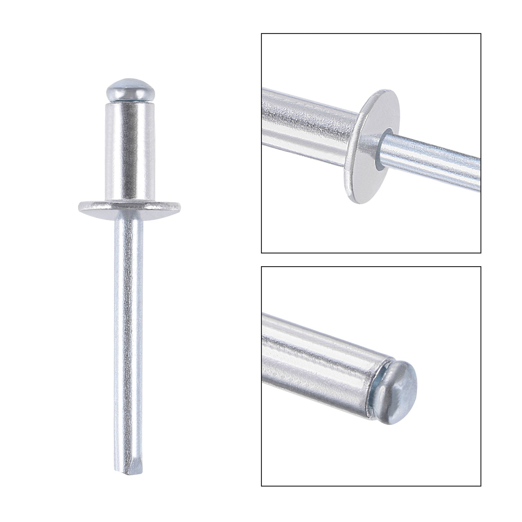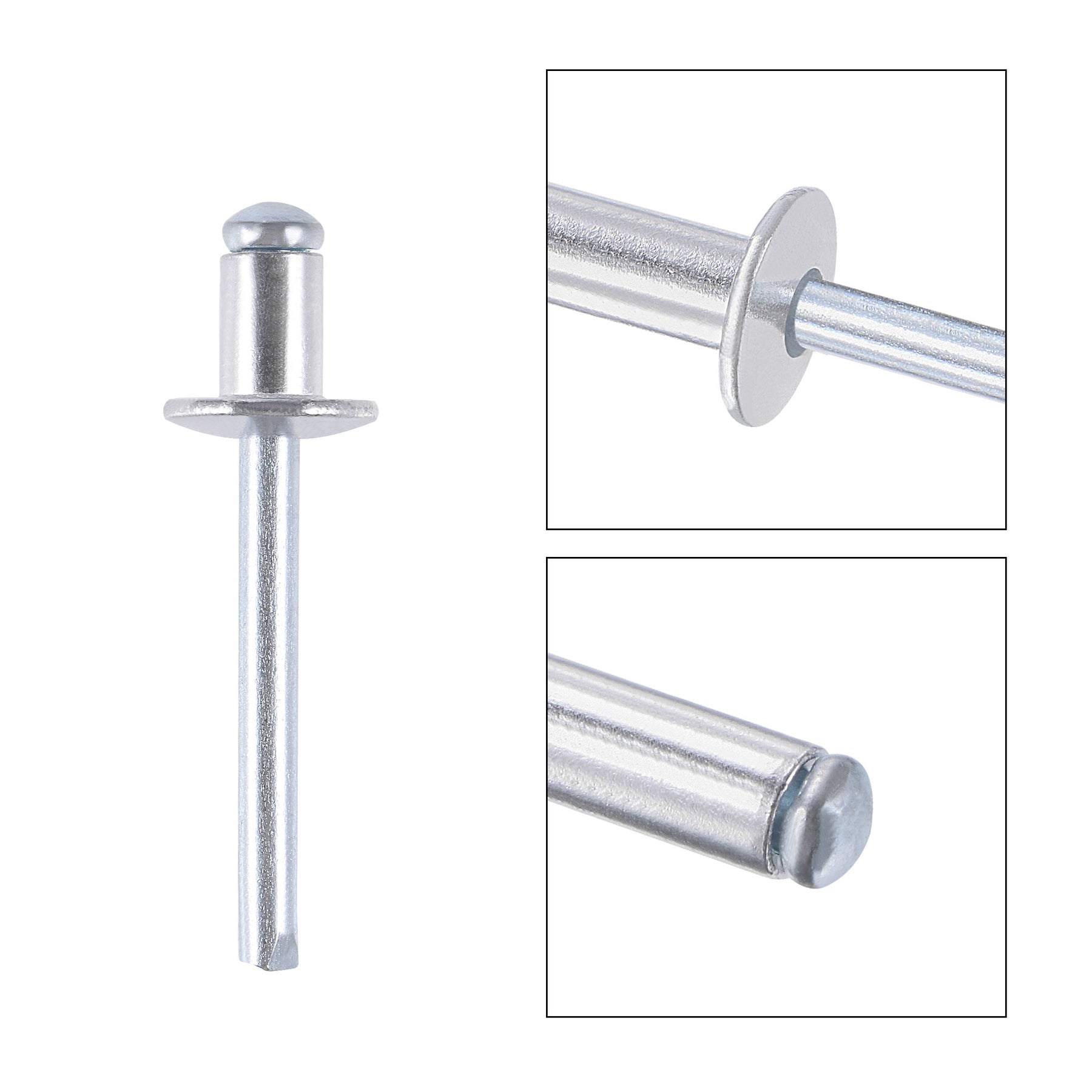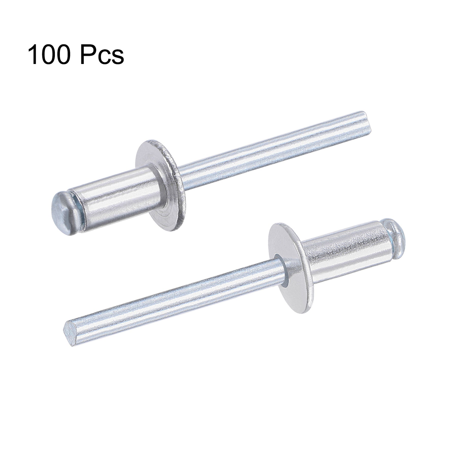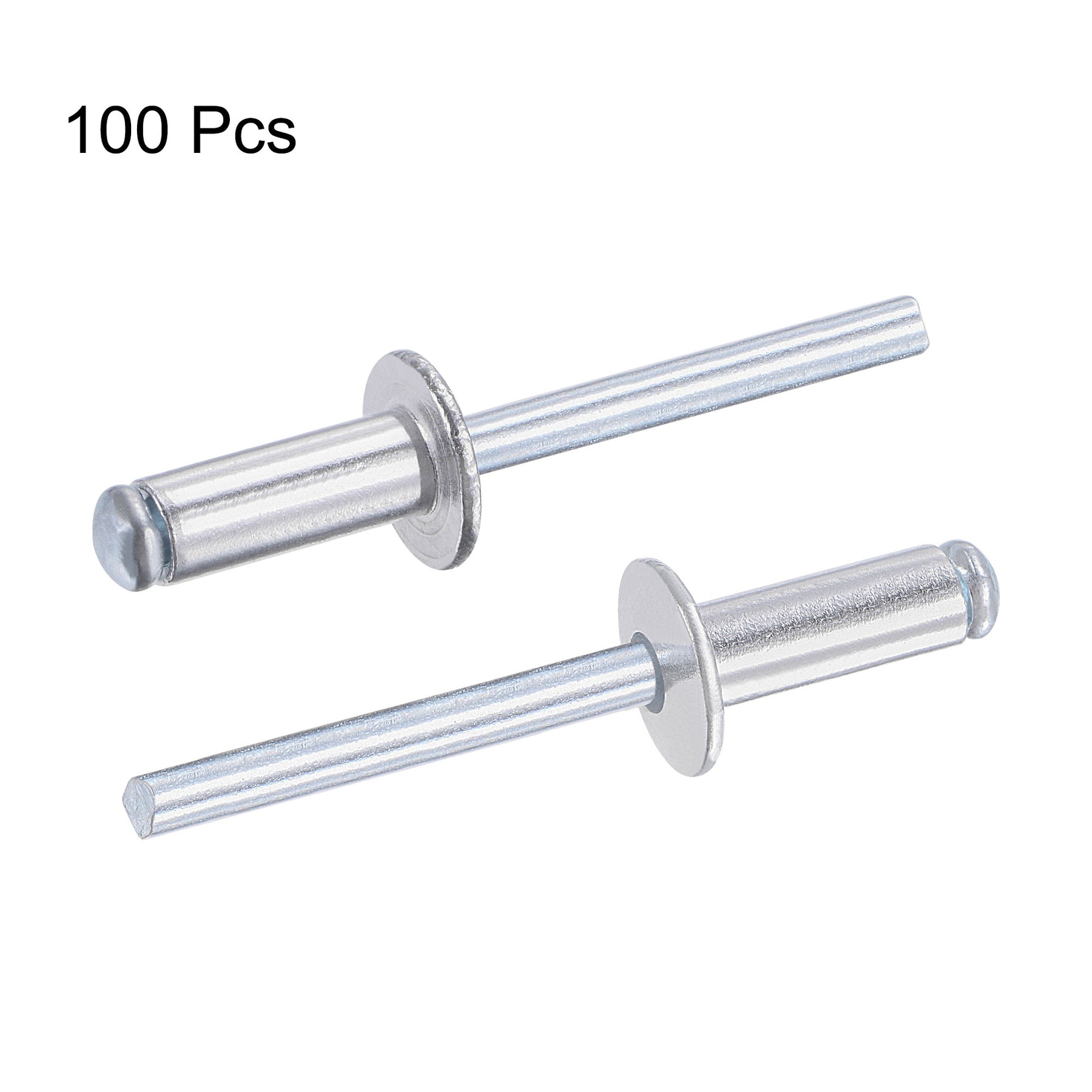 Open-end blind rivets with break pull mandrel, long rivet body, and flat round head.