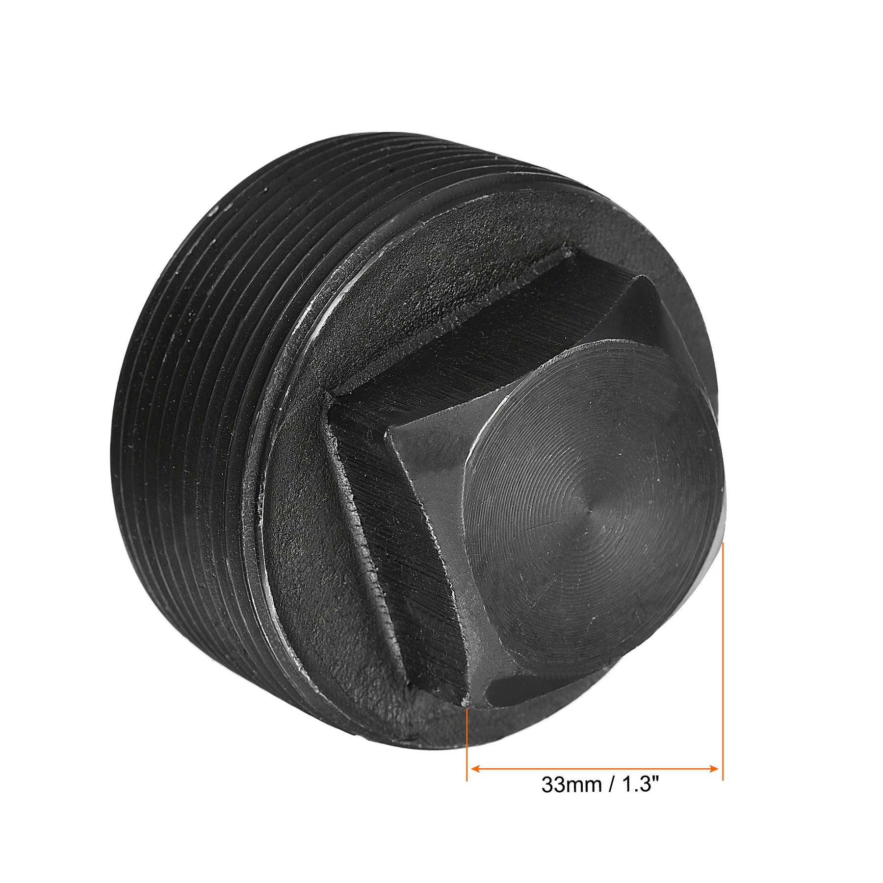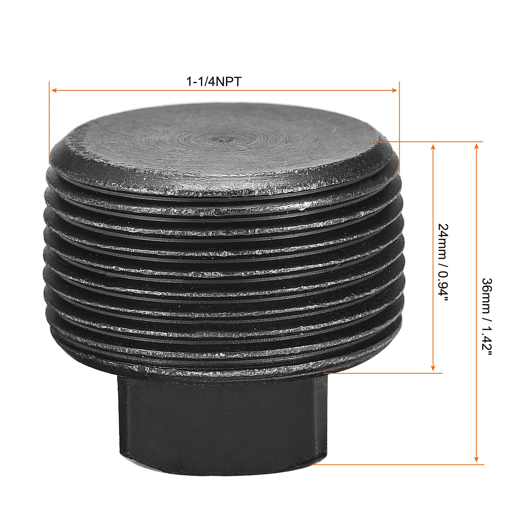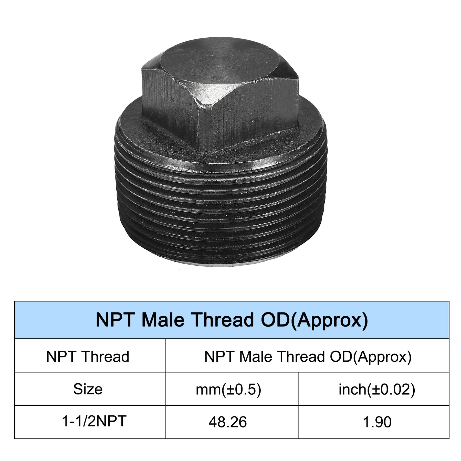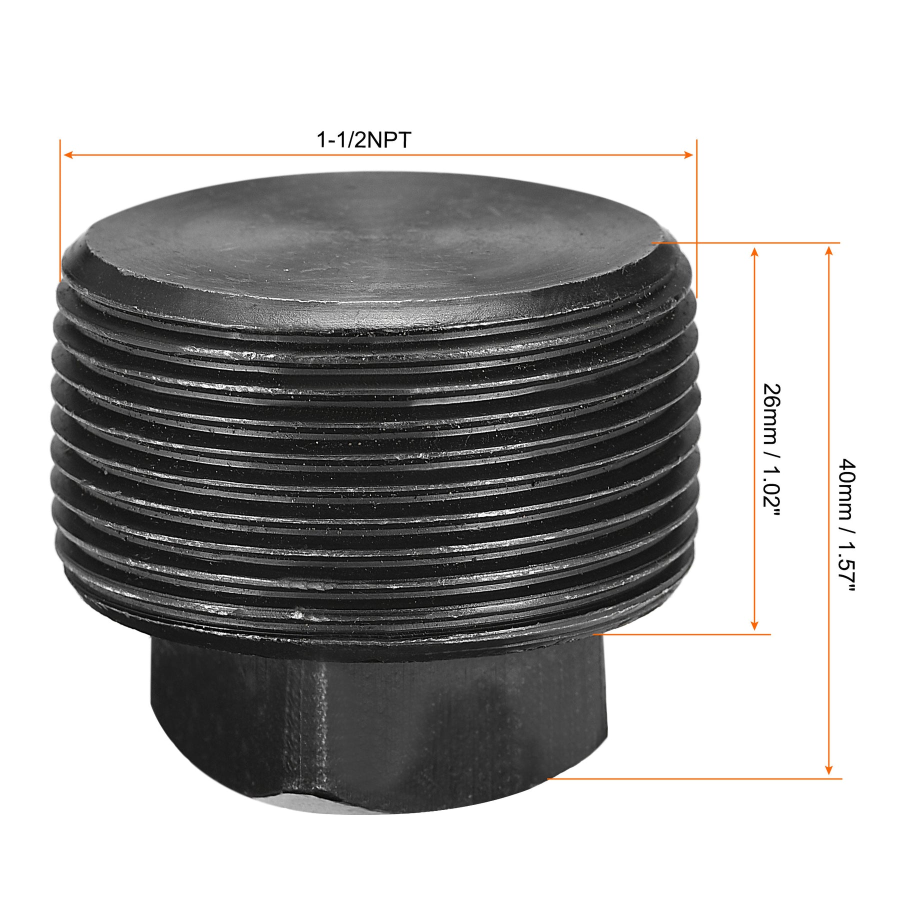Size:1-1/2NPT Features: Made of carbon steel, high strength and long durability. Precision threads ensure the firmness and sealing of the connection. Outer square head for increased leverage with a wrench during installation and disassembly. Used for closing and terminating the end of the pipe in industry, factory, outdoor garden.