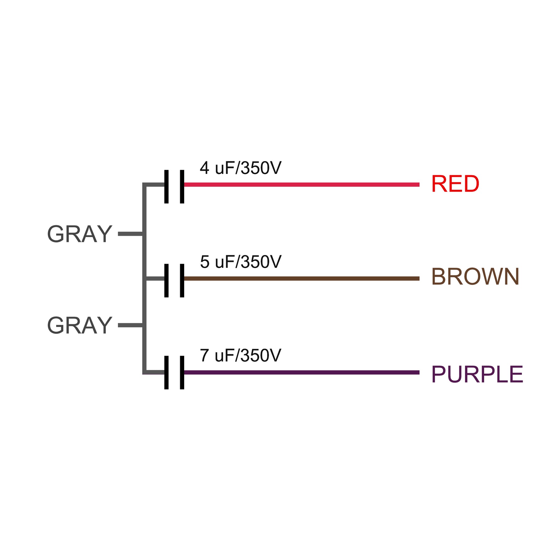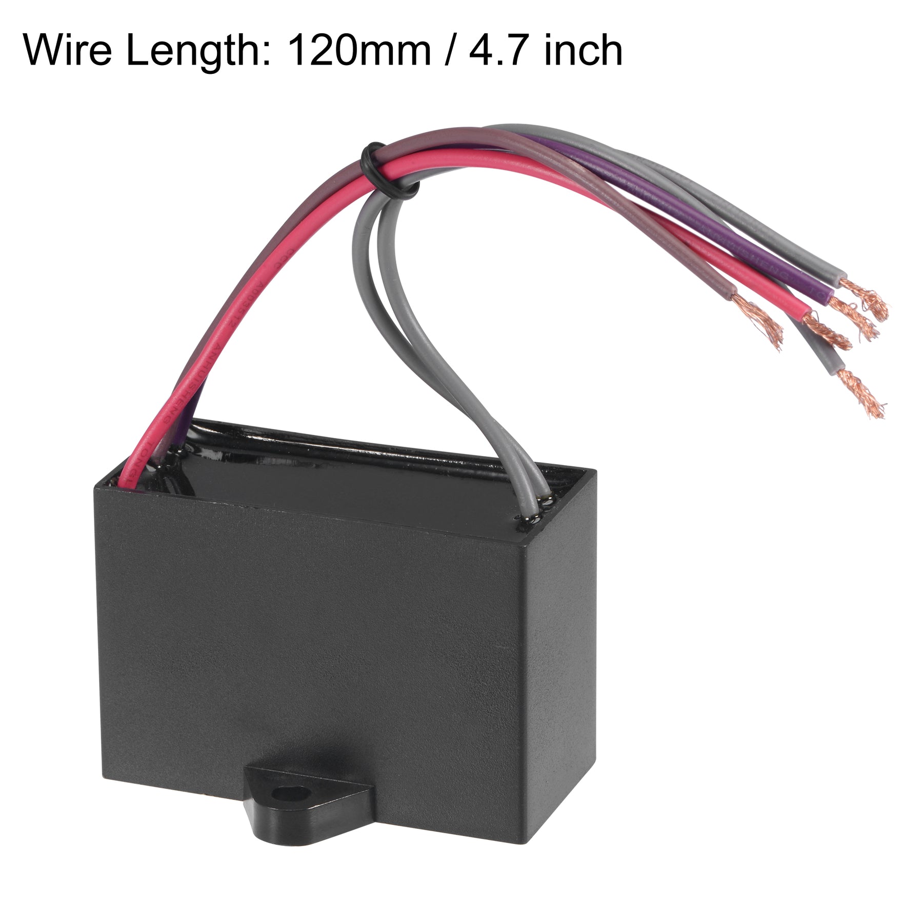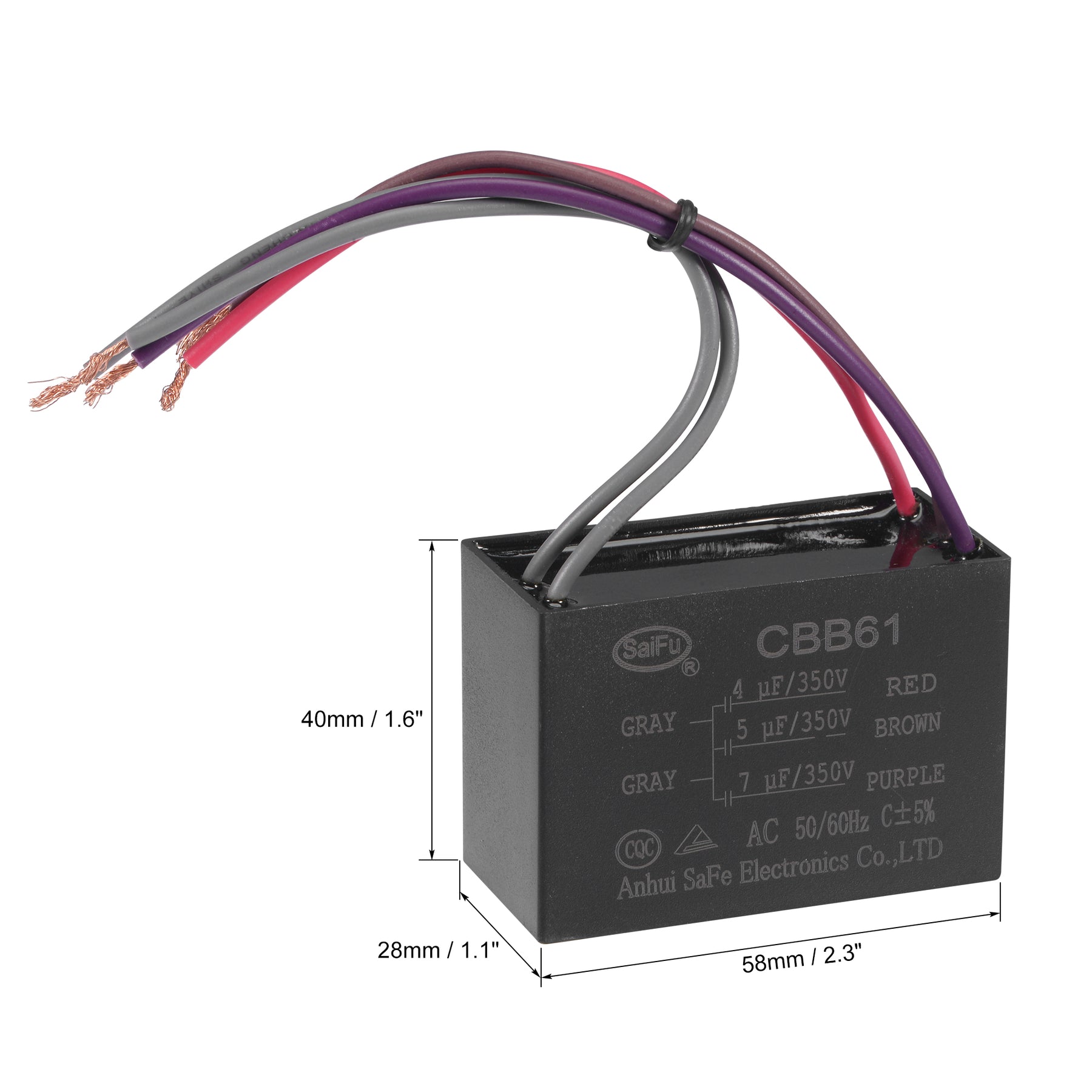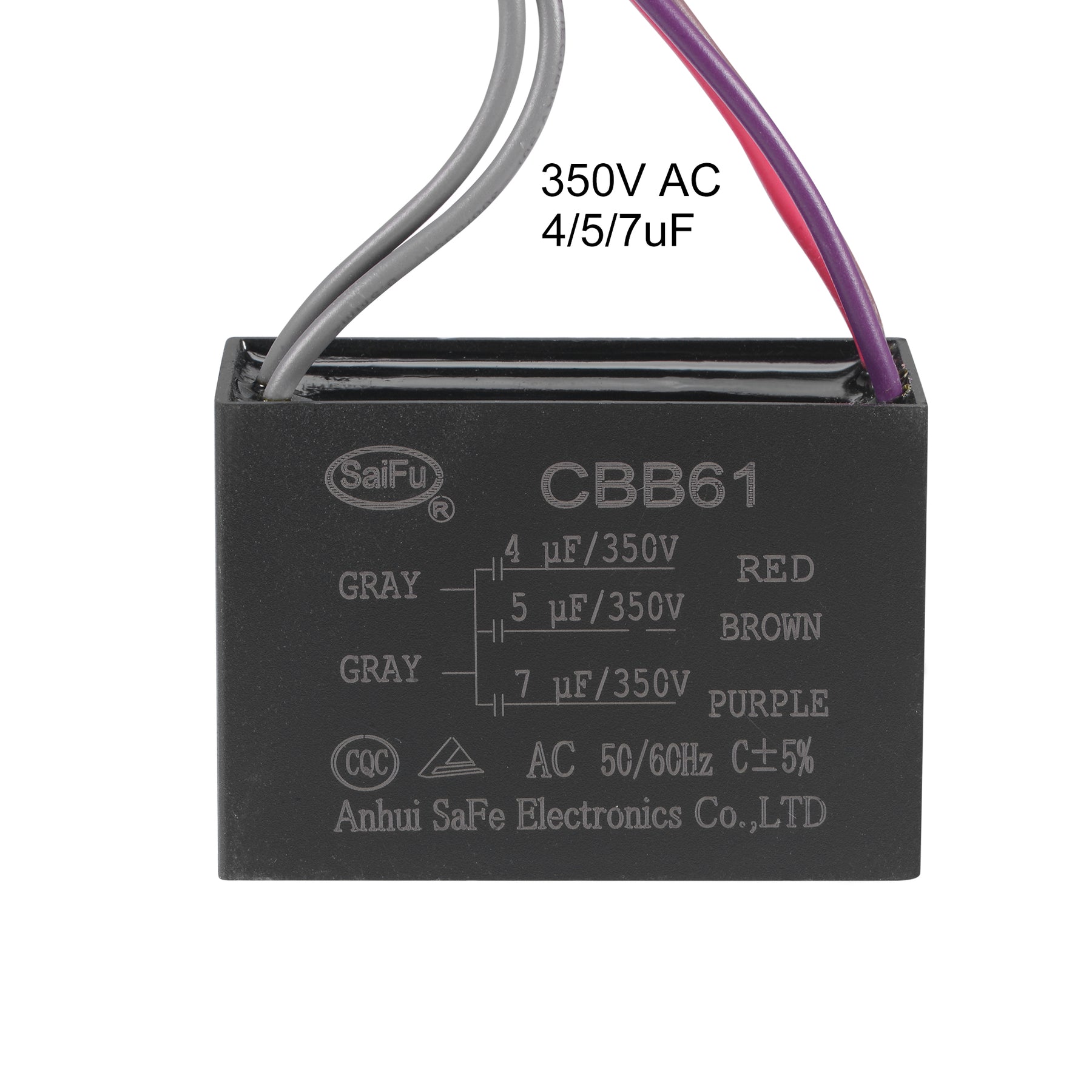 Specifications: Model: CBB61 Material: Polypropylene Film, Plastic Shell Lead End: 5 Wires Tolerance: ±5% Rated Capacity: 4/5/7uF Rated Voltage: 350V AC Rated Frequency: 50/60Hz Climatic Category: 40/85/21 Wire Length: 120mm / 4.7 inch Hole Diameter: 4.5mm / 0.2 inch Shell Size: 58x40x28mm / 2.3x1.6x1.1 inch Wire Color: Gray, Purple, Brown, Red