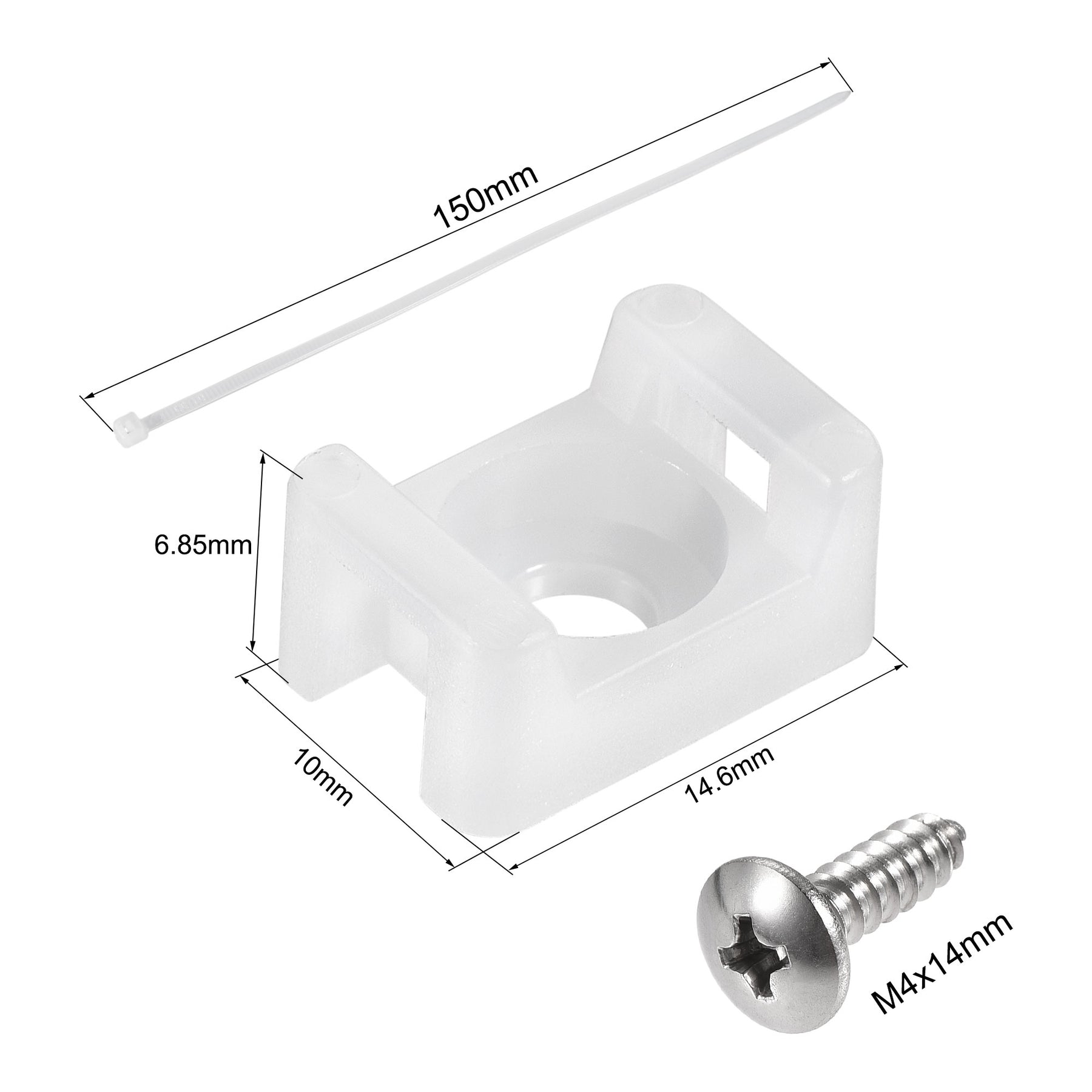 Specification: Material: Nylon Main Color: White Screw Size: M4x14mm(Thread Size*L) Cable Tie Size: 150mm x 2.5mm x 1mm(L*W*H) The Base Overall Size: 14.6mm x 10mm x 6.85mm(L*W*H) Package Content: Total 50 Set x Cable Clips with Screws and Ties