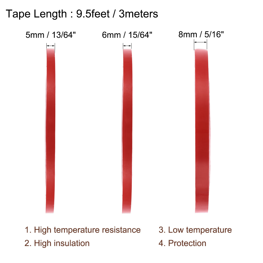 Specification : Product Name : Acrylic High Temperature Tape Coating Acrylic on 2- side Side Type : Double Sided Per Roll Total Length : 9.5feet/3yard/3meter Tape Width :5mm/13/64-inch; 6mm/15/64-inch; 8mm/5/16-inch Thickness : 1mm Temperature Resistance: - 25 ℃ below zero to 160 ℃ Color : Clear with Red Protect Film