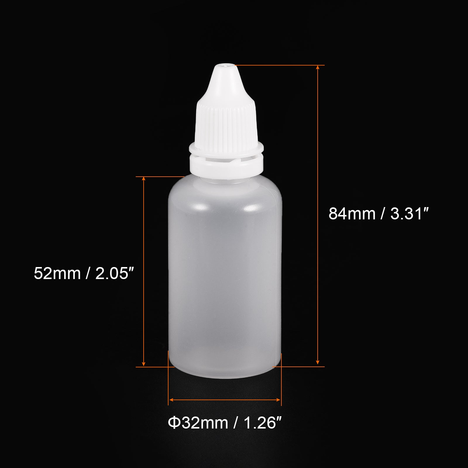 The plastic empty dropper bottles we provide here are in the specification of: Capacity: 30ml / 1.01oz; Body Diameter: 32mm / 1.26 inch; Body Height: 52mm / 2.05 inch; Total Height: 84mm / 3.31 inch; In the package of: 12 x Dropper Bottles.