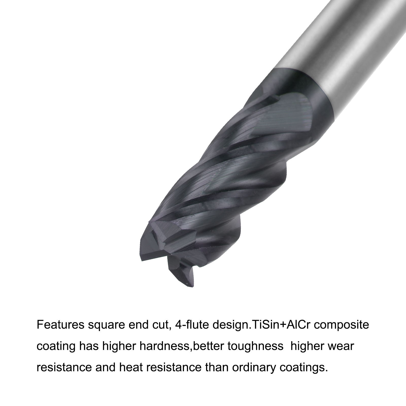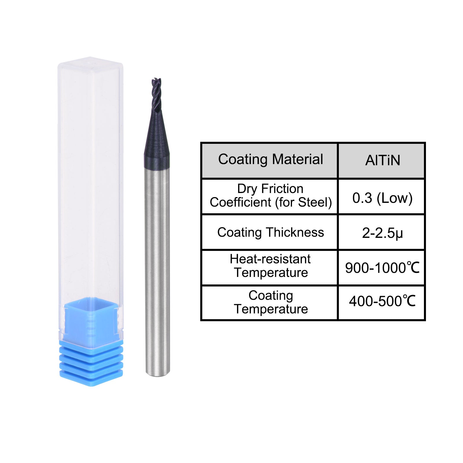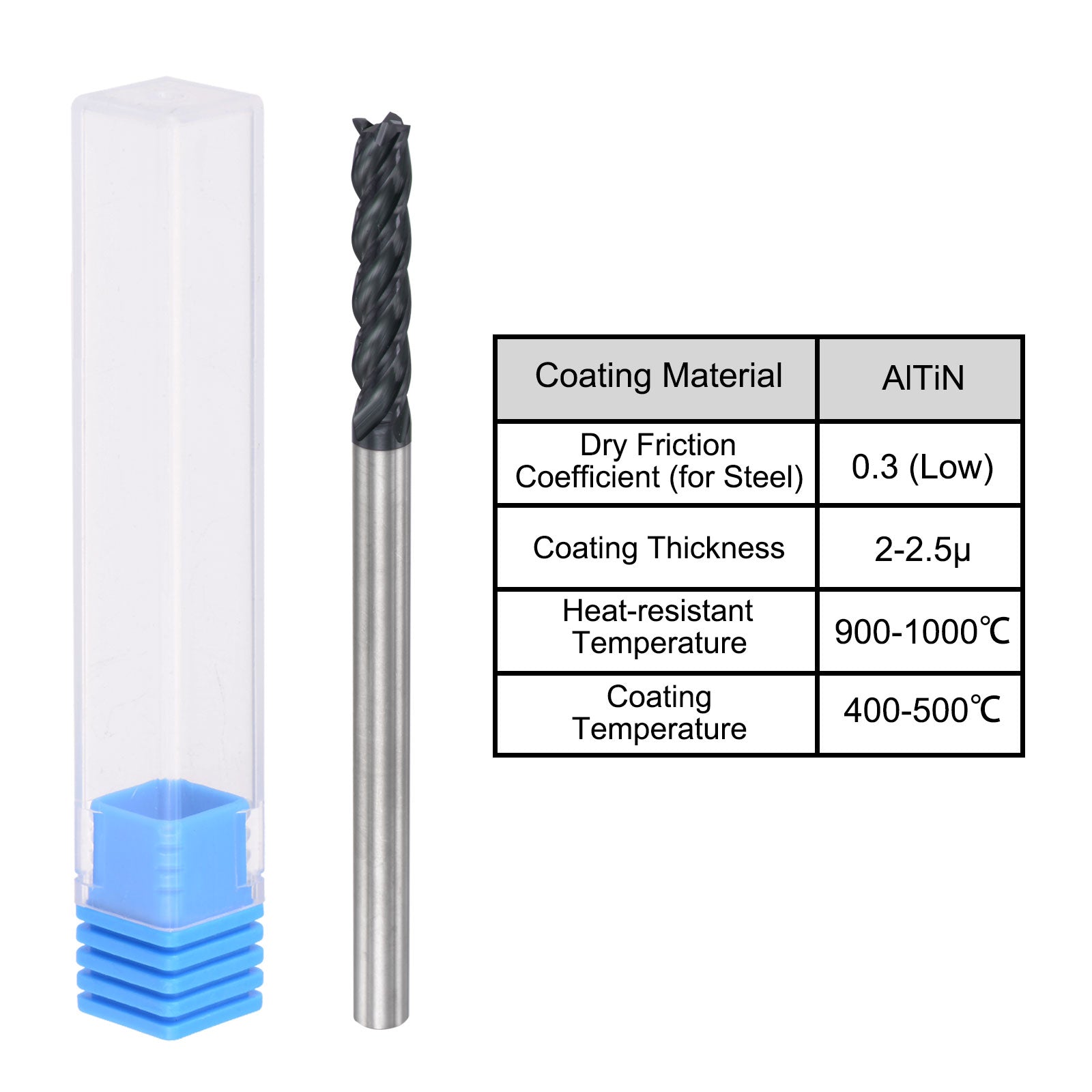 3. Features square end cut, flute design. Spiral chip space design for fast and clean chip removal. Sharp cutting edge provides smooth cutting. AlTiN composite coating can increase hardness, reduce oxidation wear for better wear resistance and extend tool life.