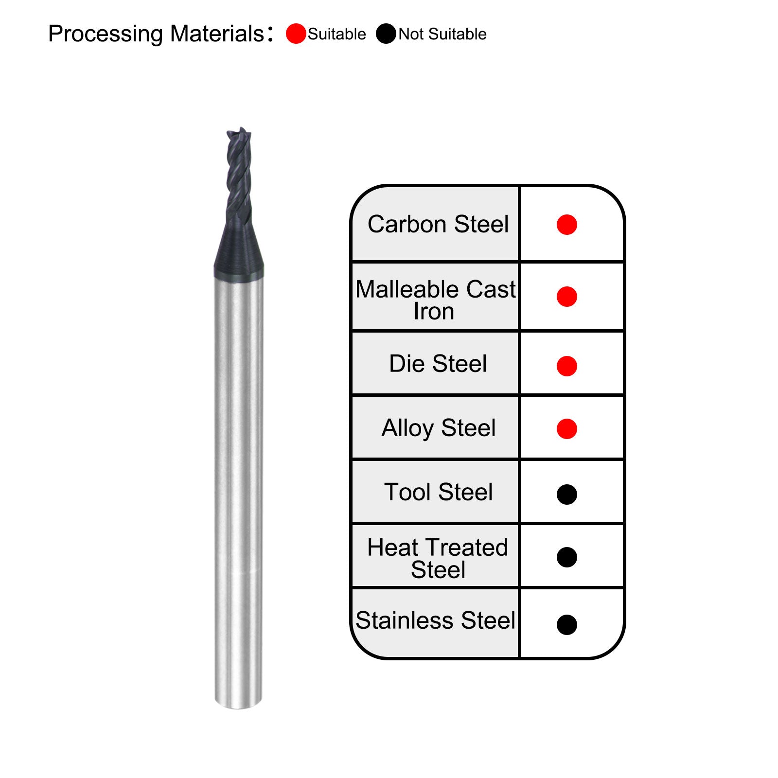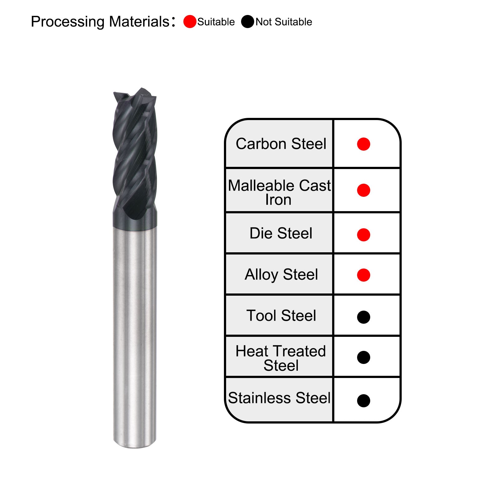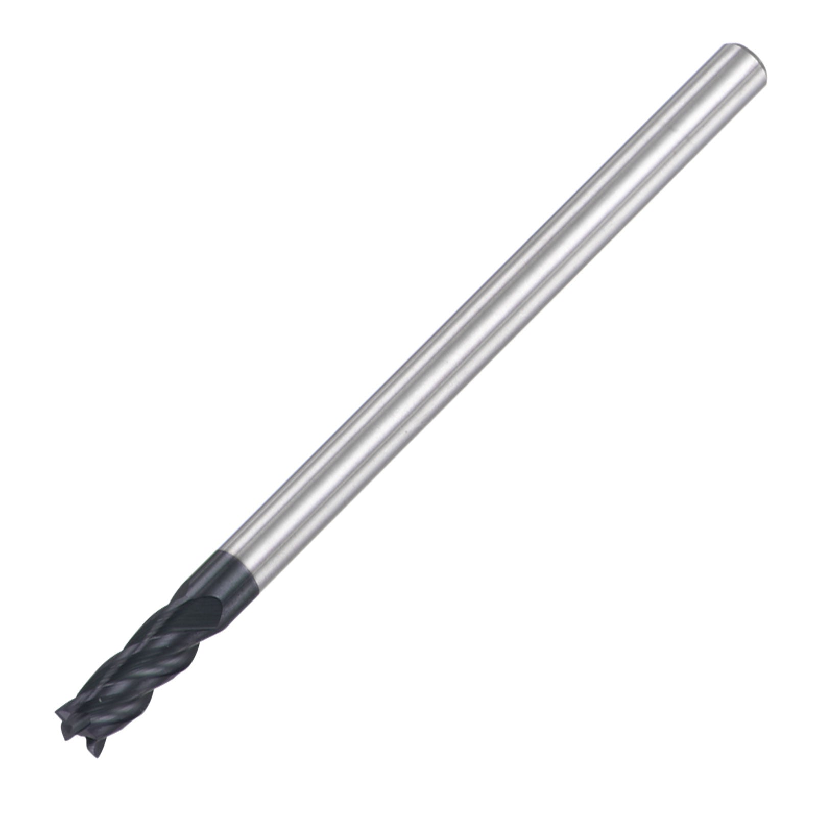 3. Features square end cut, flute design. Spiral chip space design for fast and clean chip removal. Sharp cutting edge provides smooth cutting. AlTiN composite coating can increase hardness, reduce oxidation wear for better wear resistance and extend tool life.