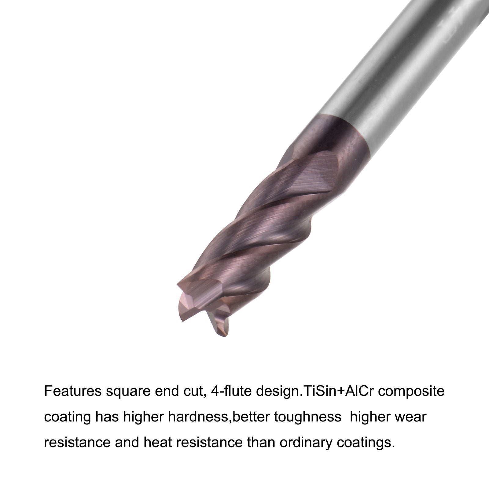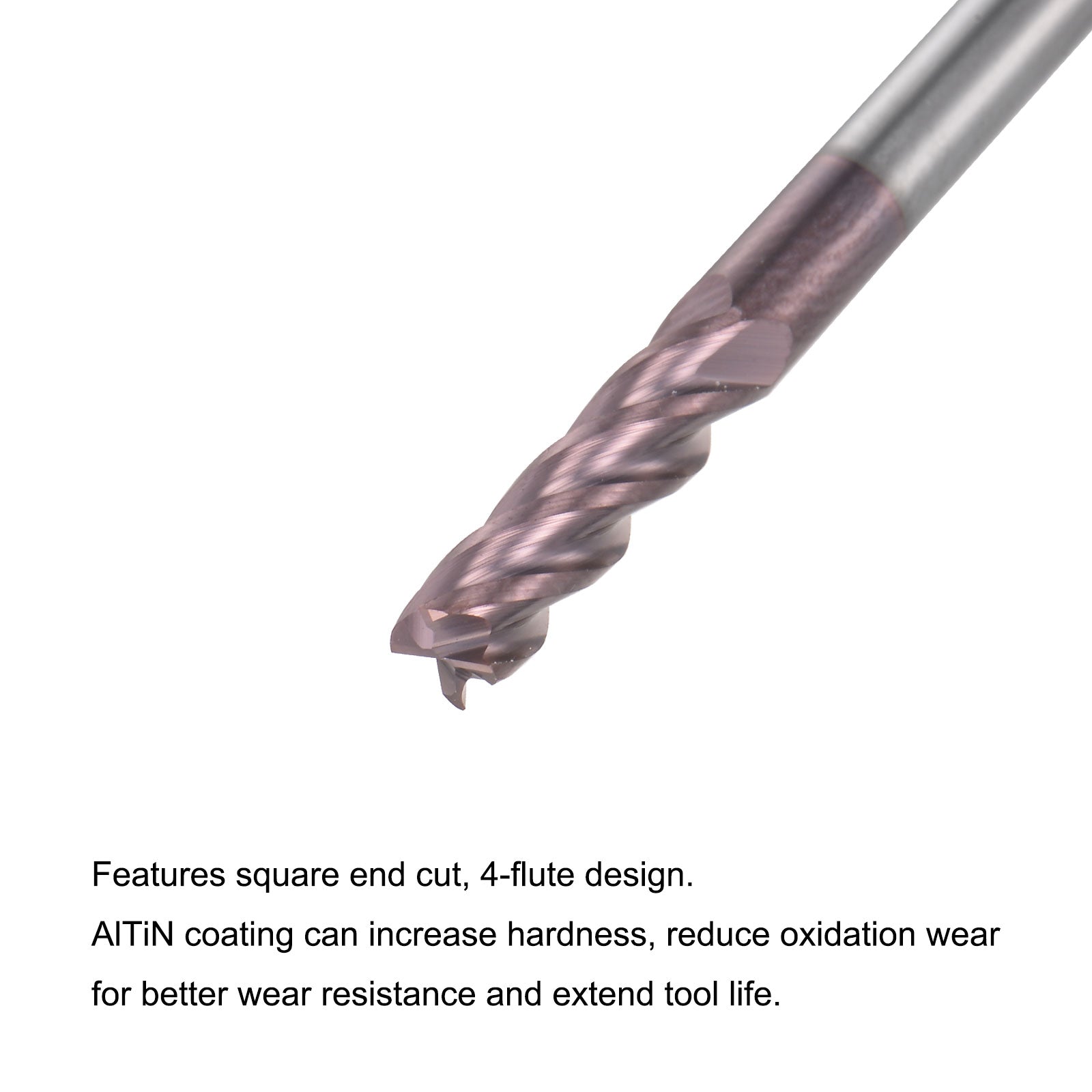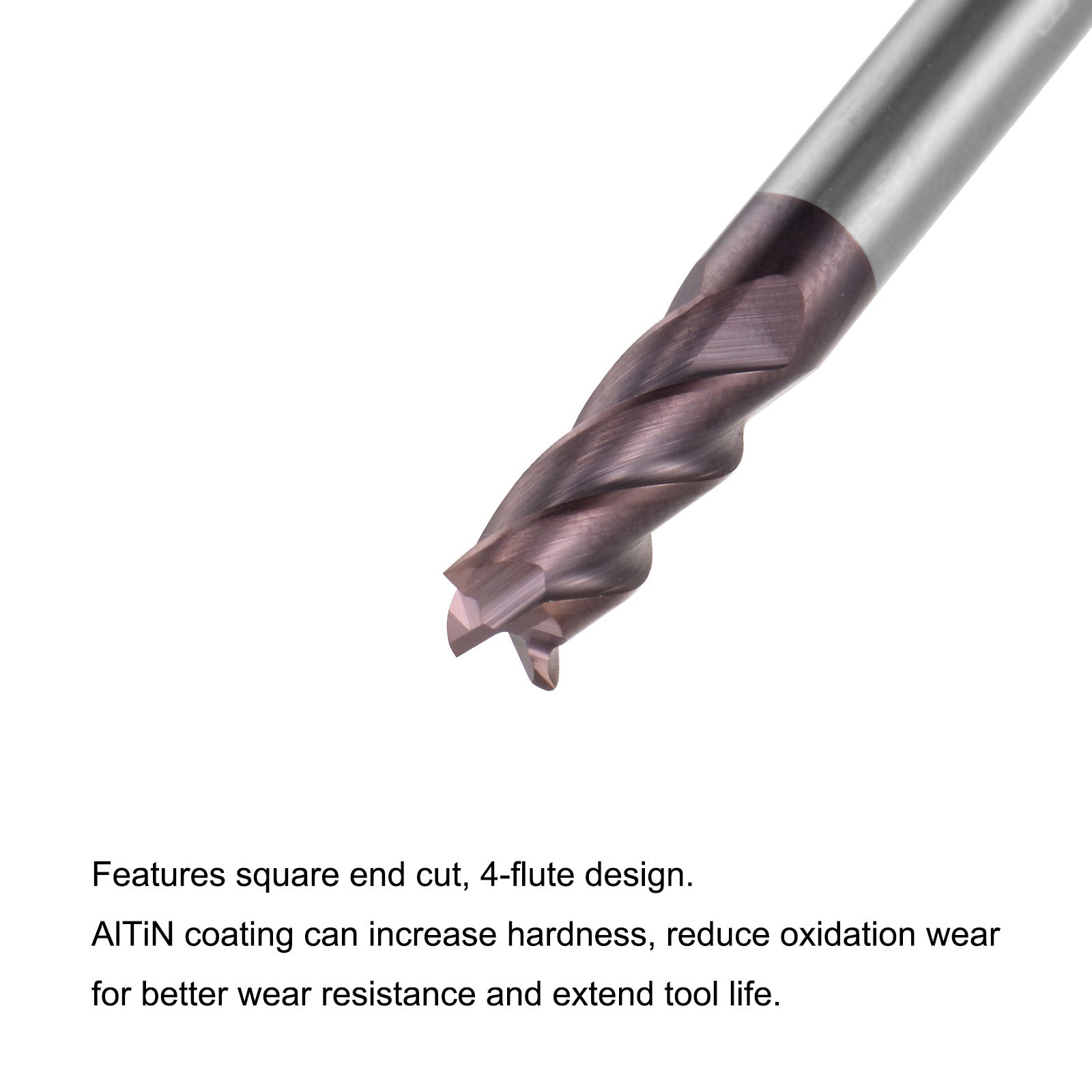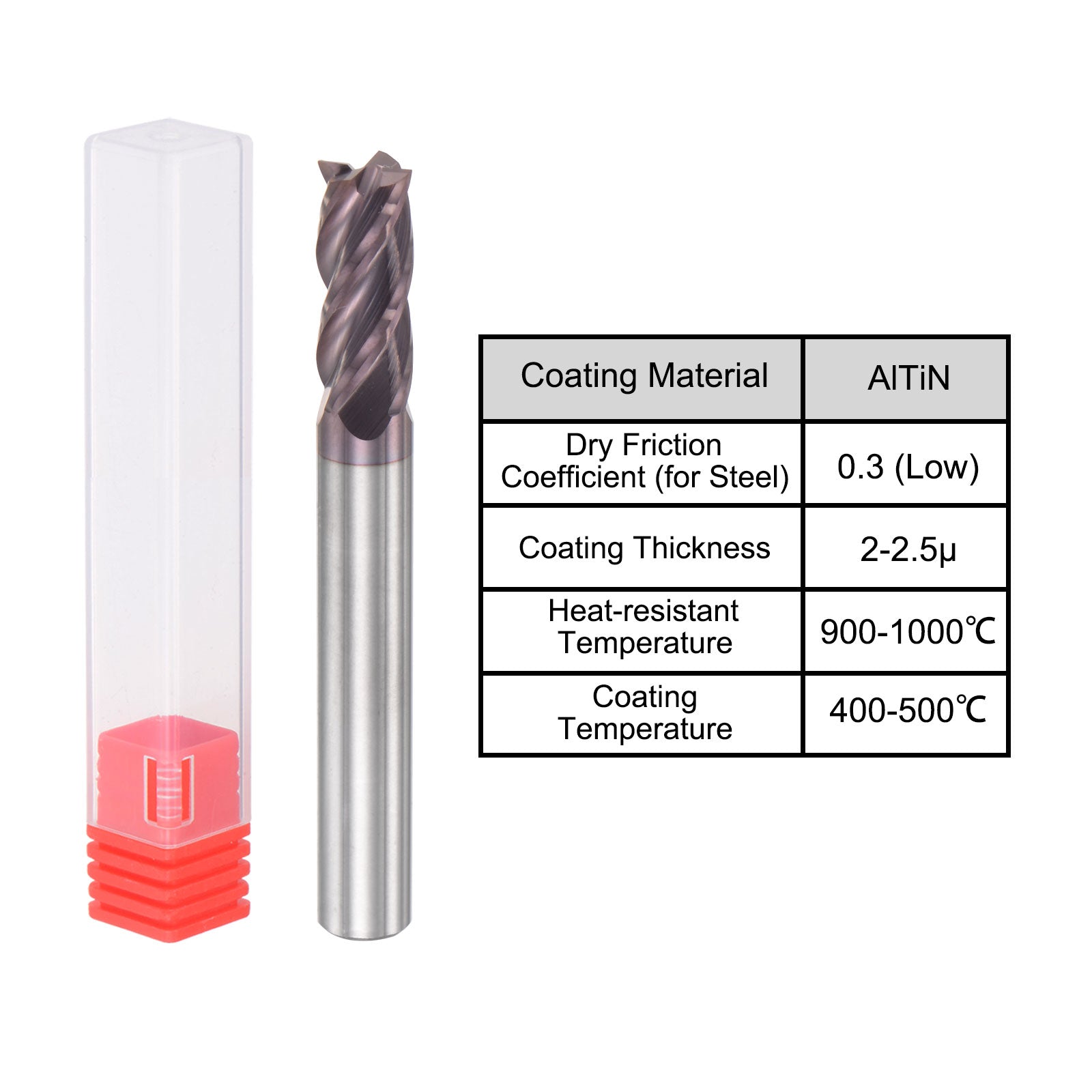 Features Square end cut, flute design, spiral chip space design for fast and clean chip removal. Sharp cutting edge provides smooth cutting. AlTiN composite coating can increase hardness, reduce oxidation wear for better wear resistance and extend tool life.
