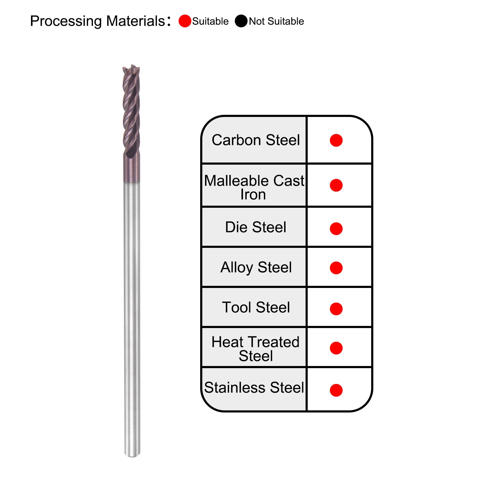 Suitable for cutting carbon steel, malleable cast iron, alloy steel, stainless steel, die steel, tool steel, heat treated steel. For shallow groove machining, side milling and finishing. Use on CNC machining centers, engraving machines and other high-speed CNC machine tools.