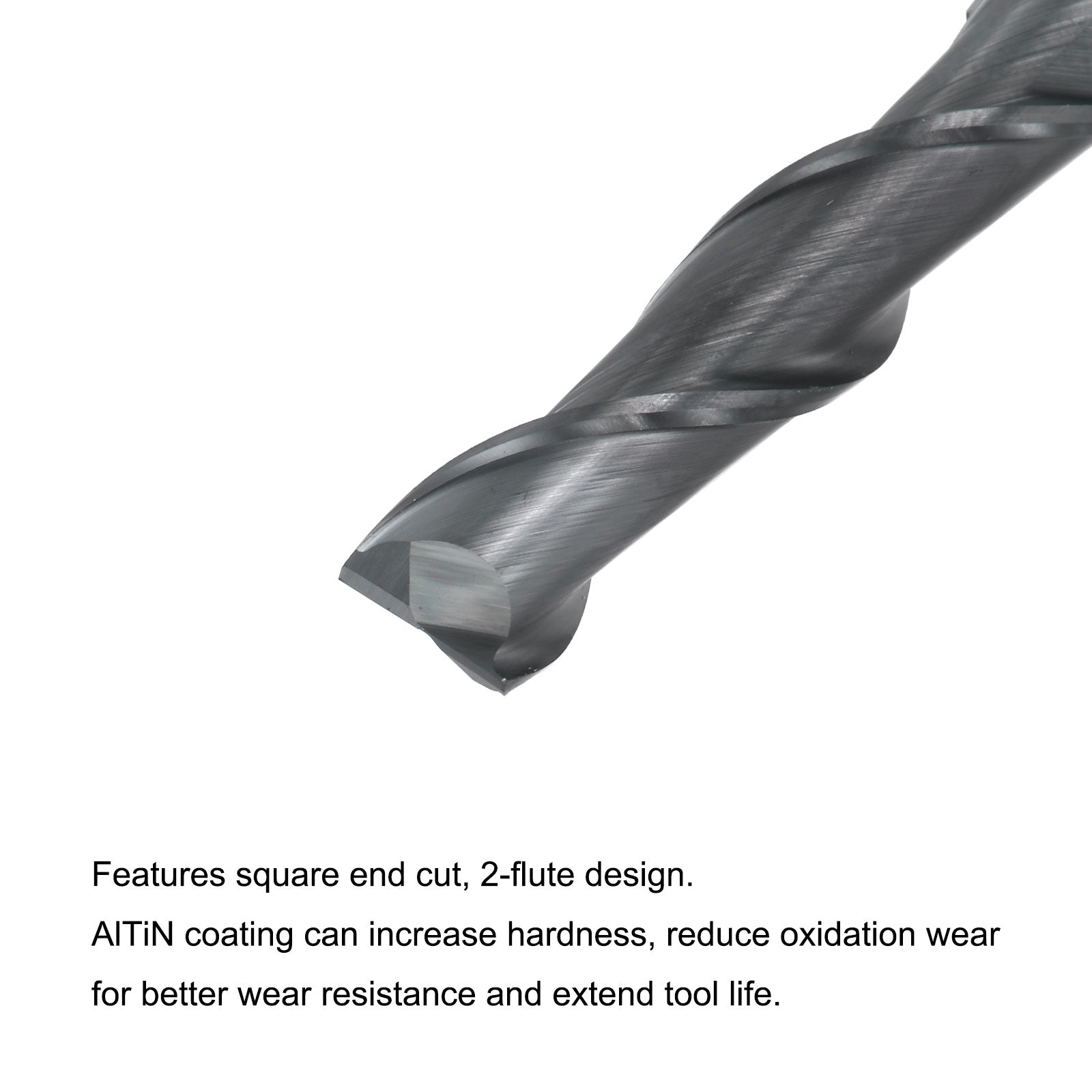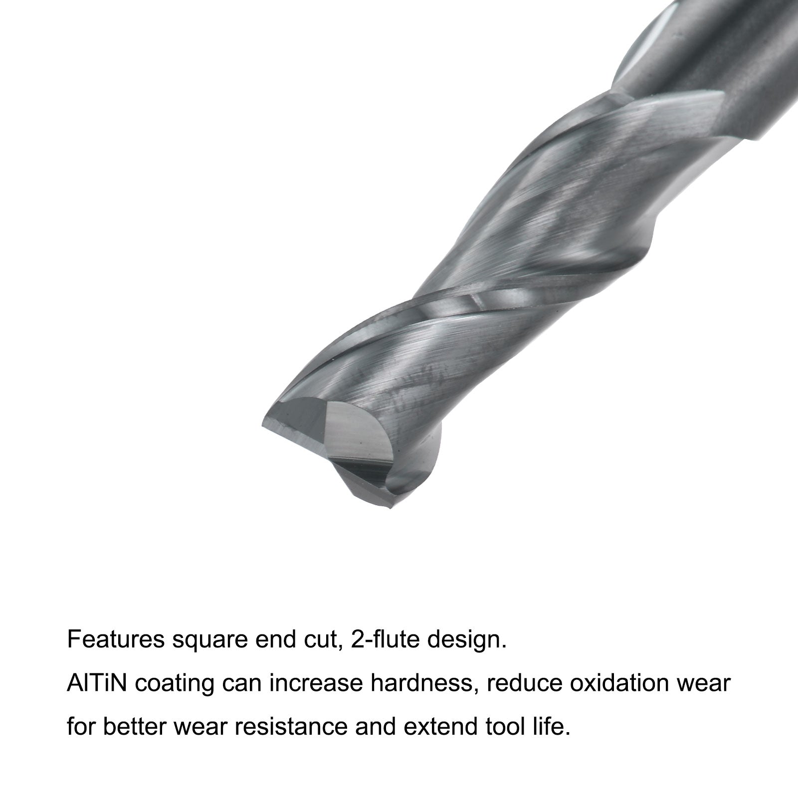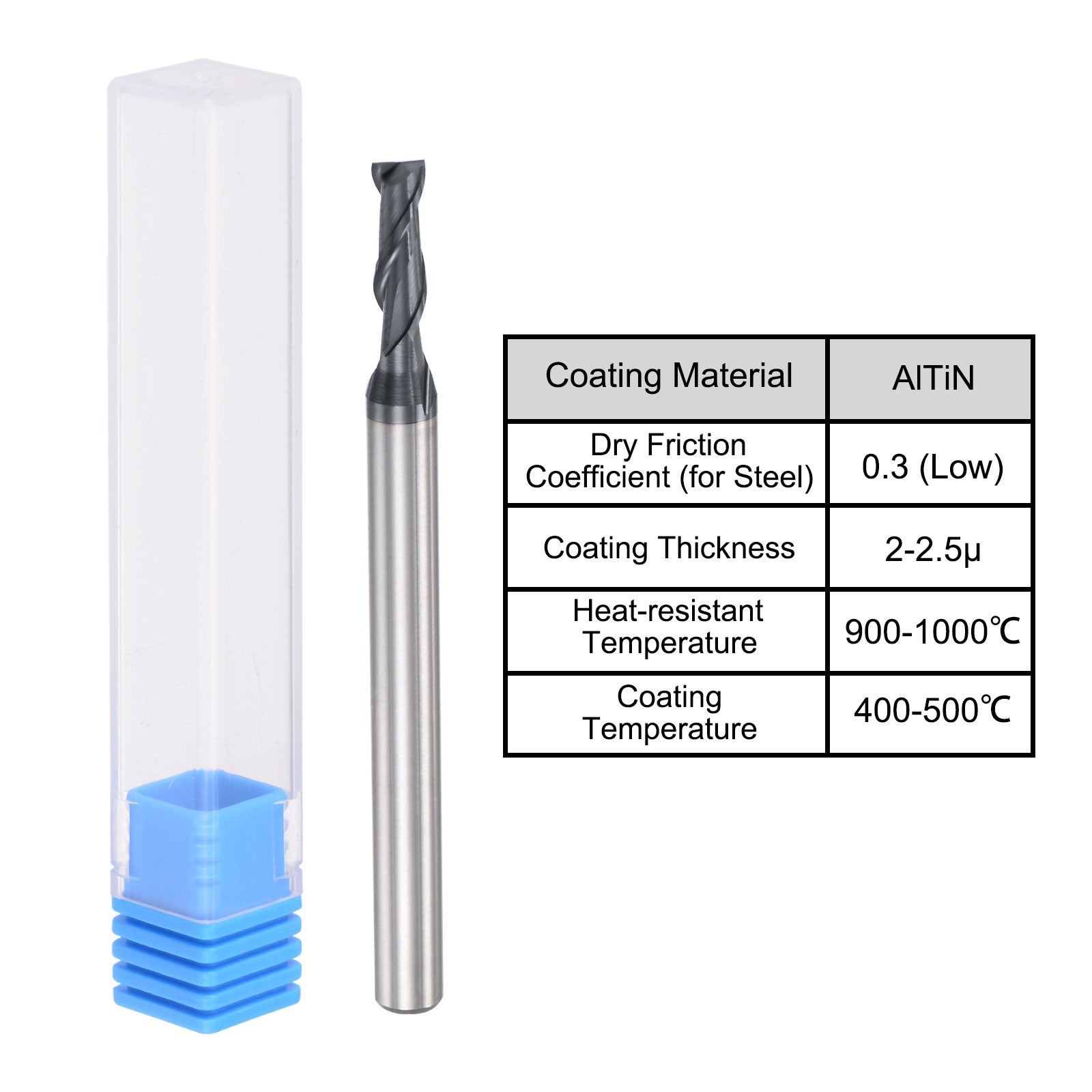 Features square end cut, flute design. Spiral chip space design for fast and clean chip removal. Sharp cutting edge provides smooth cutting. AlTiN composite coating can increase hardness, reduce oxidation wear for better wear resistance and extend tool life.