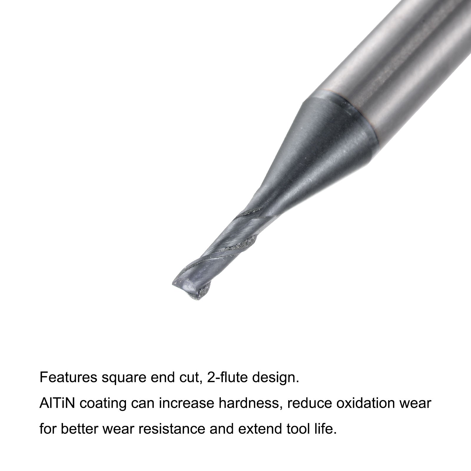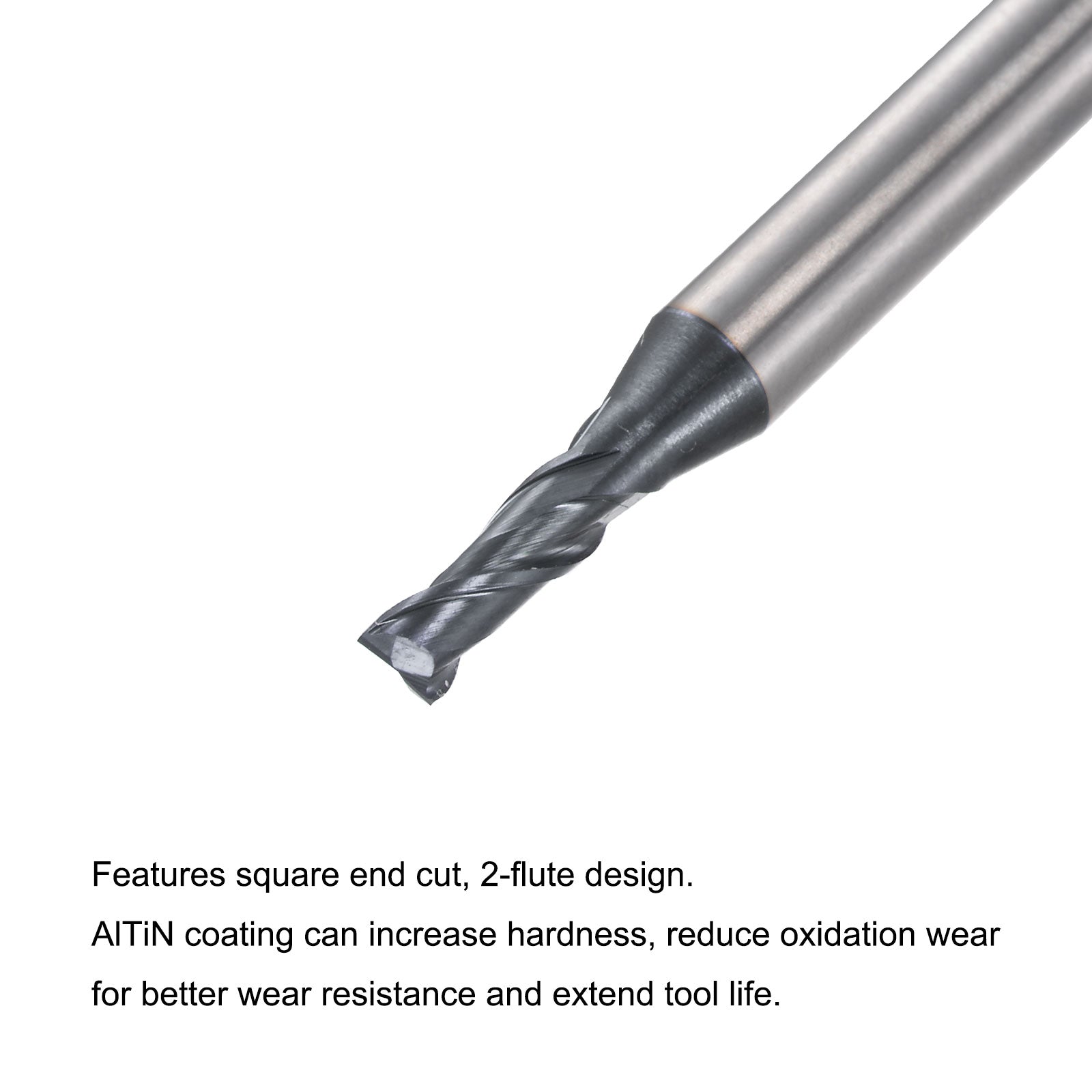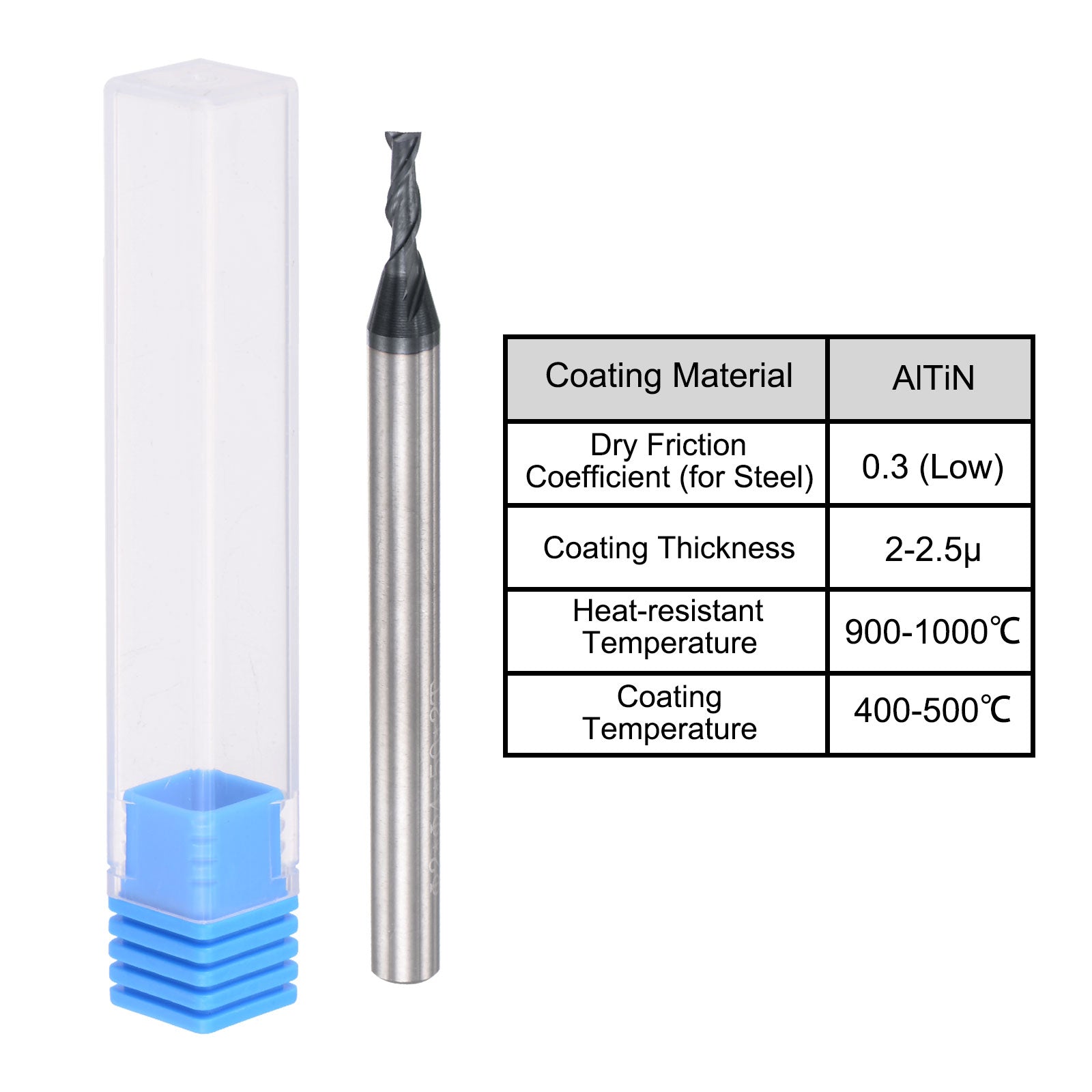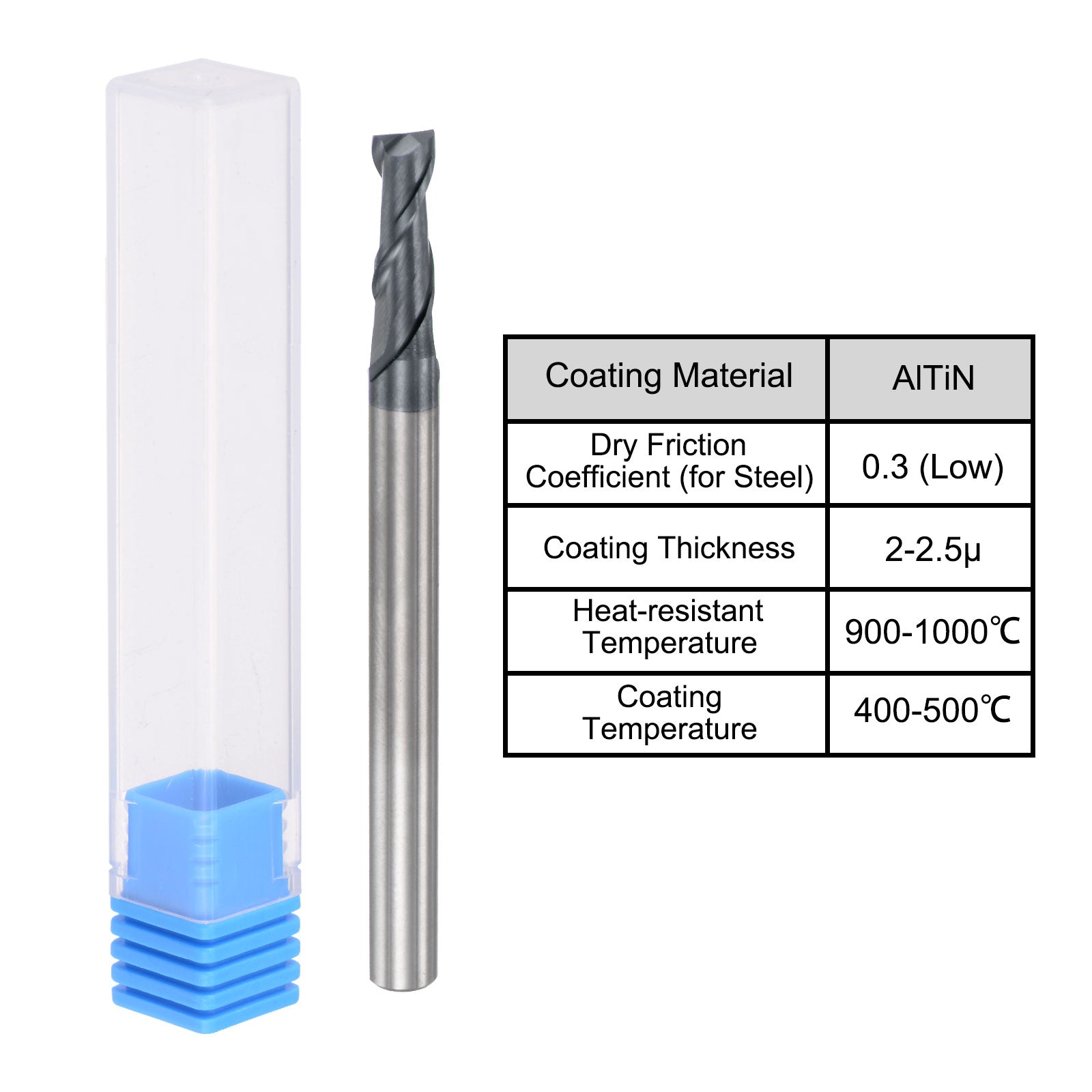 3. Features square end cut, flute design. Spiral chip space design for fast and clean chip removal. Sharp cutting edge provides smooth cutting. AlTiN composite coating can increase hardness, reduce oxidation wear for better wear resistance and extend tool life.
