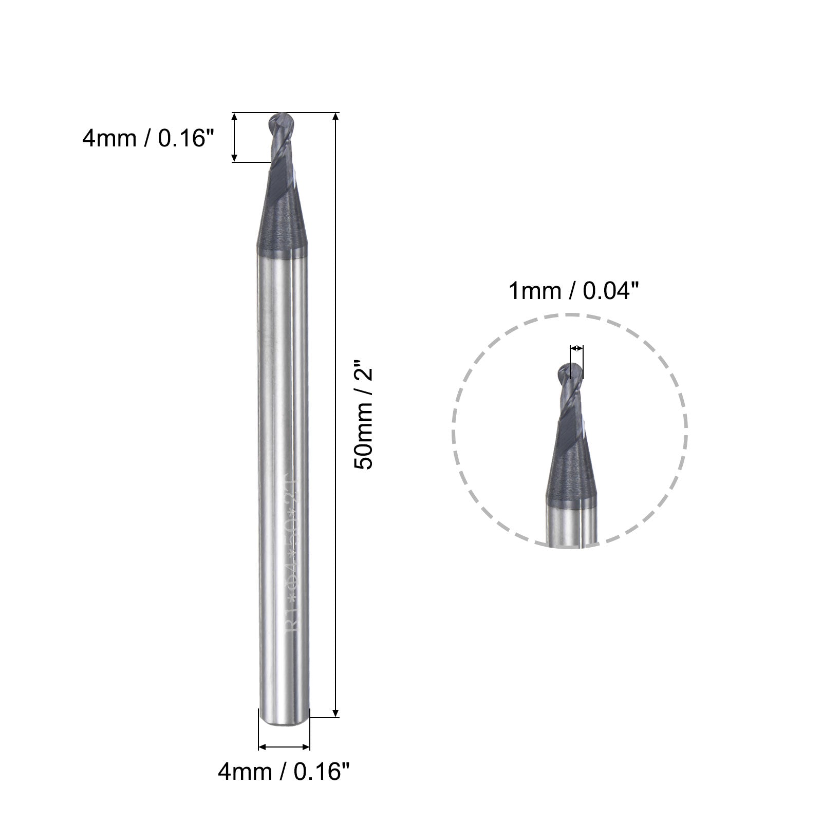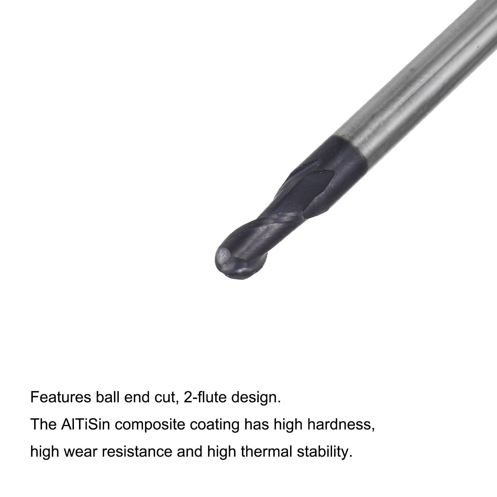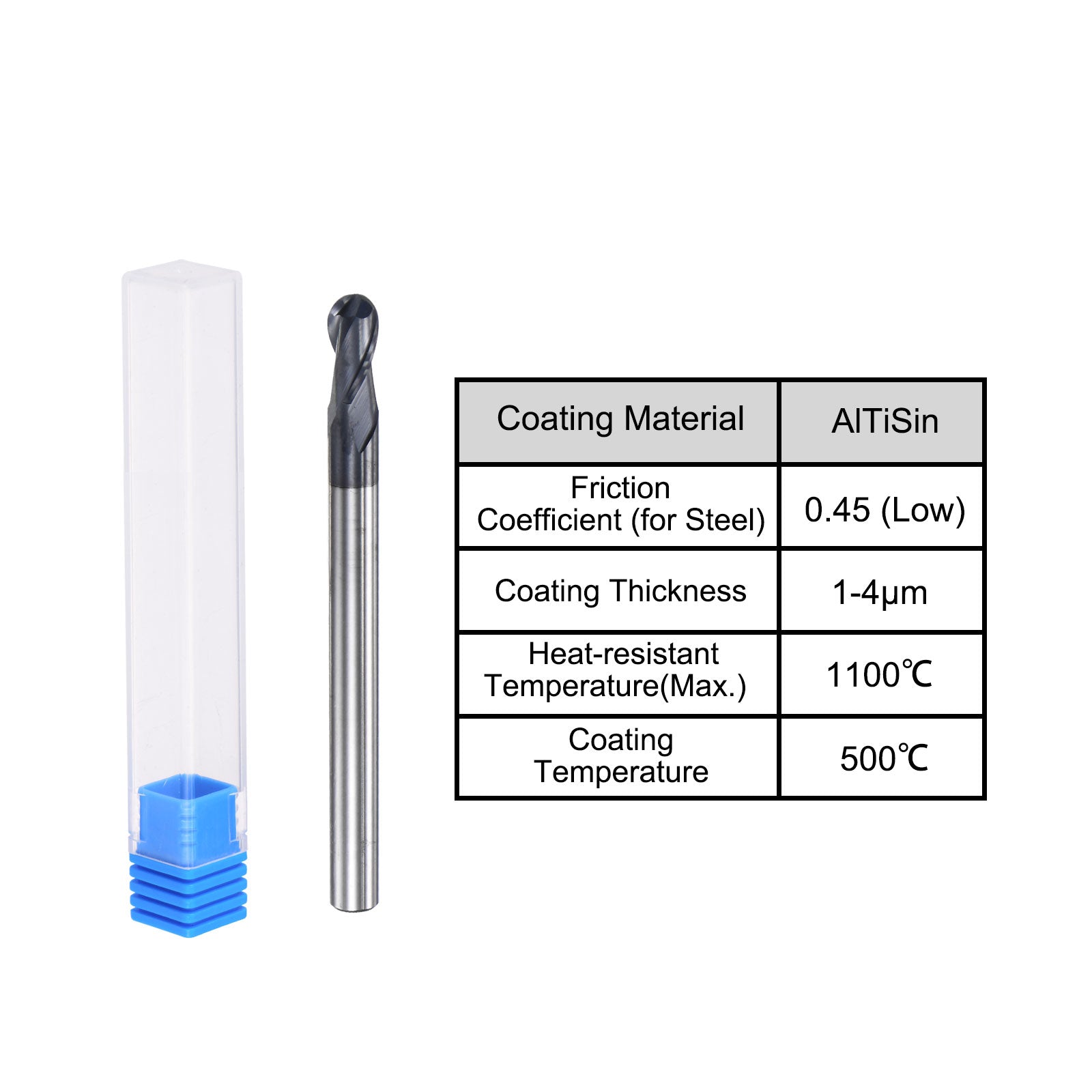 Features ball end cut, flute design. Spiral chip space design for fast and clean chip removal. Sharp cutting edge provides smooth cutting. The AlTiSin composite coating has high hardness, high wear resistance and high thermal stability.