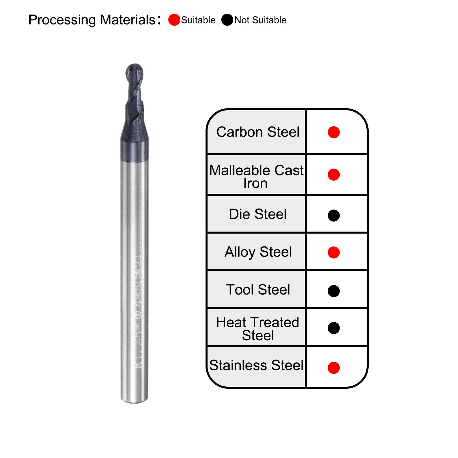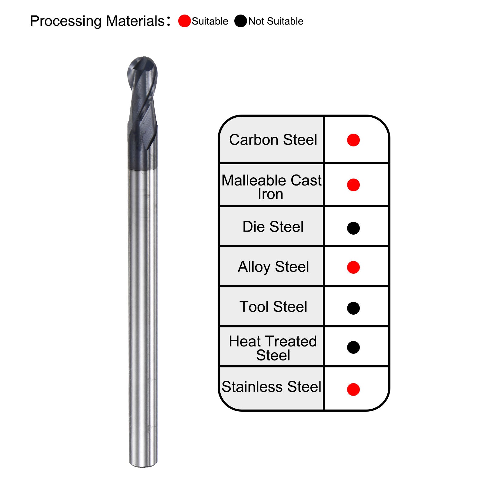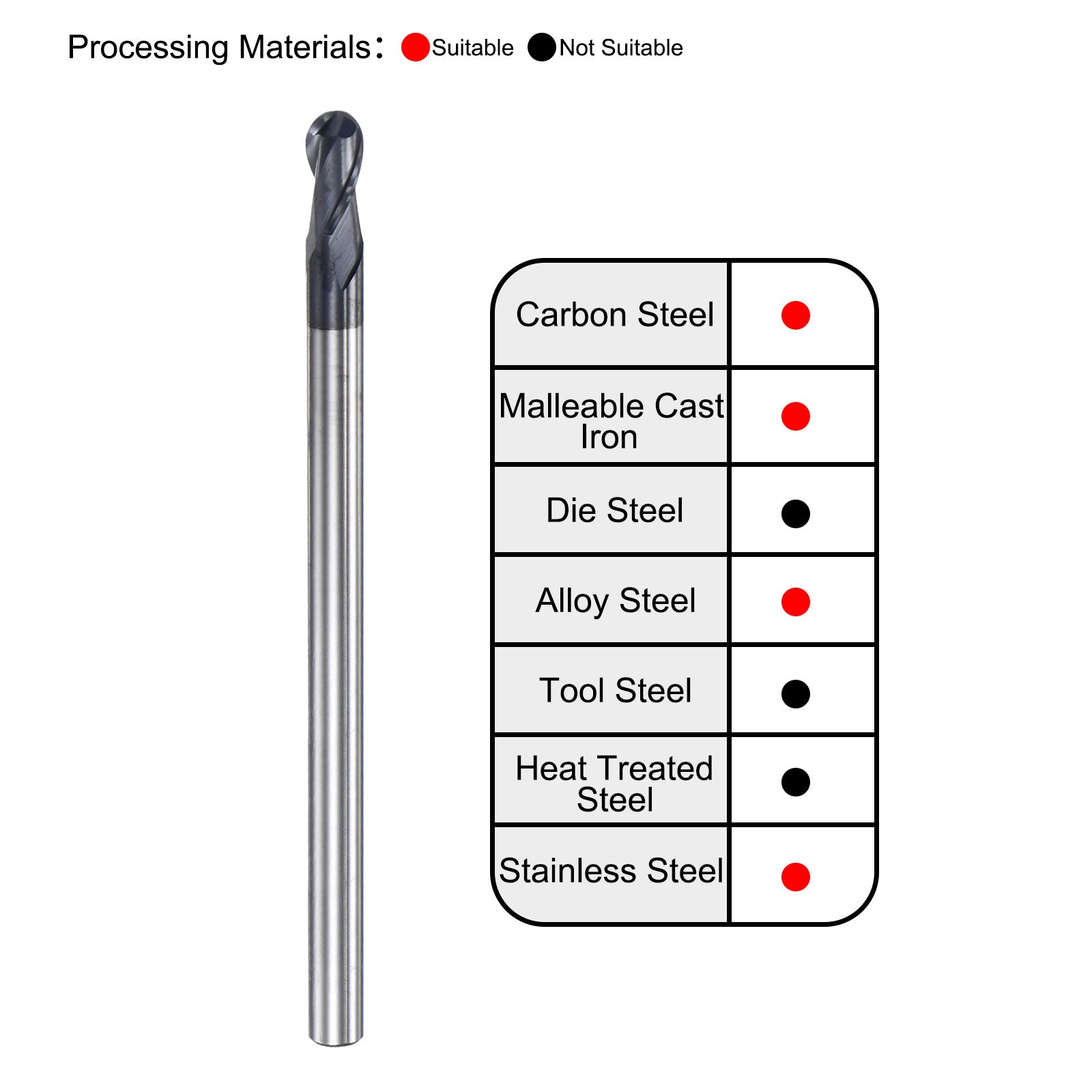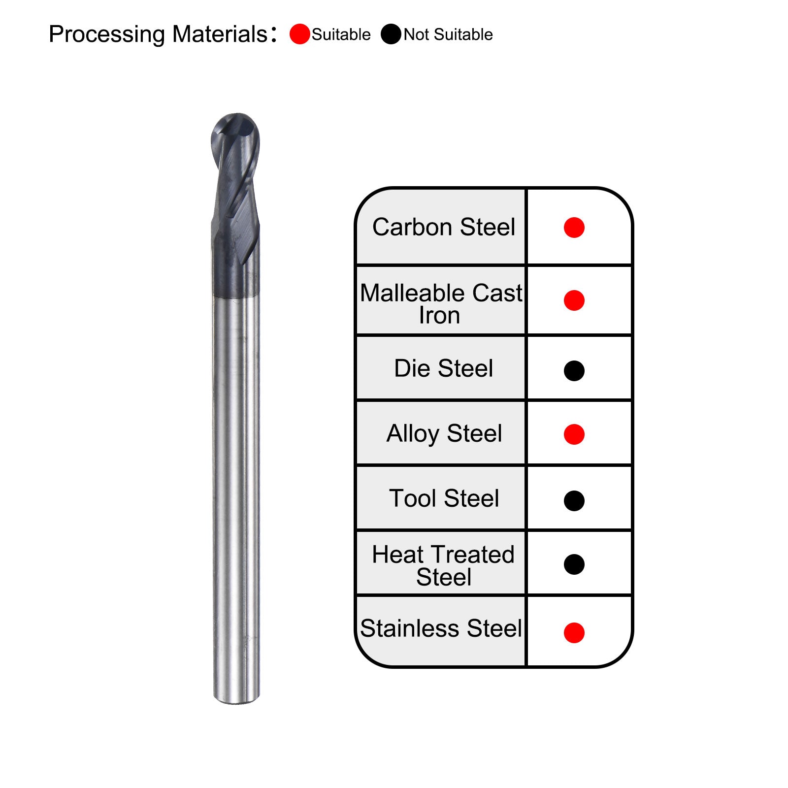 Carbide ball nose end mill is high hardness, wear resistance, and heat resistance. Carbide material with good milling and cutting performance, ensures high work efficiency. Carbide can run at higher speed than high-speed steel.