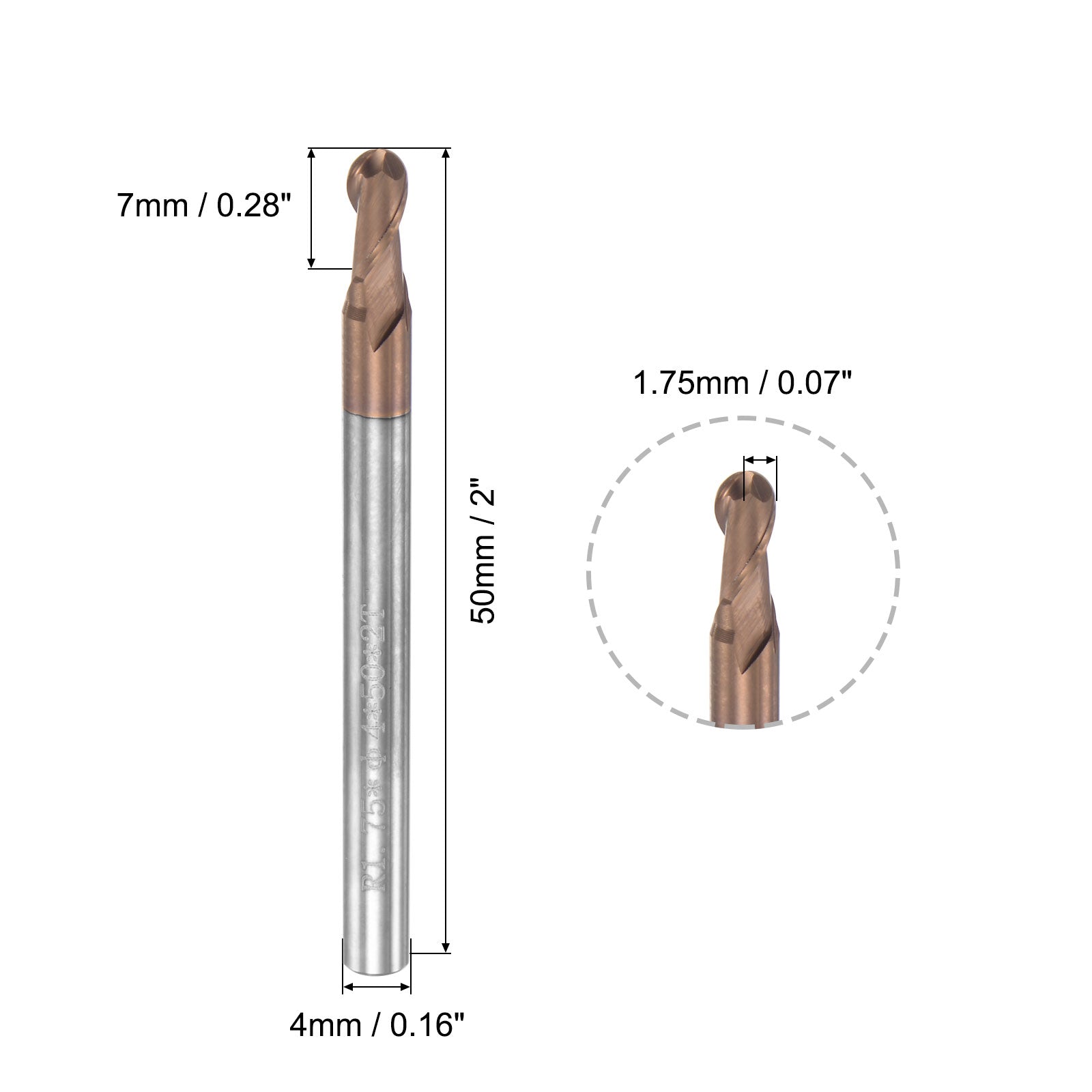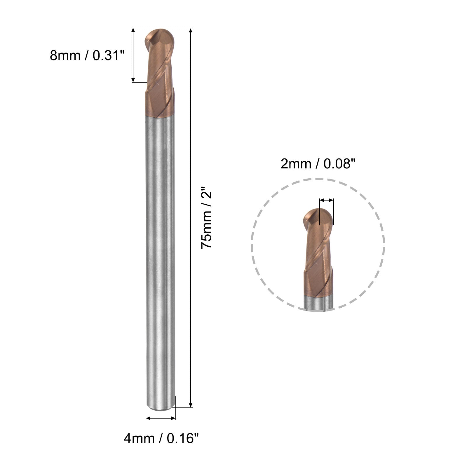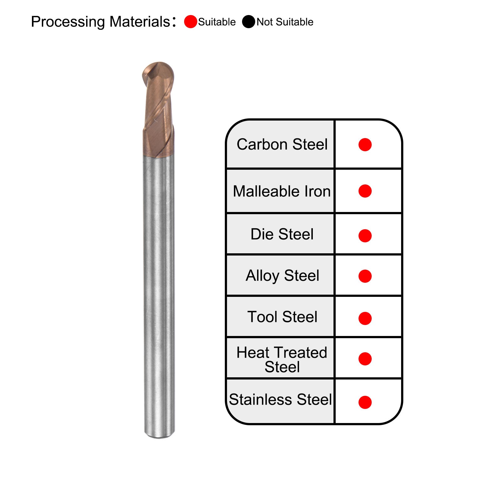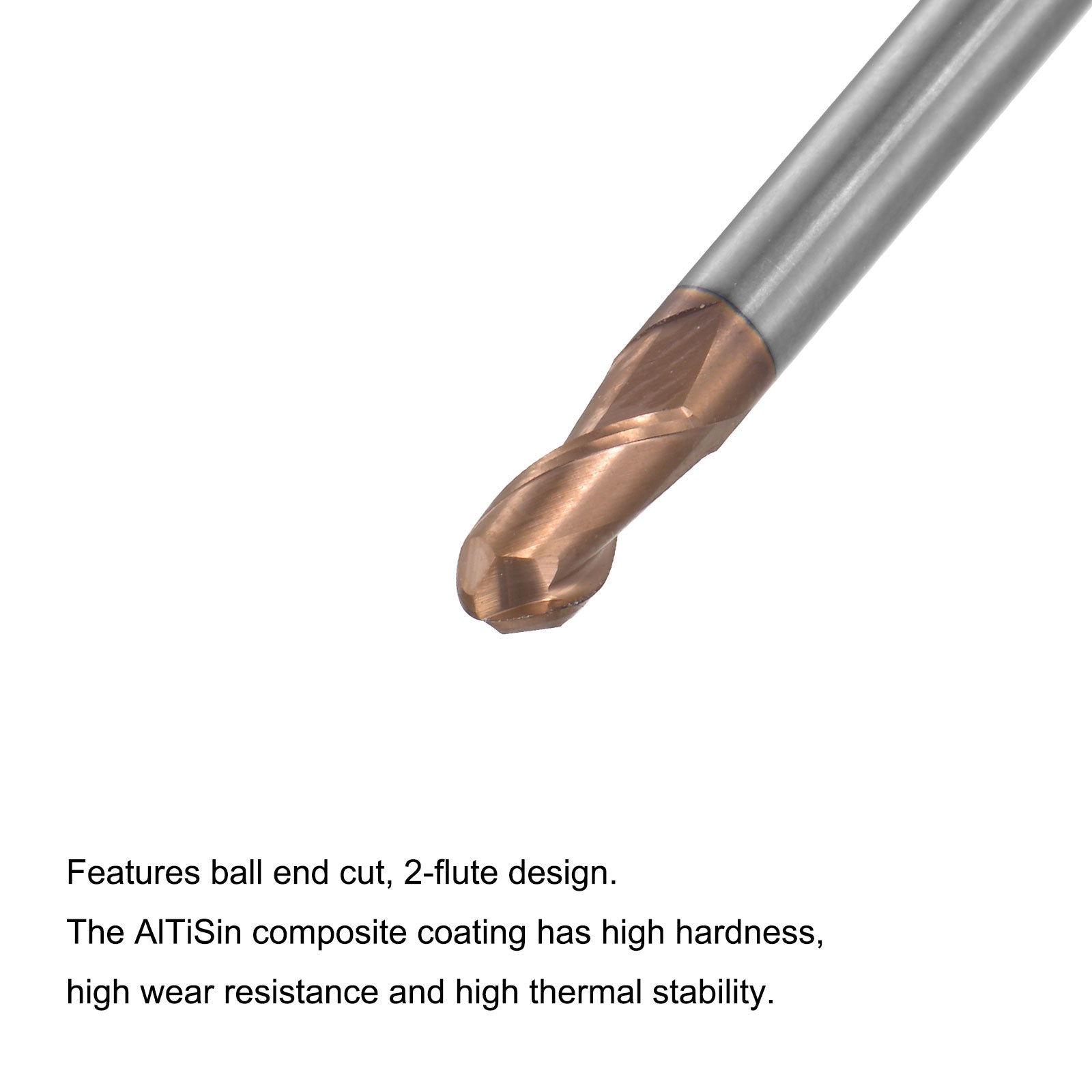 Features ball end cut, flute design. Spiral chip space design for fast and clean chip removal. Sharp cutting edge provides smooth cutting. The AlTiSin composite coating has high hardness, high wear resistance and high thermal stability.