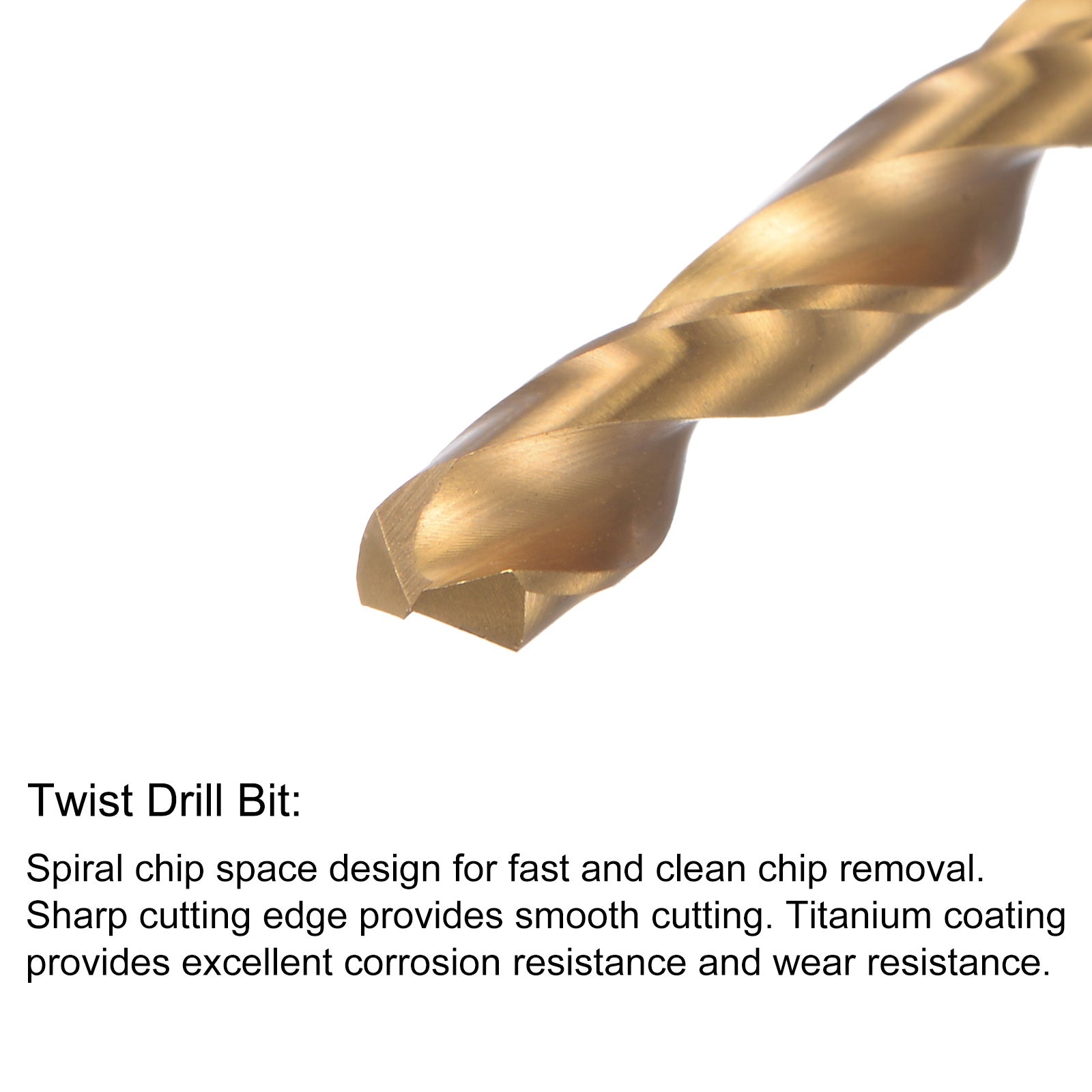 Twist Drill Bit: Spiral chip space design for fast and clean chip removal. Sharp cutting edge provides smooth cutting and no glitches. Titanium coating provides excellent corrosion resistance and improves wear resistance.