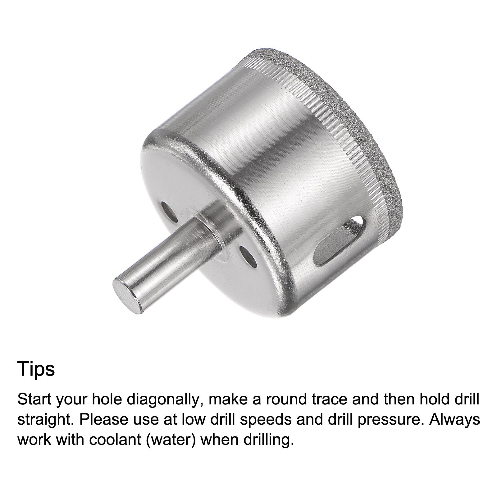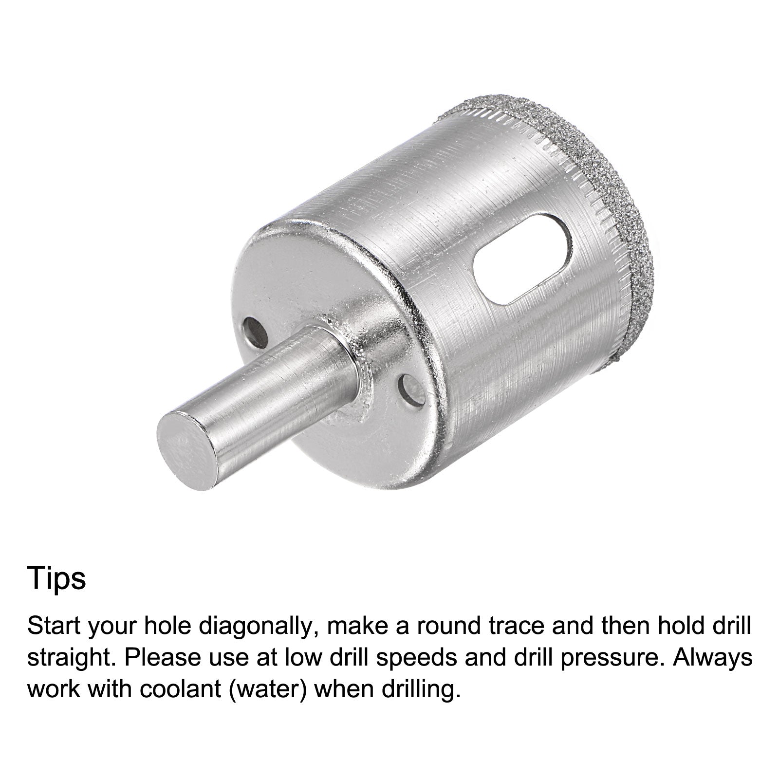 Tips: Start your hole diagonally, make a round trace and then hold drill straight. Please use at low drill speeds and drill pressure. Always work with coolant (water) when drilling. Not suited for use on concrete or for depths beyond about 1/2".