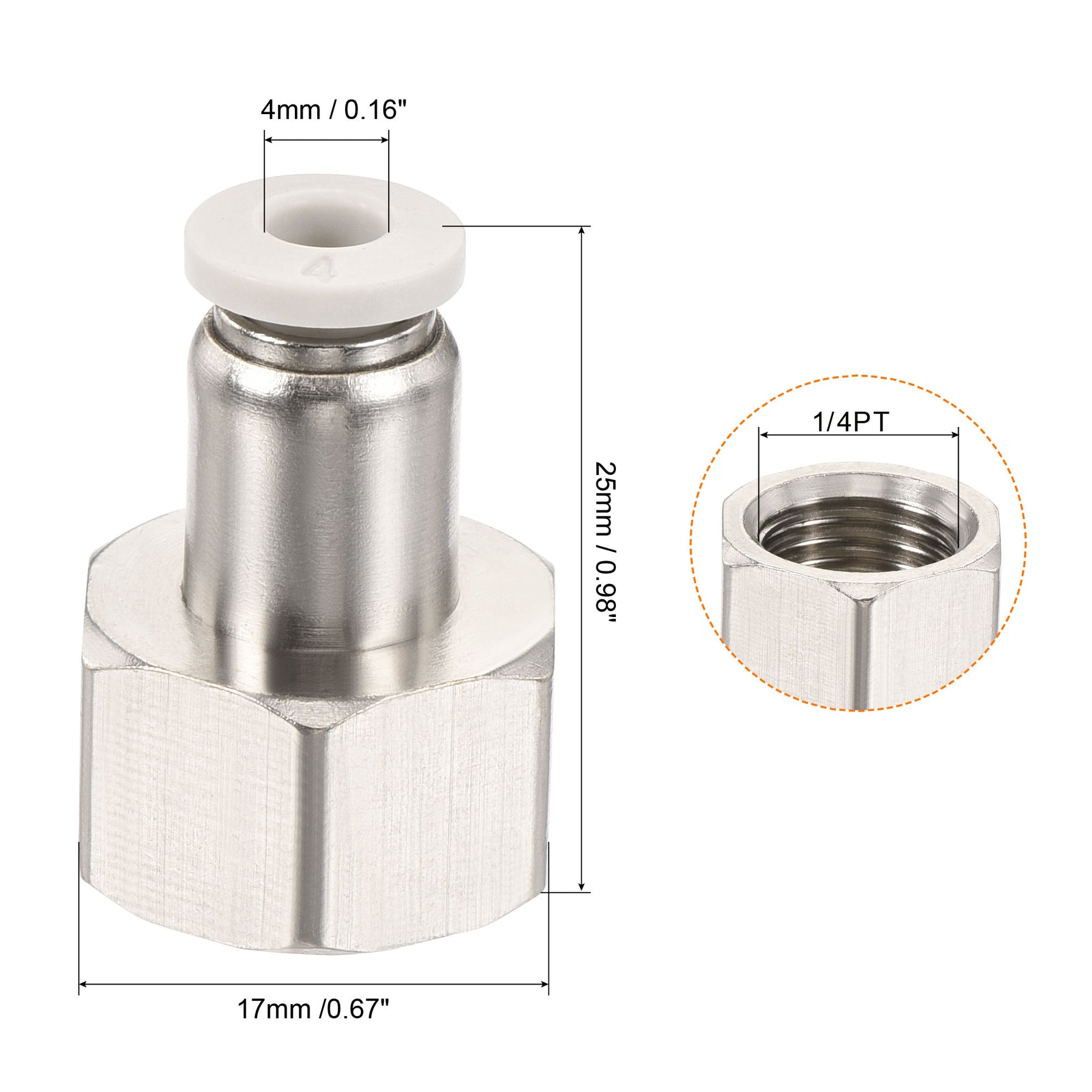 What will I get? Material: Nickel-plated Copper, Plastic Color: Silver Tone, White Female Thread Size: 1/4PT(Approx ID 11.2mm) Fit Tube OD: 6mm / 0.24inch Operating Pressure: 0-0.8MPa Operating Temperature: 0 - 60 Degree Celsius Size: 26mm x 17mm / 1.02inch x 0.67inch(L*Hex.W) Package Content: 6Pcs x 6mm to 1/4PT Female Connector