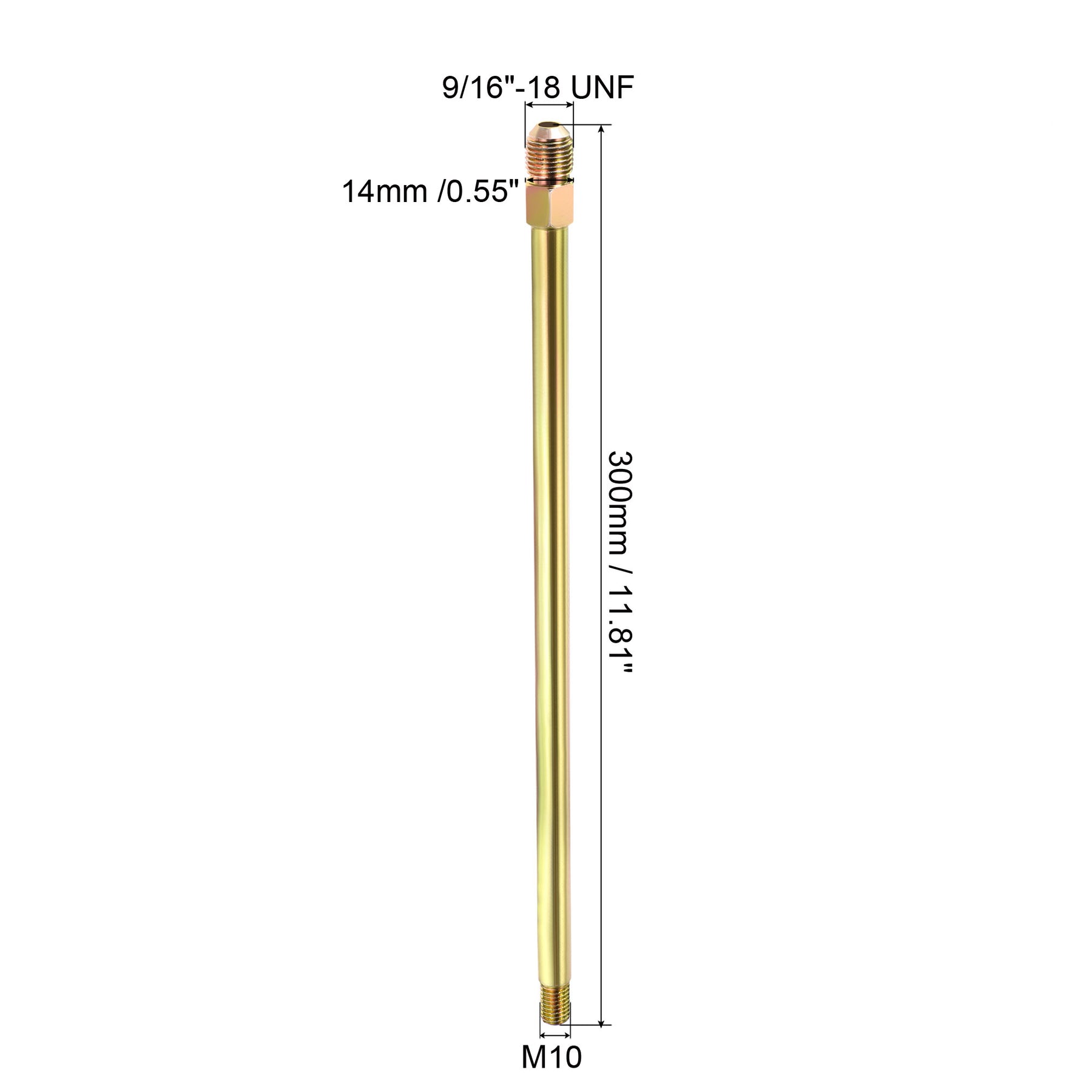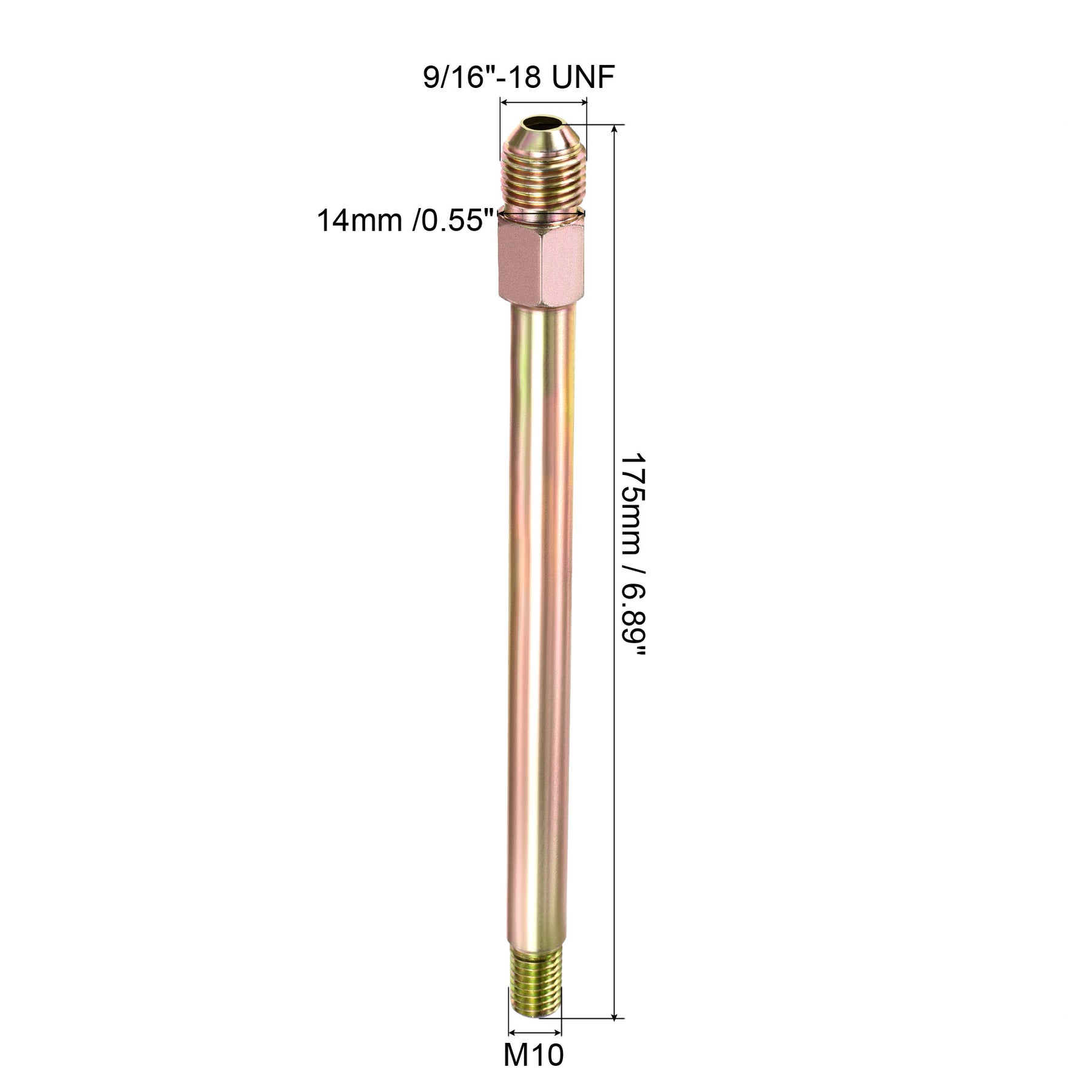 Brass pipe fitting, we provide here, are in the size of: Material: Iron; Thread Size: 9/16"-18 UNF Male to M10 Male; Threading distance: 1.5mm / 0.06 inch; Size: 200 x 14mm / 7.87 x 0.55 inch (L*W)