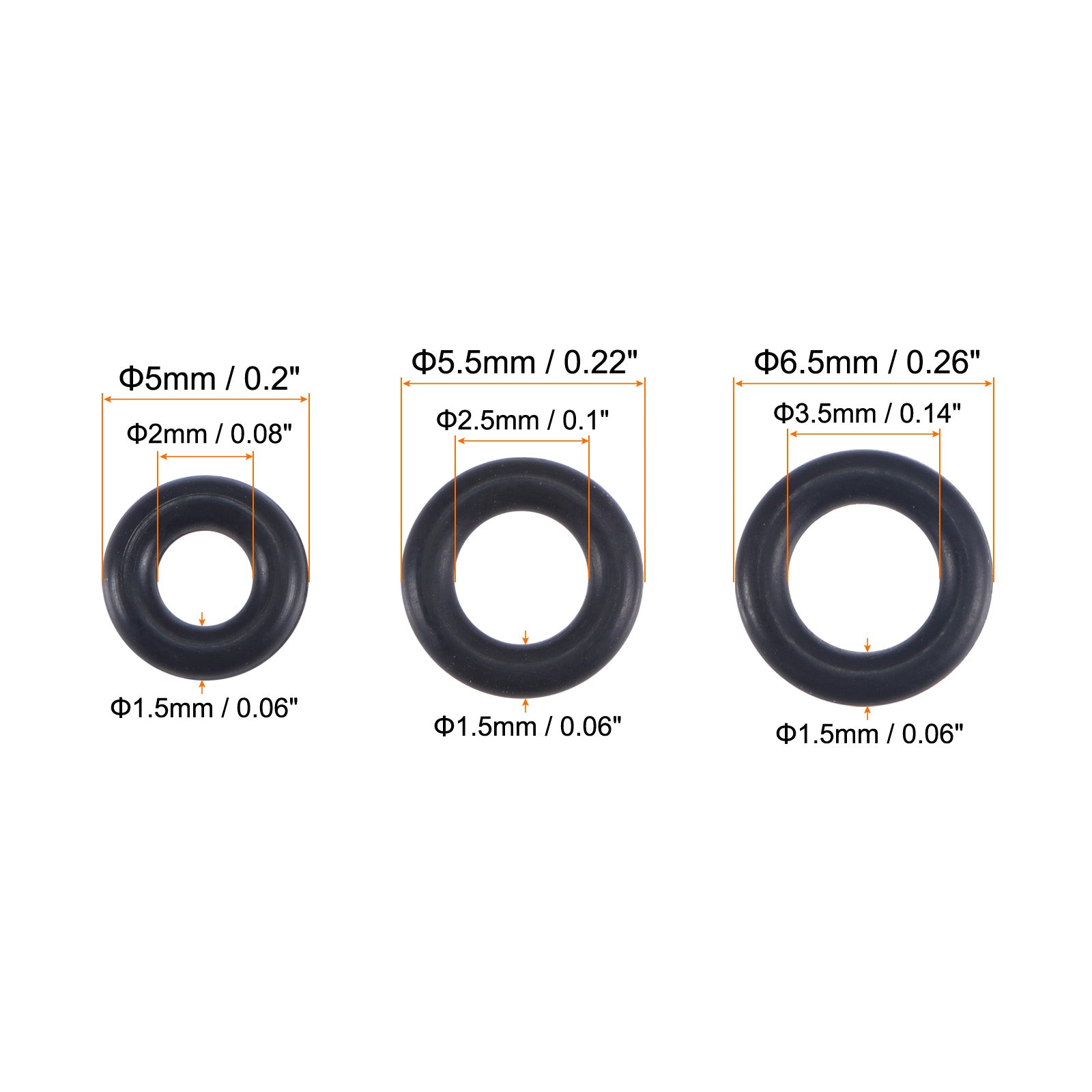 What will I get? Color: Black Hardness: 70A Material: Nitrile Butadiene Rubber Temperature Range: -4 (-20 ) to 212 (100 ) Cross-Section Diameter: 1.5mm / 0.06-inch Inner Diameter: 2mm / 0.08-inch; 2.5mm / 0.1-inch; 3.5mm / 0.14-inch Outer Diameter: 5mm / 0.2-inch; 5.5mm / 0.22-inch; 6.5mm / 0.26-inch Package Contents: 50pcs x 5x2x1.5mm O-Rings, 50pcs x 5.5x2.5x1.5mm O-Rings, 50pcs x 6.5x3.5x1.5mm O-Rings