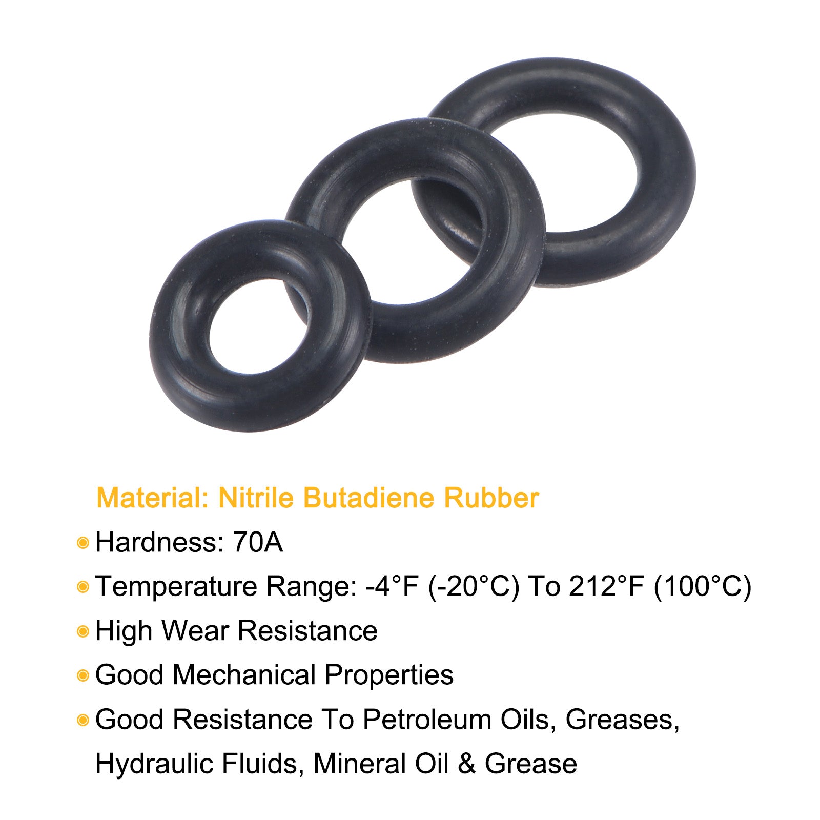 Material: Nitrile Butadiene Rubber; Hardness: 70A; Temperature Range: -4℉ (-20℃) to 212℉ (100℃); Package Contents: 50pcs x 5x2x1.5mm O-Rings, 50pcs x 5.5x2.5x1.5mm O-Rings, 50pcs x 6.5x3.5x1.5mm O-Rings