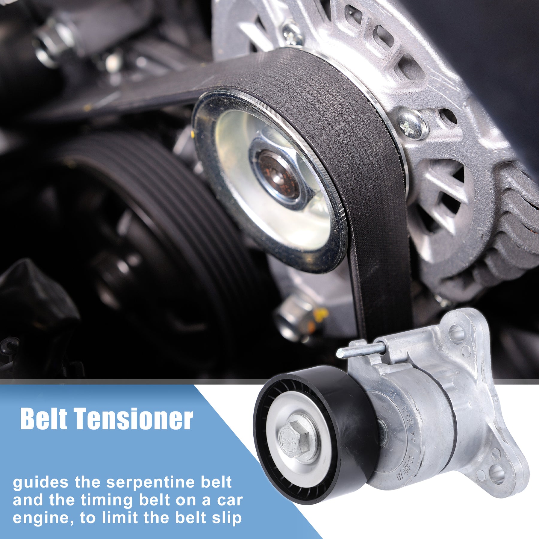 [Function] A belt tensioner or/and idler pulley is a system that guides the serpentine belt and the timing belt on a car engine. The function of a pulley and a tensioner is to limit the belt slip. The belt tensioner can be mechanic (spring-loaded) or hydraulic.