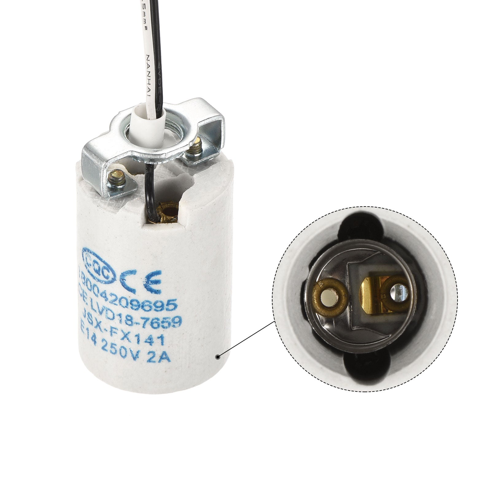 What will I get? Color: White, Silver Tone Material: Ceramic, Copper Power: 75W Max Voltage: AC 250V Wire Length: 300mm / 12 inch Wire Specification: 20AWG Pipe Length: 20mm/ 0.78 inch Thread of Lamp Pipe Interface: M10 (Compatible 1/8IP) Socket Size: 27x48mm / 1"x1.89" (D*H) Package Content: 8 x E14 Bulb Socket