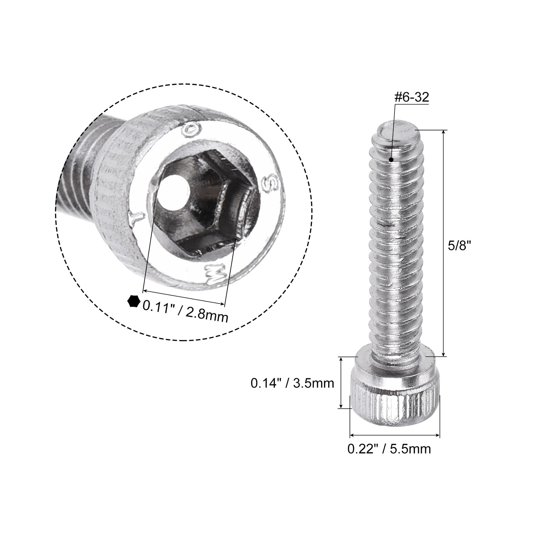 Specification: Product Name: Hex Socket Head Bolt Color: Silver Tone Material: 304 Stainless Steel Surface Treatment: Polished Processing Technology: Cold Forging+Thread Rolling Thread Diameter: #6-32 Screw Length: 5/8" Head Size: 5.5 x 3.5mm / 0.22" x 0.14"(D*H) Hex Socket Head Width: 2.8mm / 0.11"