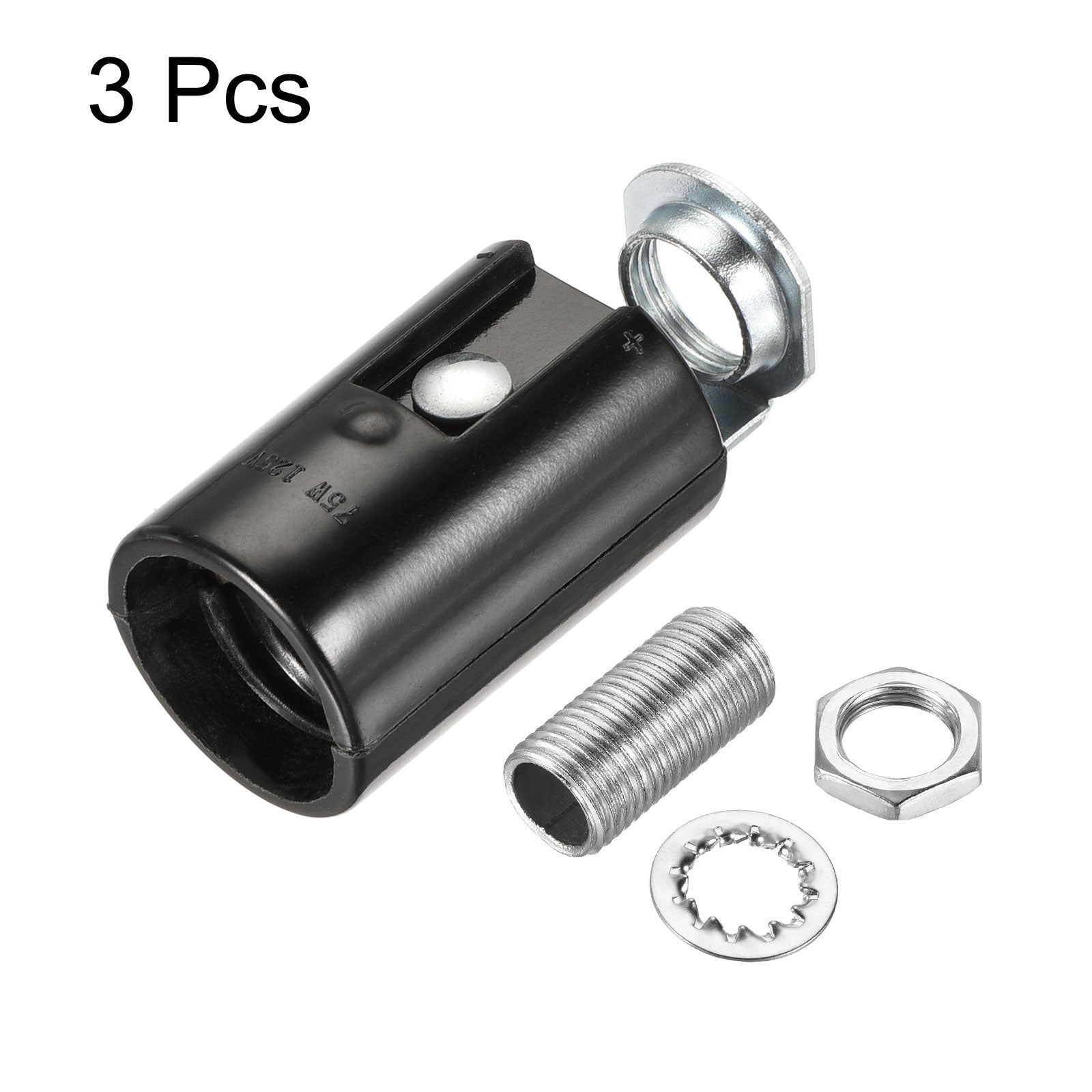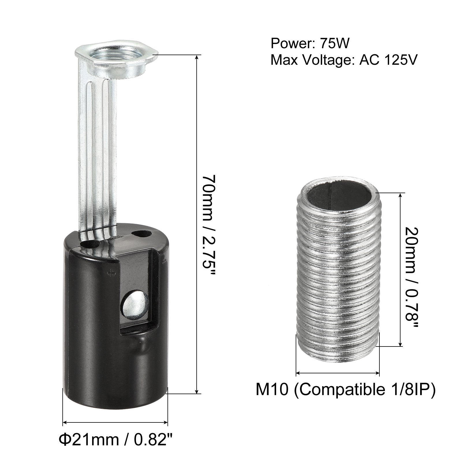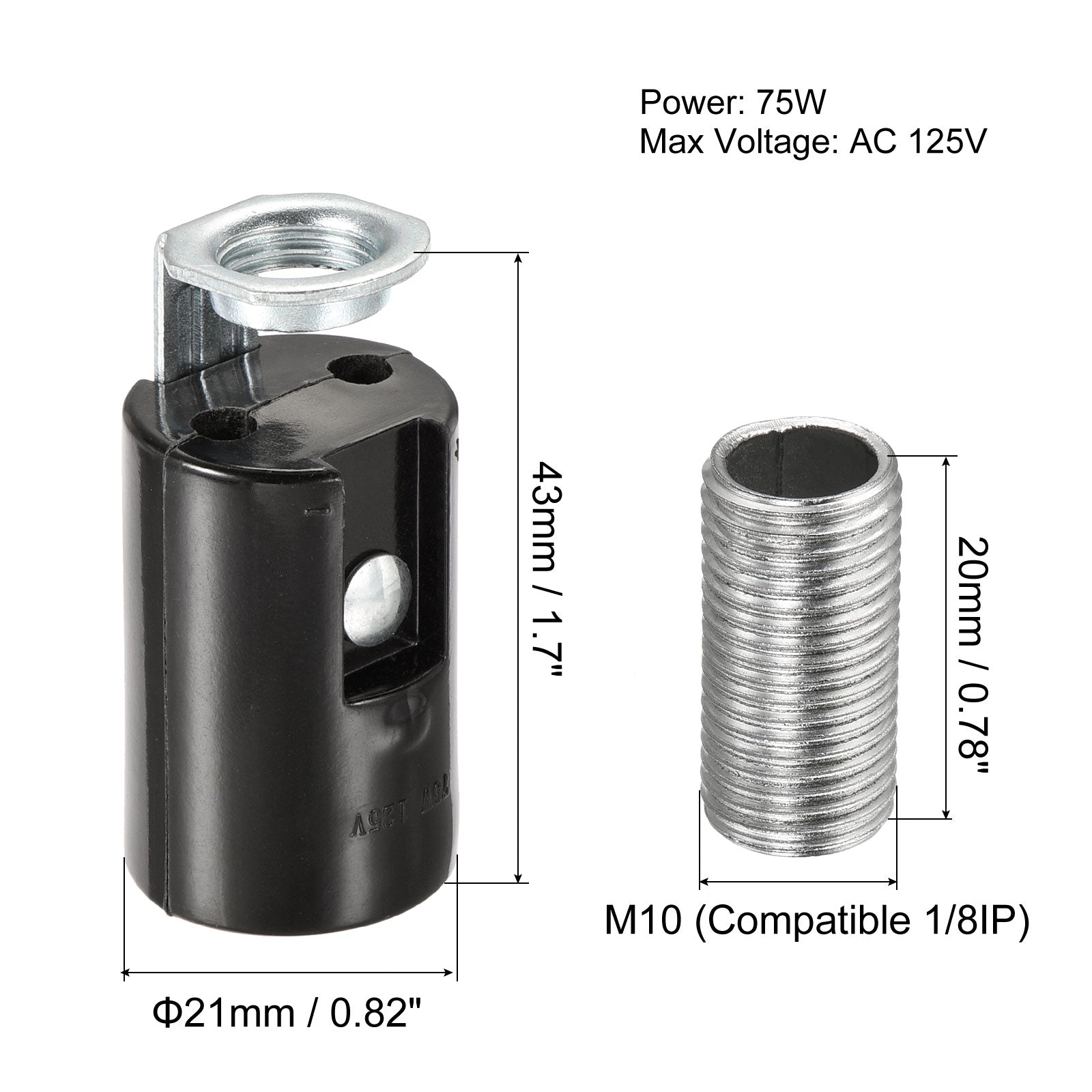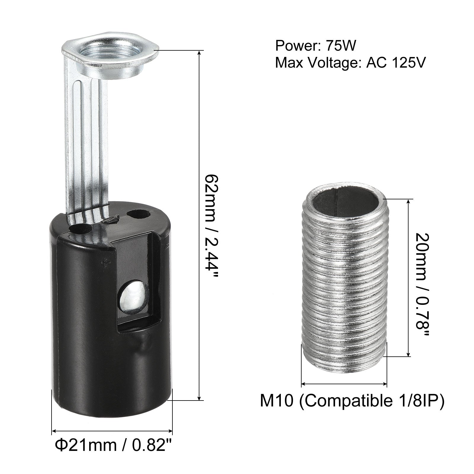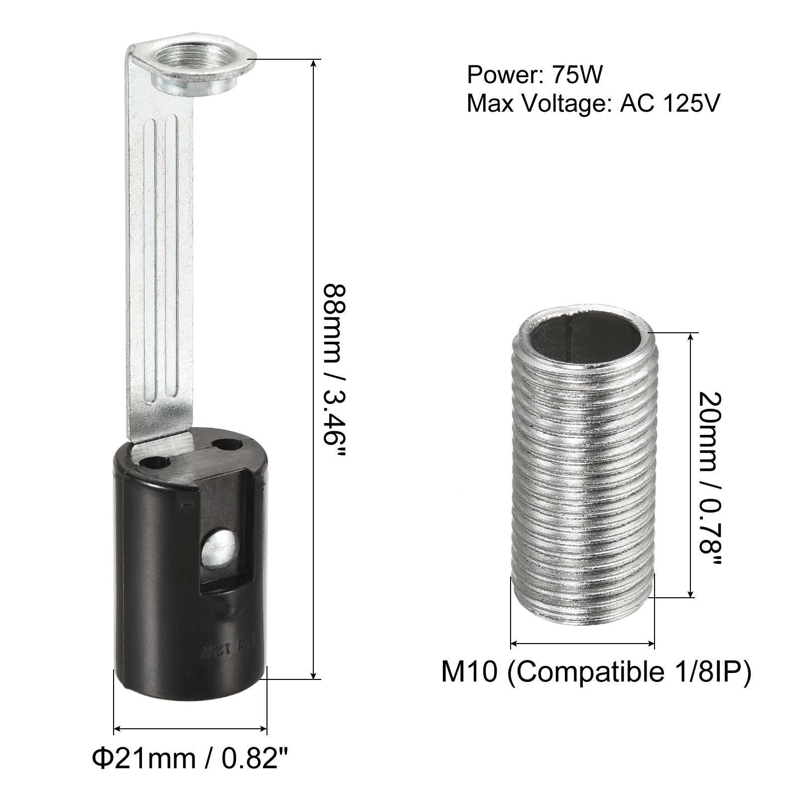 What will I get? Color: Black, Silver Tone Power: 75W Max Voltage: AC 125V Pipe Length: 20mm/ 0.78 inch Thread of Lamp Pipe Interface: M10 (Compatible 1/8IP) Socket Size: 21x95mm / 0.82"x3.74" (D*H) Package Content: 3 x E14 Bulb Socket