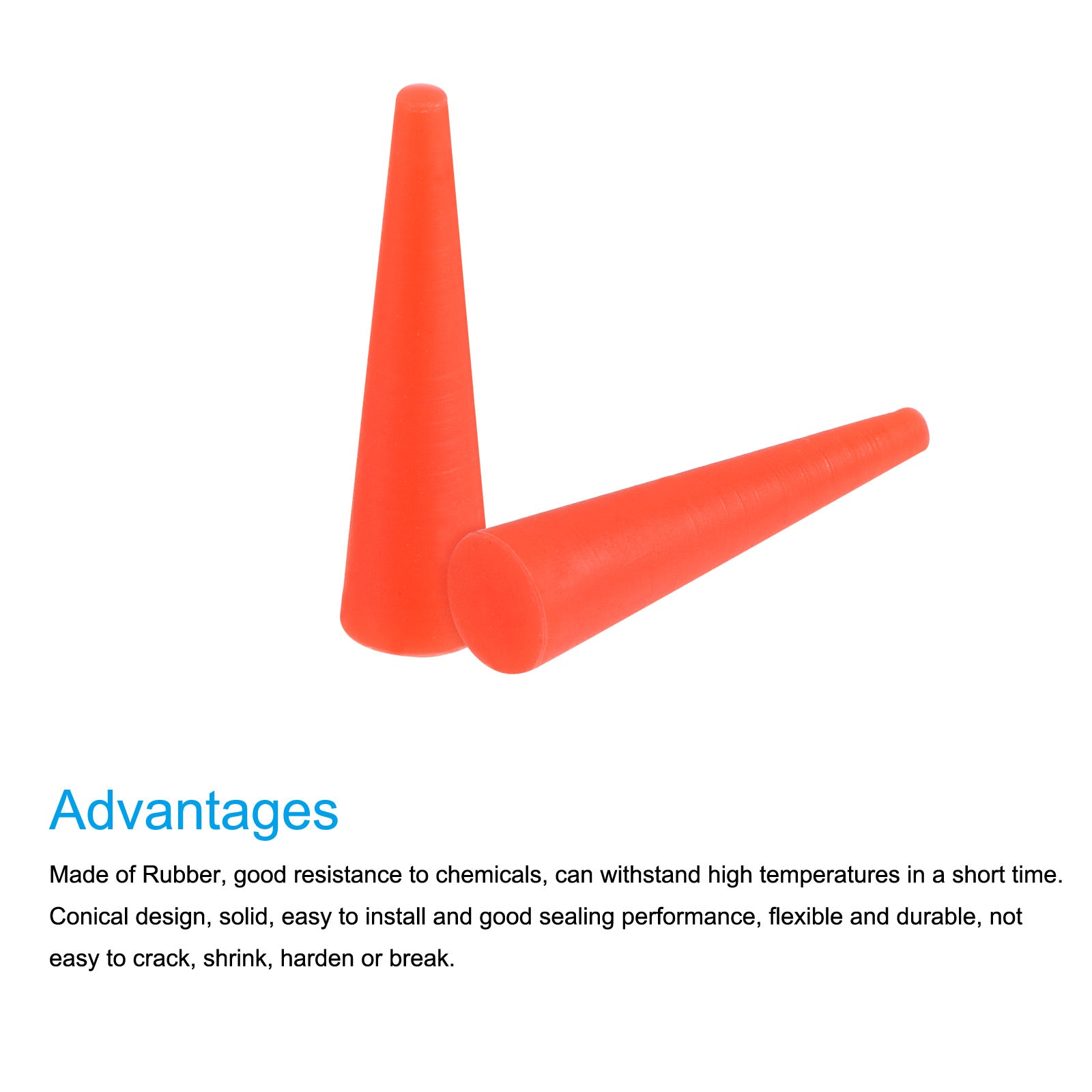 The tapered plug is in size of: Bottom Diameter: 1.5mm / 0.06"; Top Diameter: 3.5mm / 0.14"; Height: 16mm / 0.63"; In the package of: 30 x Silicone Rubber Tapered Plug