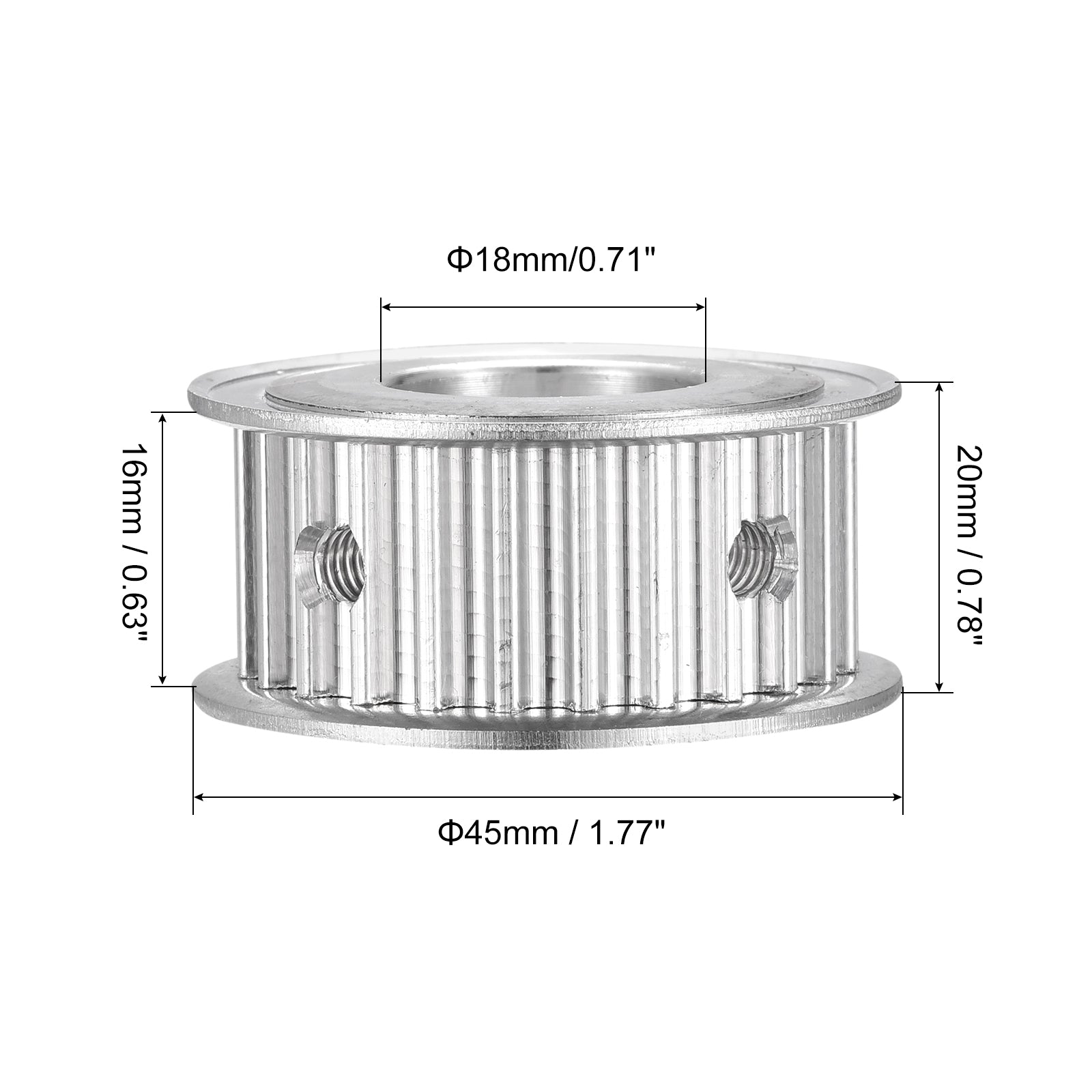 Package Content: 1pcs x Timing Pulley Wheel; Thread: M5*0.8; Teeth: 25T; Pitch: 5mm/0.19inch; Bore Diameter: 18mm/0.7inch; Max Diameter: 45mm/1.77inch; Total Height: 20mm/0.78inch; Slot Width: 16mm/0.63inch; Structure Type: Flat on Both Sides; Shaft Hole Shape: Round