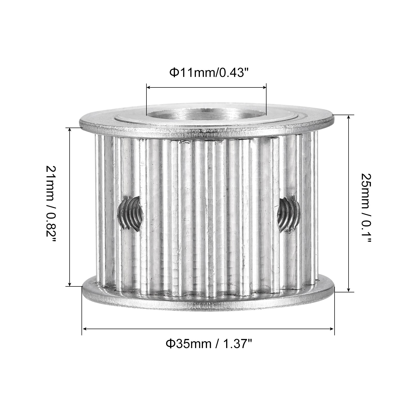 Package Content: 1pcs x Timing Pulley Wheel; Thread: M5*0.8; Teeth: 20T; Pitch: 5mm/0.19inch; Bore Diameter: 11mm/0.43inch; Max Diameter: 35mm/1.37inch; Total Height: 25mm/0.1inch; Slot Width: 21mm/0.82inch; Structure Type: Flat on Both Sides; Shaft Hole Shape: Round
