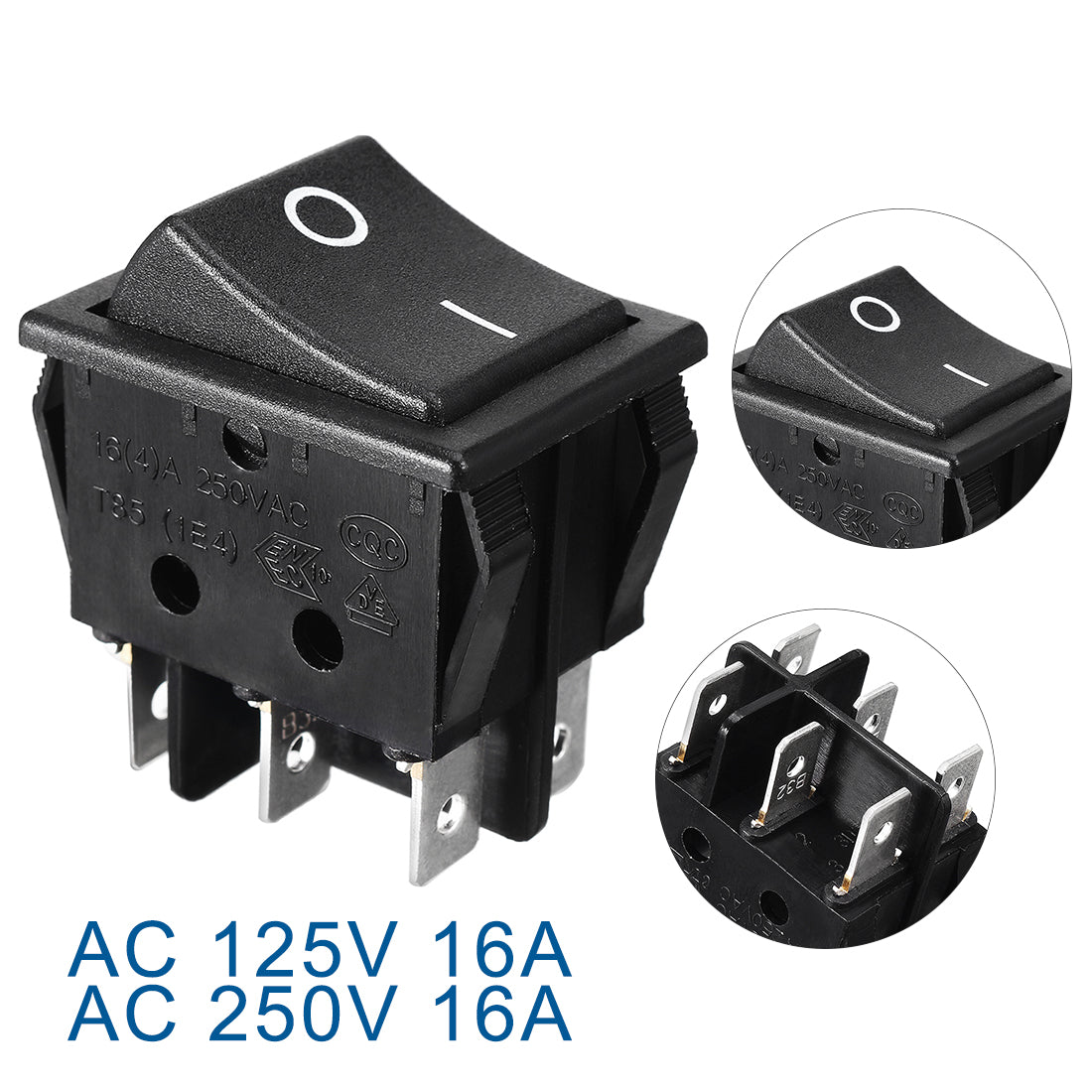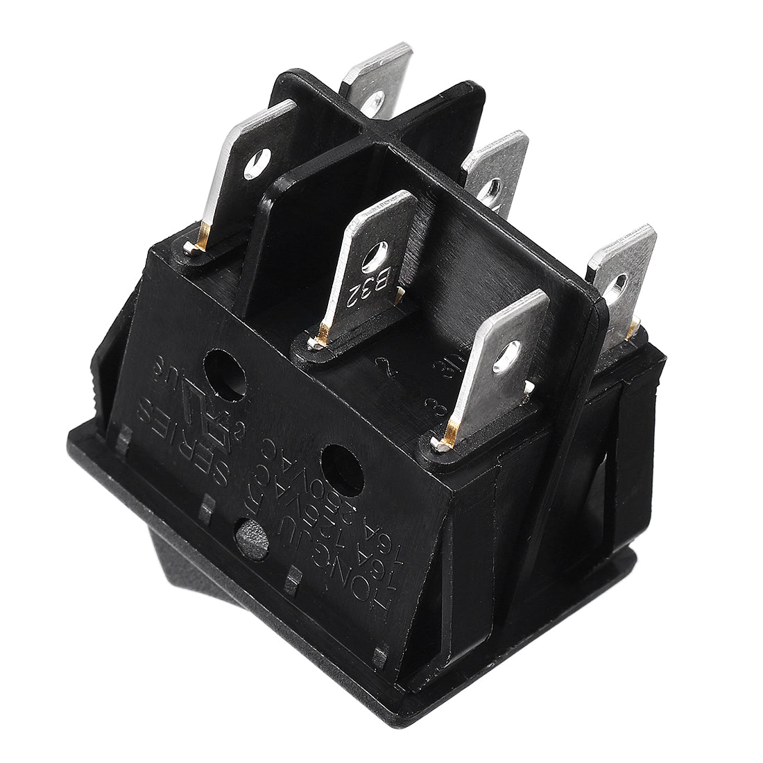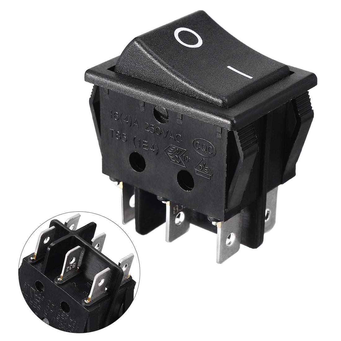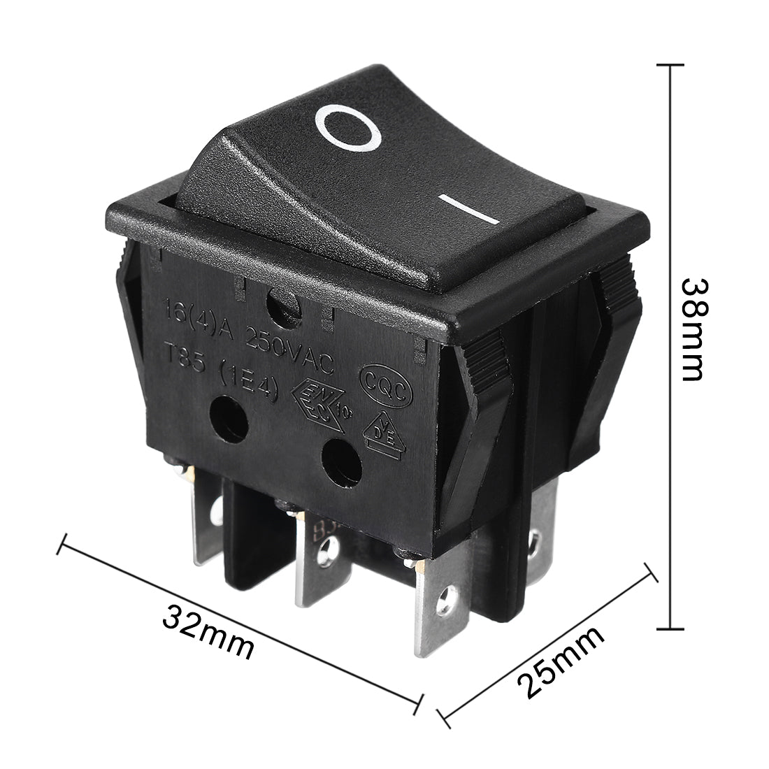 Product Name: Rocker Switch Pole and Throw: DPDT Terminal Quantity: 6 Position: On-Off Rated Voltage:AC 16A/250V(for resistive load only) Overall Size: 3.2 x 2.5 x 3.8cm / 1.26 x 0.98 x 1.5 inL * W * T) Mounting Size:30 x 21mm / 1.18 x 0.83inch(L*W) Color:Black Material:Plastic, Metal Package Content:1Pcs x Rocker Switch