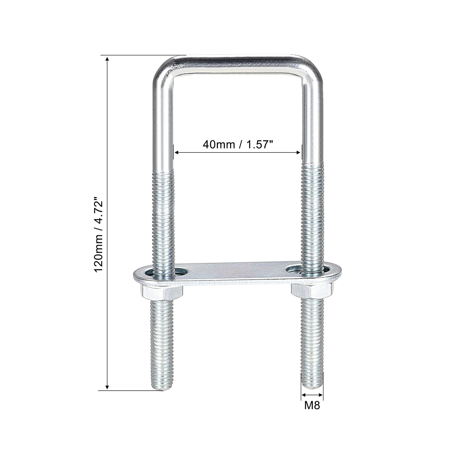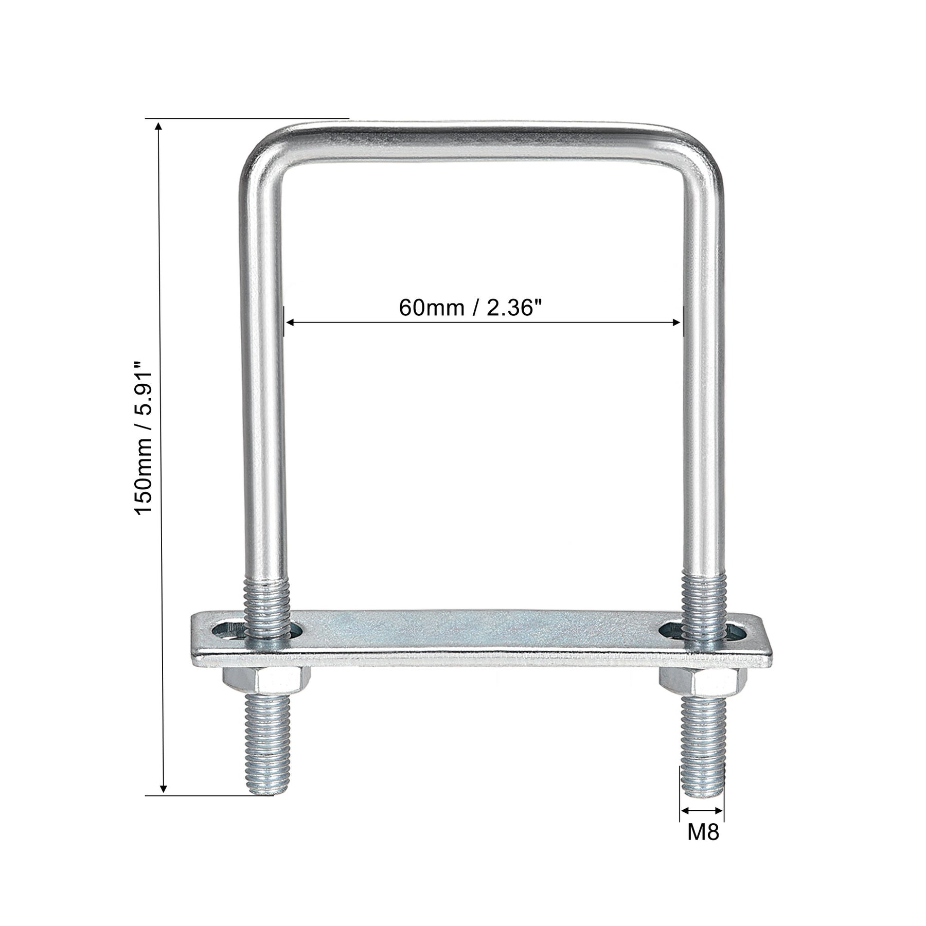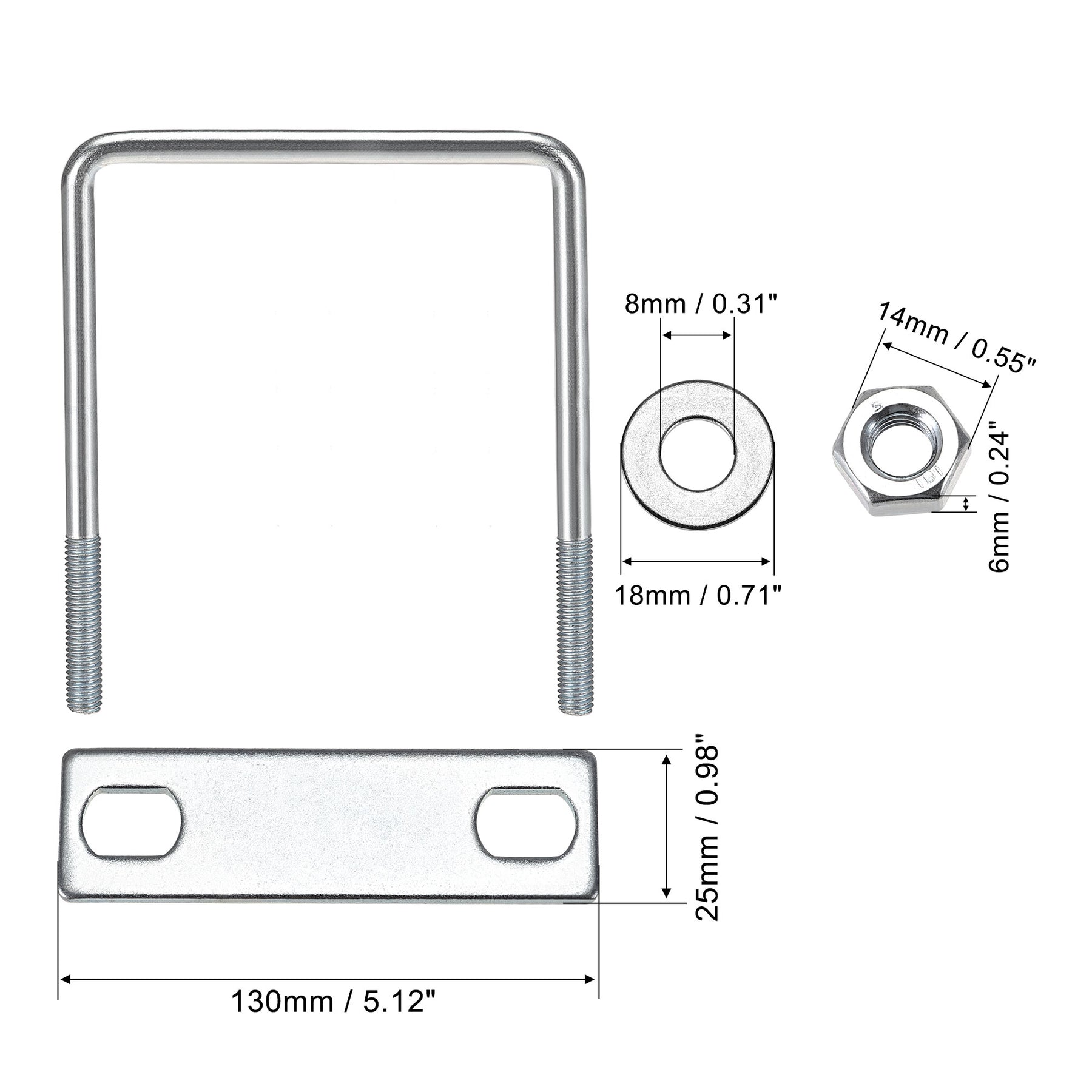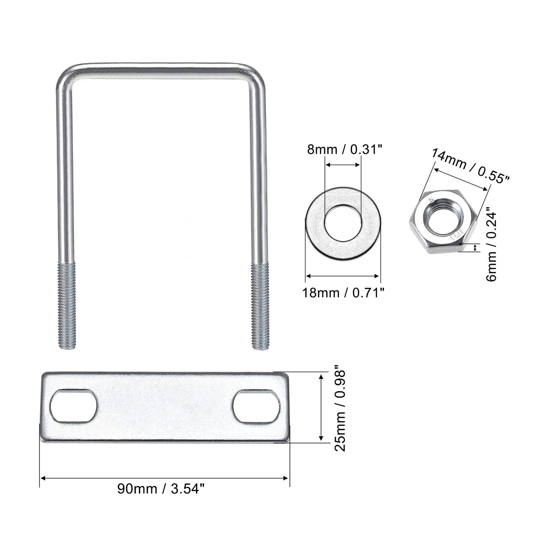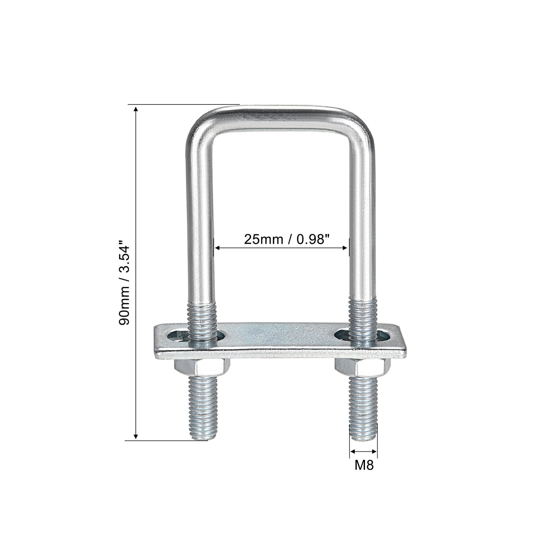 Specification: Product Name: U-Bolt Material: Carbon Steel Main Color: Silver Tone Thread Dia.: M8 Fit Square Rod Size: 25mm / 0.98" Rod Diameter: 7mm / 0.28" Total Length: 90mm / 3.54" Hex Nut Size: 14 x 6mm / 0.55" x 0.24"(Hex Width*H) Frame Plate Size: 62 x 25 x 3mm / 2.44" x 0.98" x 0.12"(L*W*T) Round Washers Size: 18 x 8 x 1mm / 0.71" x 0.31" x 0.04"(OD*ID*T)