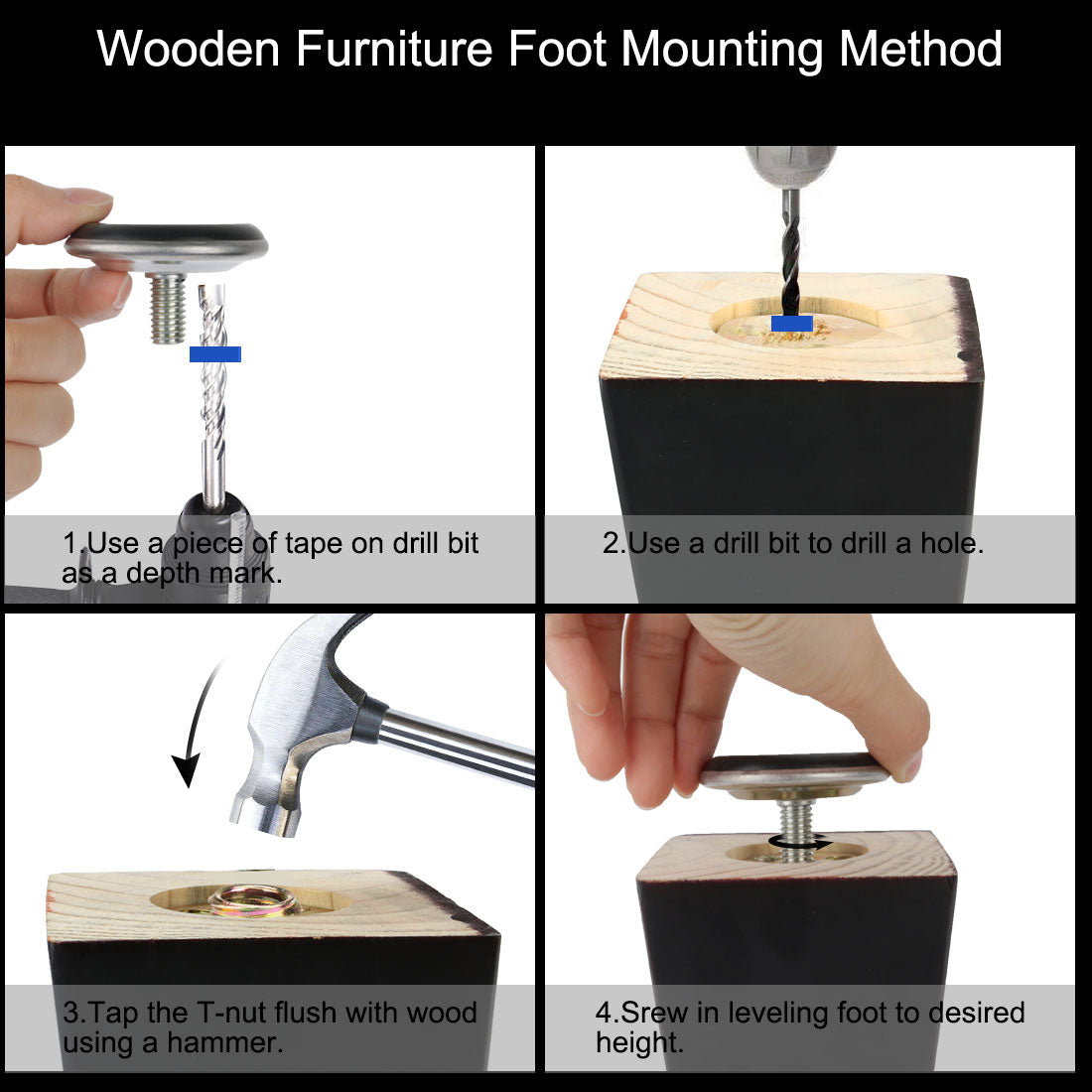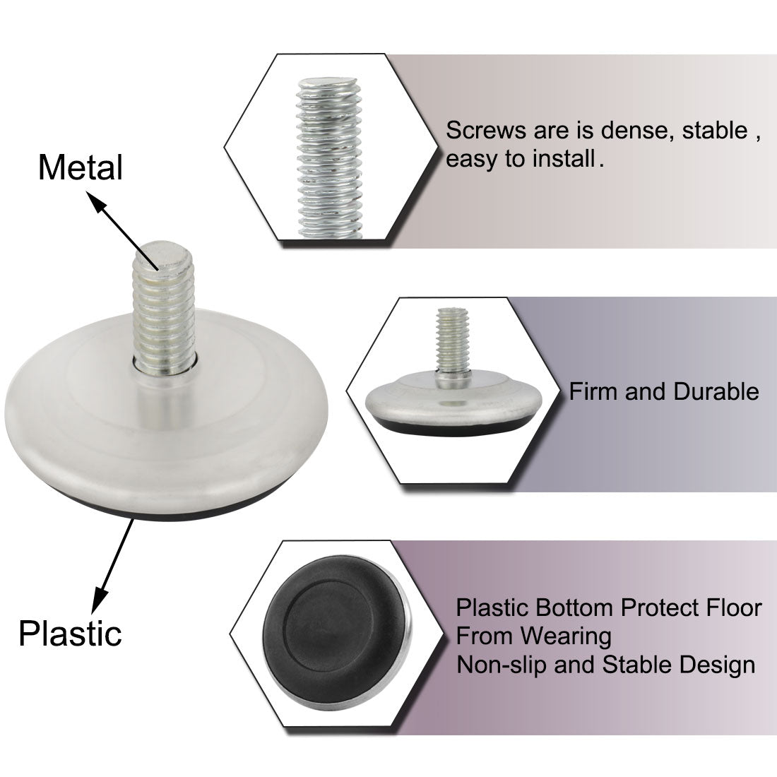 The Leveling Foot is for office or household light duty furniture with threaded sockets. Plastic round base design will do no harm and scratches to your floors. Easy to install of it and adjustable height as your require. This Furniture Glide Leveler is typically used on conference room tables, heavier desks, restaurant furniture and point of purchase display racks. If the range of the nut size is 8.4-8.8mm/0.33 Inch-0.35 Inch, you can use these leveling feet to install your furniture feet.