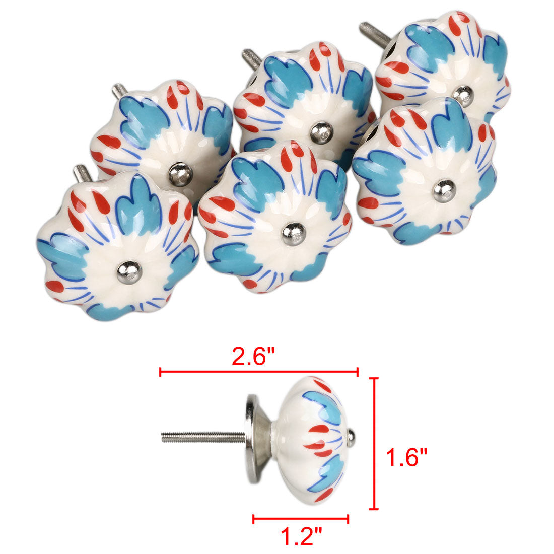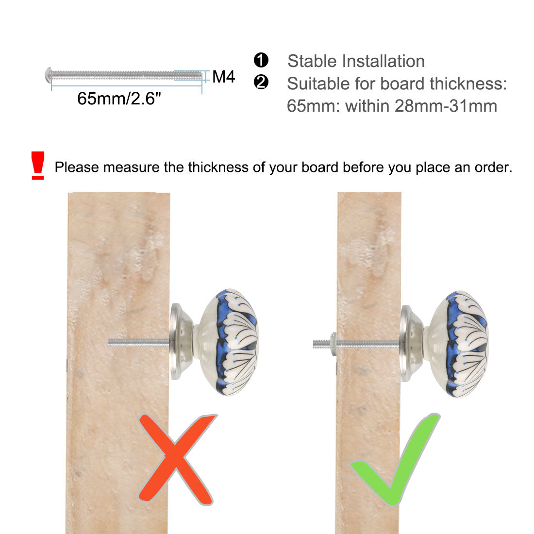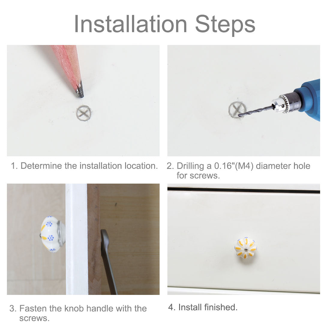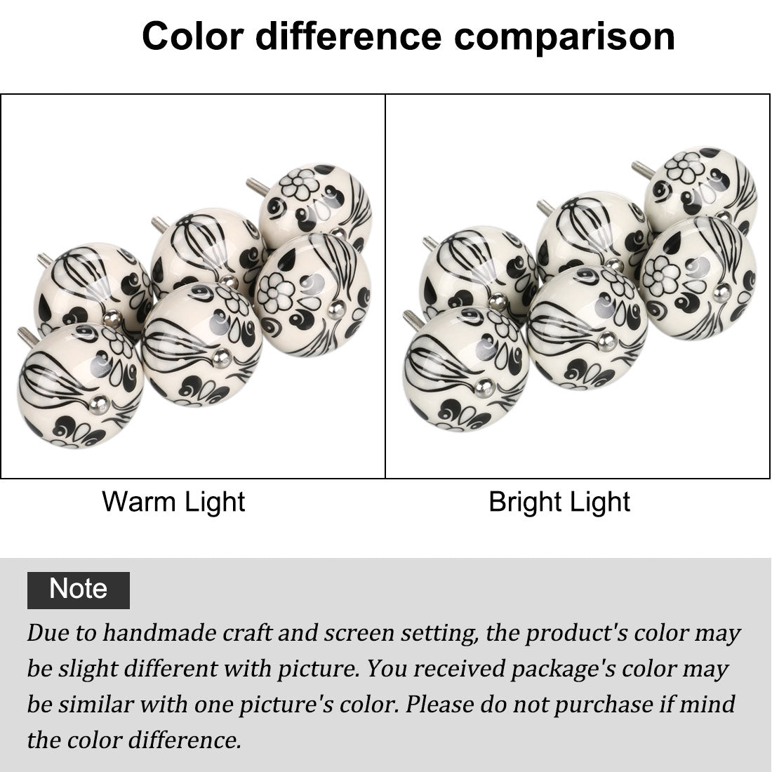 Description:The India pretty handmade or painted ceramic floral knobs are preferred for a drawer, cabinet, cupboard, wardrobe, door etc. Specification:Material: Ceramic, Aluminium AlloyKnob Diameter: 40mm/1.6 InchKnob Height(After Installation): 30mm-35mm/1.2 Inch-1.4 InchScrew Size : 65 x 7mm/2.6 Inch x 0.3 Inch(L*Max.D)Thread Dia: 4mm/0.16 InchEasy to fit - each knob comes with washers and nut fasteners.25 designs are available.Color: Cattleya, Robinia Idaho, Gazania, Maple Leaf, Vines, Five-pointed Star, Crinum Asiaticum, Mixed Color #1, Purple Tillandsia, Delphinium Anthriscifolium Hance, Mixed Color #2, Chilli, Zephyranthes Grandiflora, Snowflake, Black Tillandsia, Blue and White Banana Leaf, Blue and White Flower, Peony, Orange Flower, Pachira Macrocarpa, Pink Branches, Mixed Color #3, Mixed Color #4 Package Content:1 x Knob with Fittings or 6 x Knobs with Fittings :If there is any other problem, please email us at any time, we will provide you the best solution as soon as possible. Notice:1. Please allow 1-3mm error due to manual measurement.2. The colors may have a little bit different due to screen display or light.